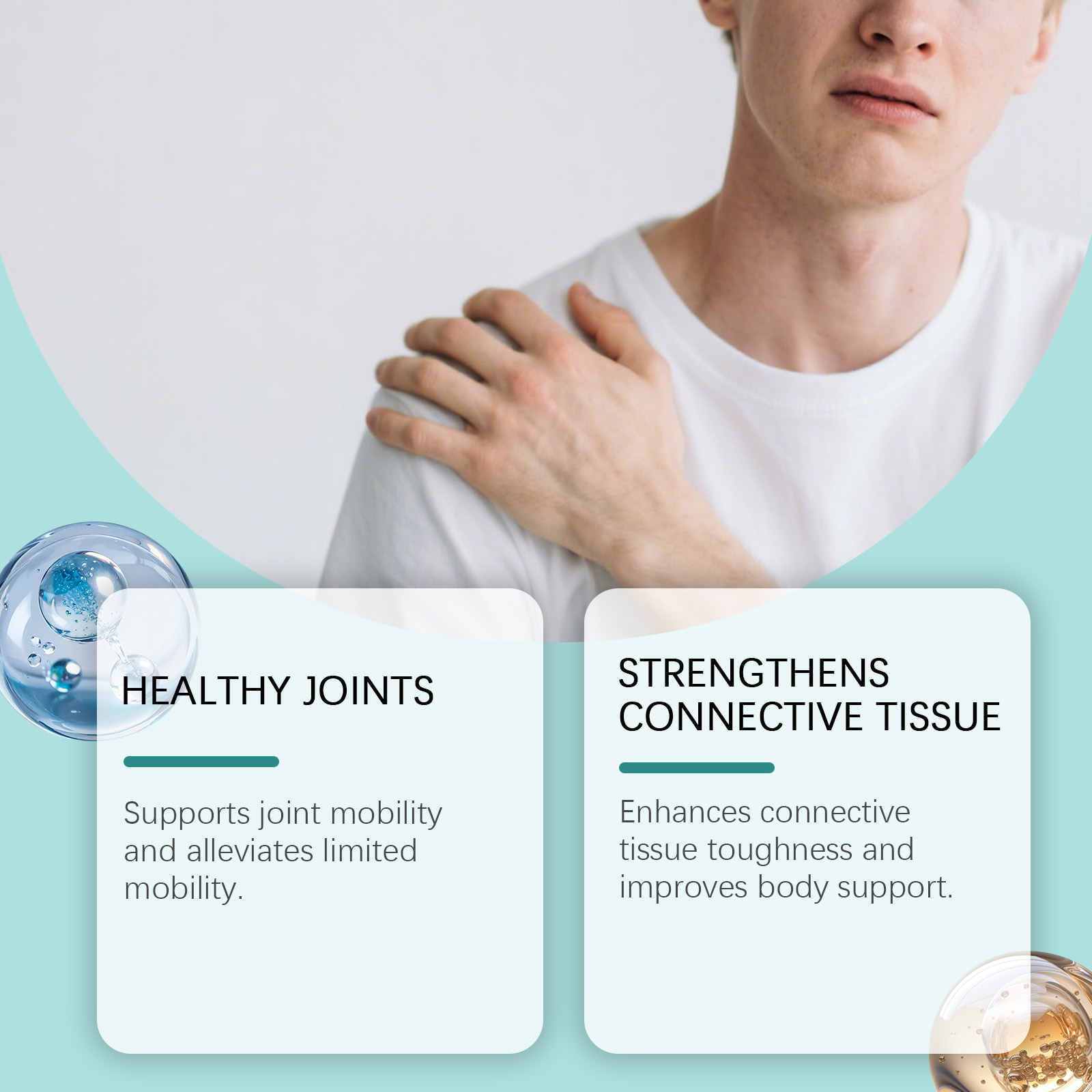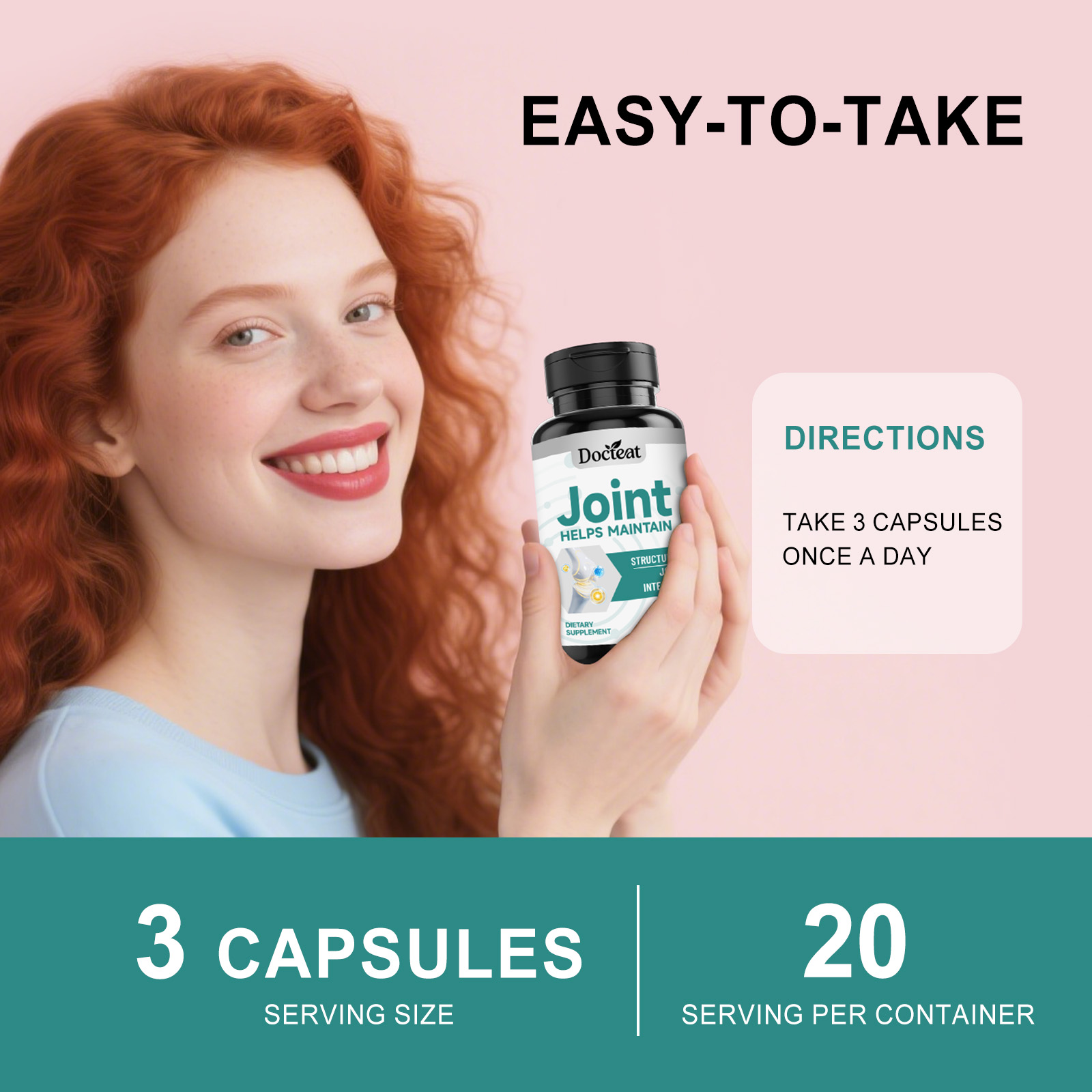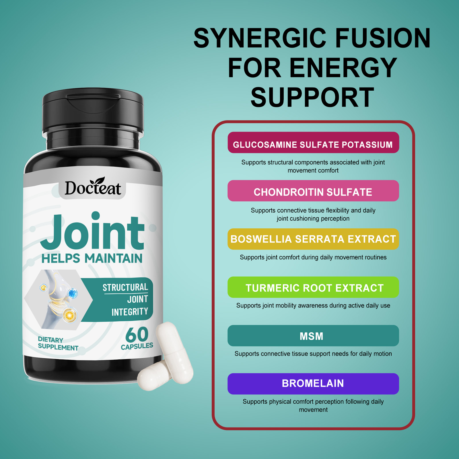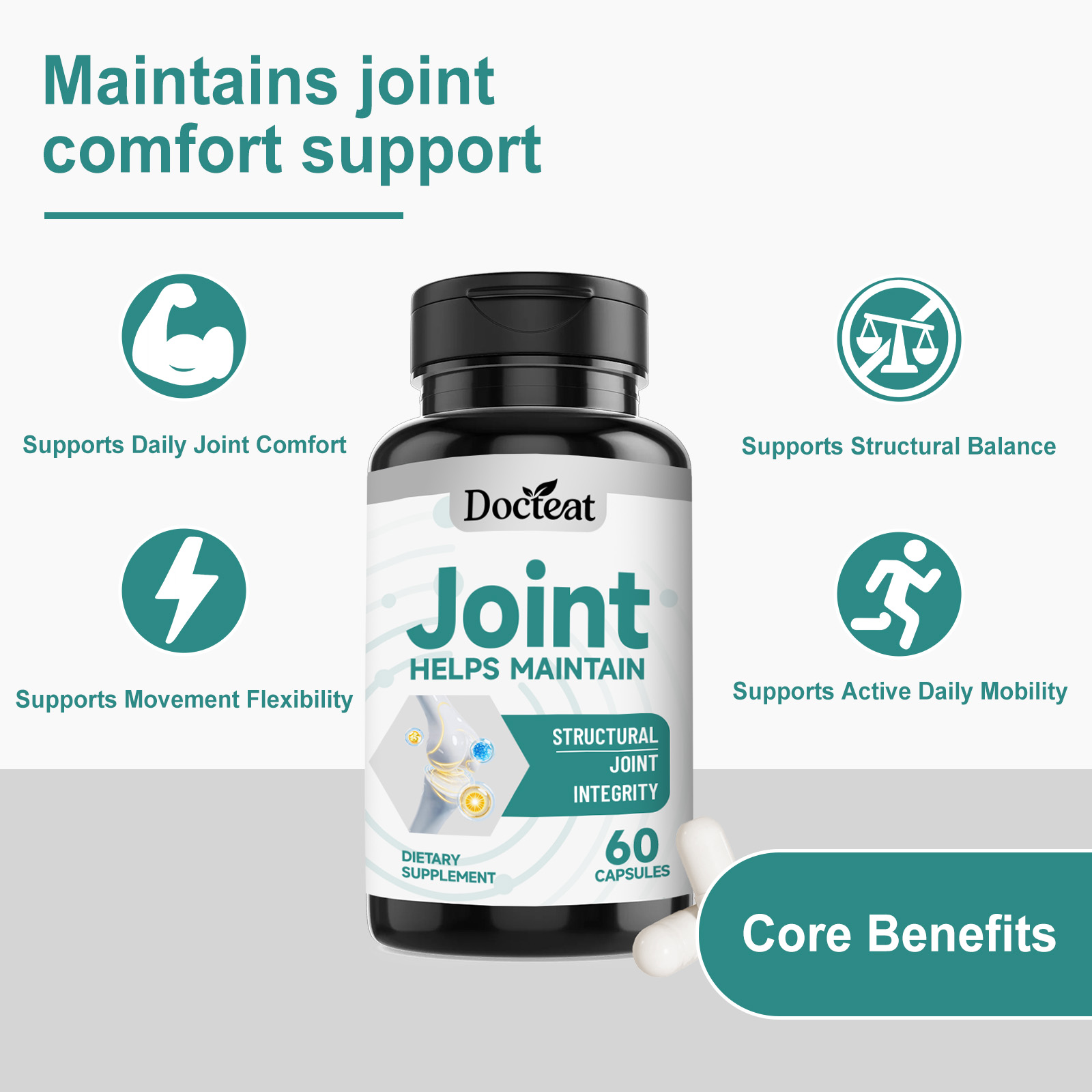 我们的关节健康支持胶囊,由硫酸氨基葡萄糖钾、硫酸软骨素精心调配而成。专为支持与关节活动舒适度相关的结构基础设计。使用方法极为便捷:每天一次,每次3粒。并且它可以支持结缔组织灵活度与关节缓冲感受。