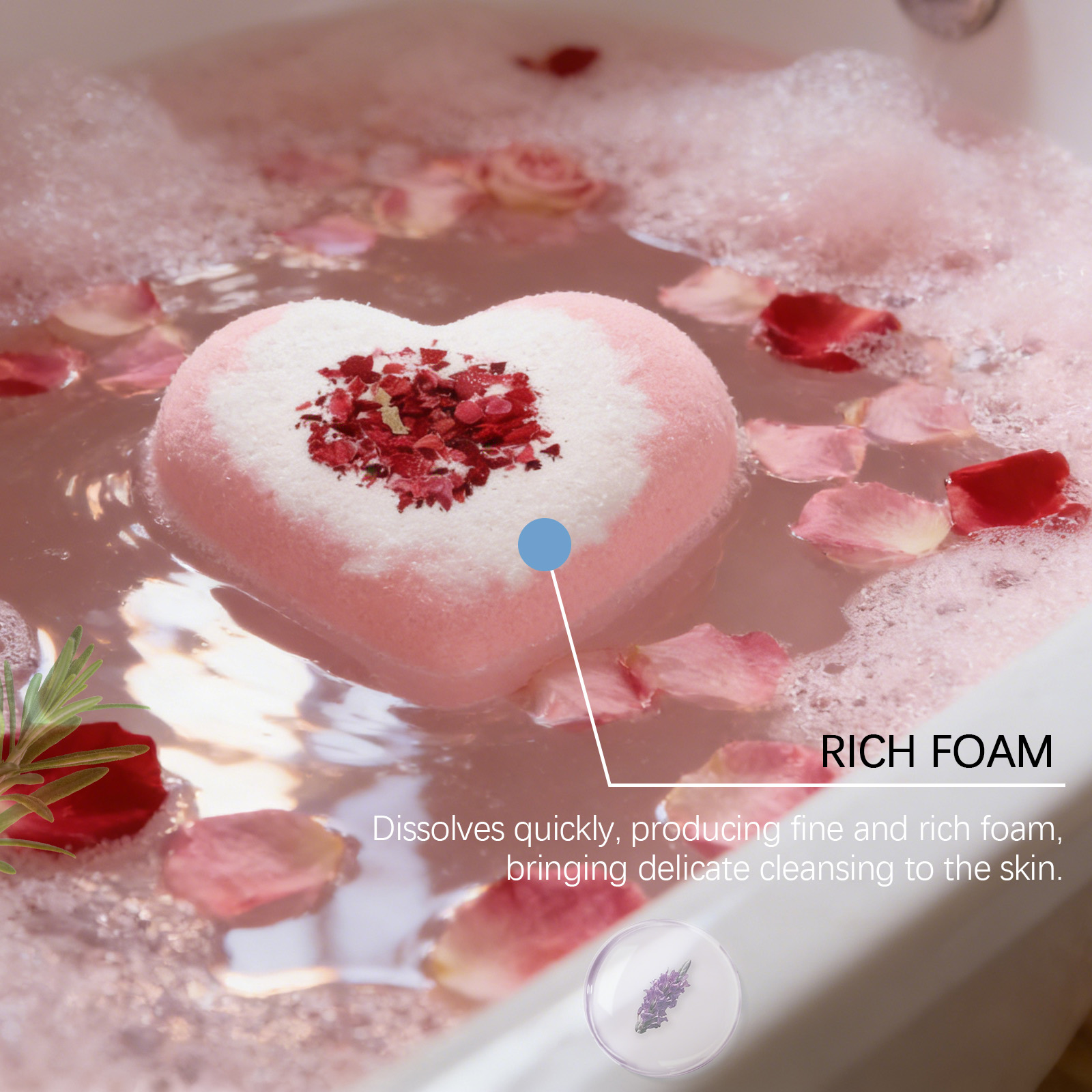 我们的玫瑰爱心浴盐泡泡球,由棕榈油酸钠、甘油硬脂酸酯精心调配而成。专为改善清洁效果,去除皮肤表面的杂质设计。使用方法极为便捷:在浴缸中加入温水后将心形肥皂完全放入水中,并等待其溶解并产生气泡后再进行沐浴。如果使用淋浴,将肥皂放在水流区域的淋浴区,并在香味释放后享受您的沐浴。并且它可以增强皮肤水分并提供持久保湿。