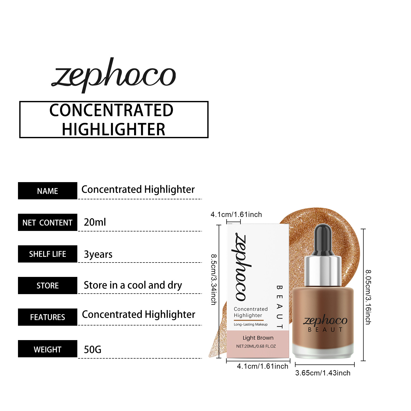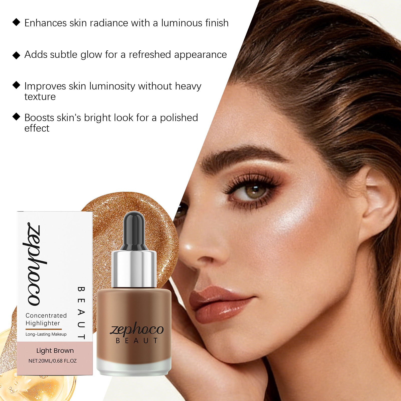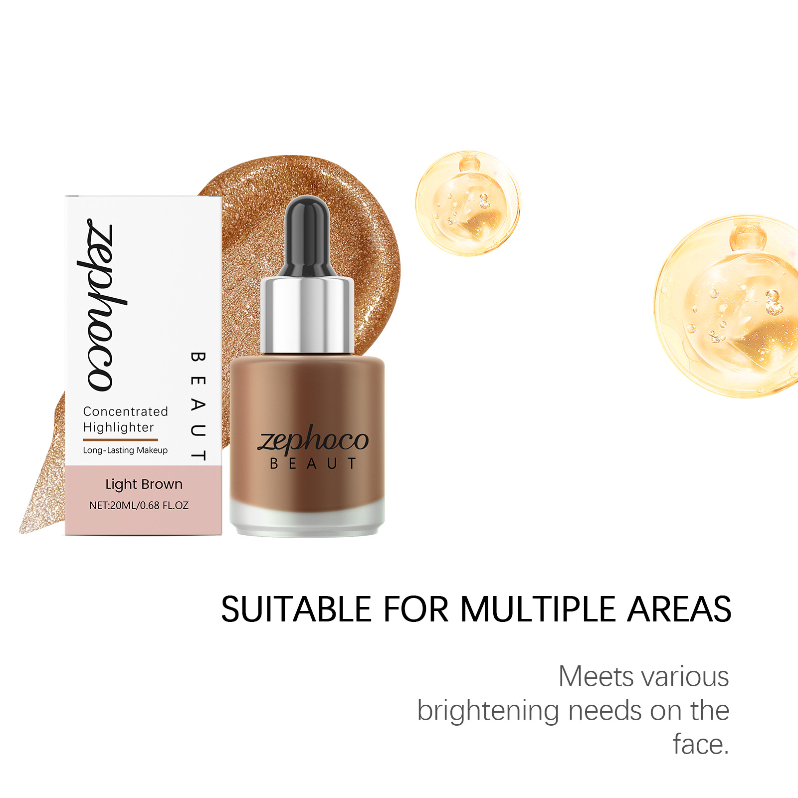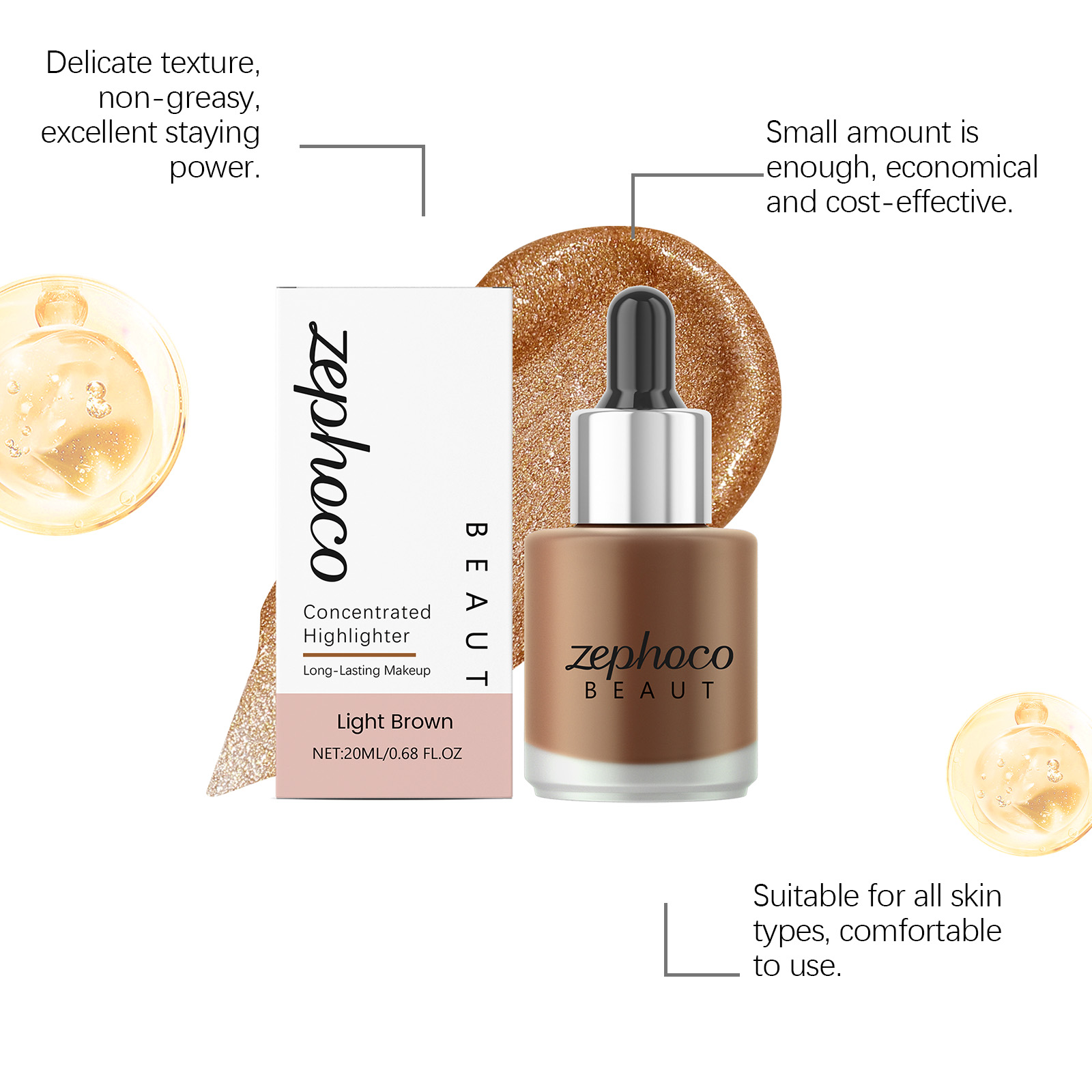 我们的浅棕色浓缩高光提亮液,由矿油、棕榈酸乙基己酯精心调配而成。专为使皮肤呈现半透明和发光的光泽,感觉轻盈,不会结块设计。使用方法极为便捷:1. 完成底妆后。2. 取适量本产品涂抹于需要提亮的面部区域。3. 用化妆刷或粉扑轻轻晕染均匀。并且它可以快速粘附且不会结块。
