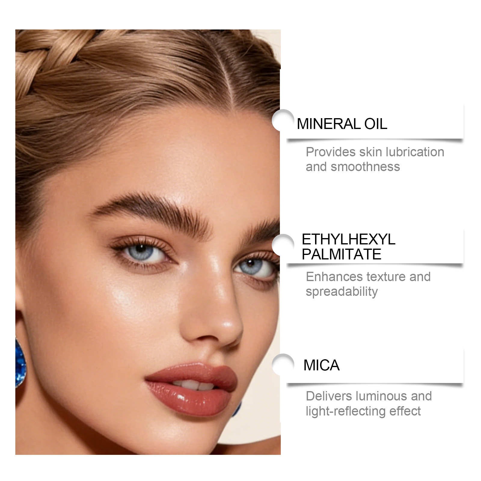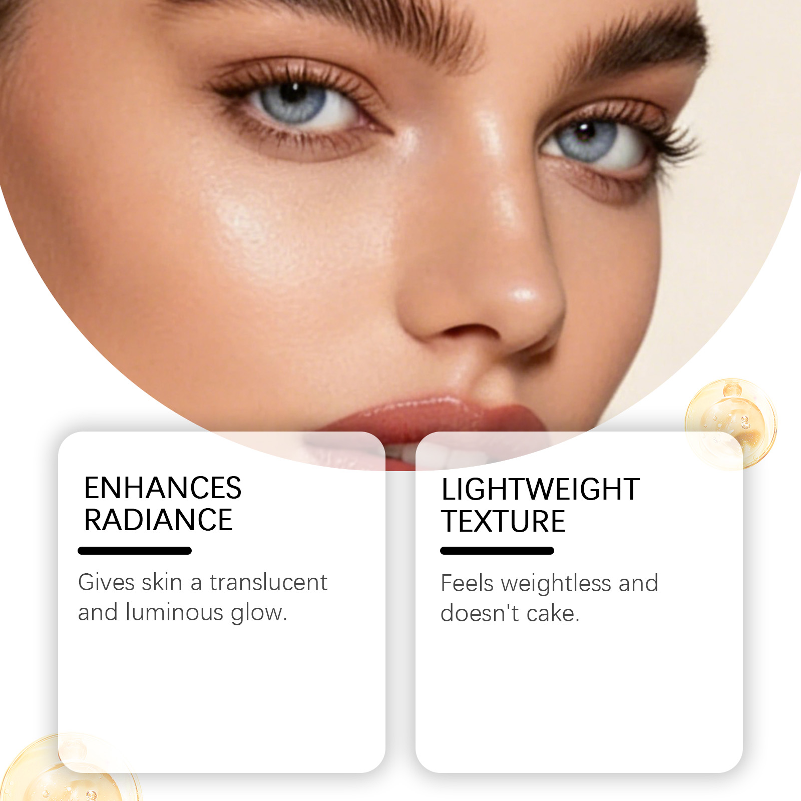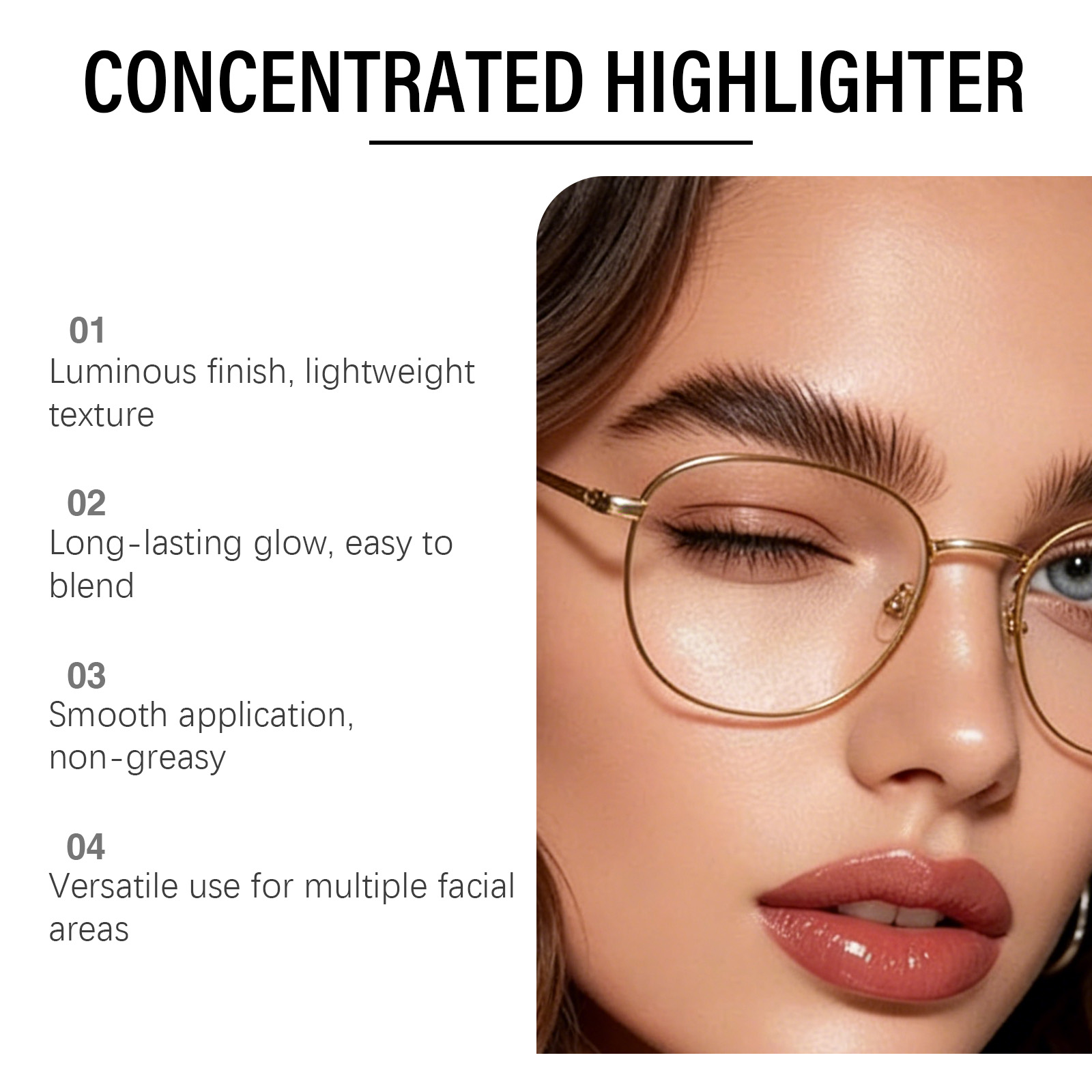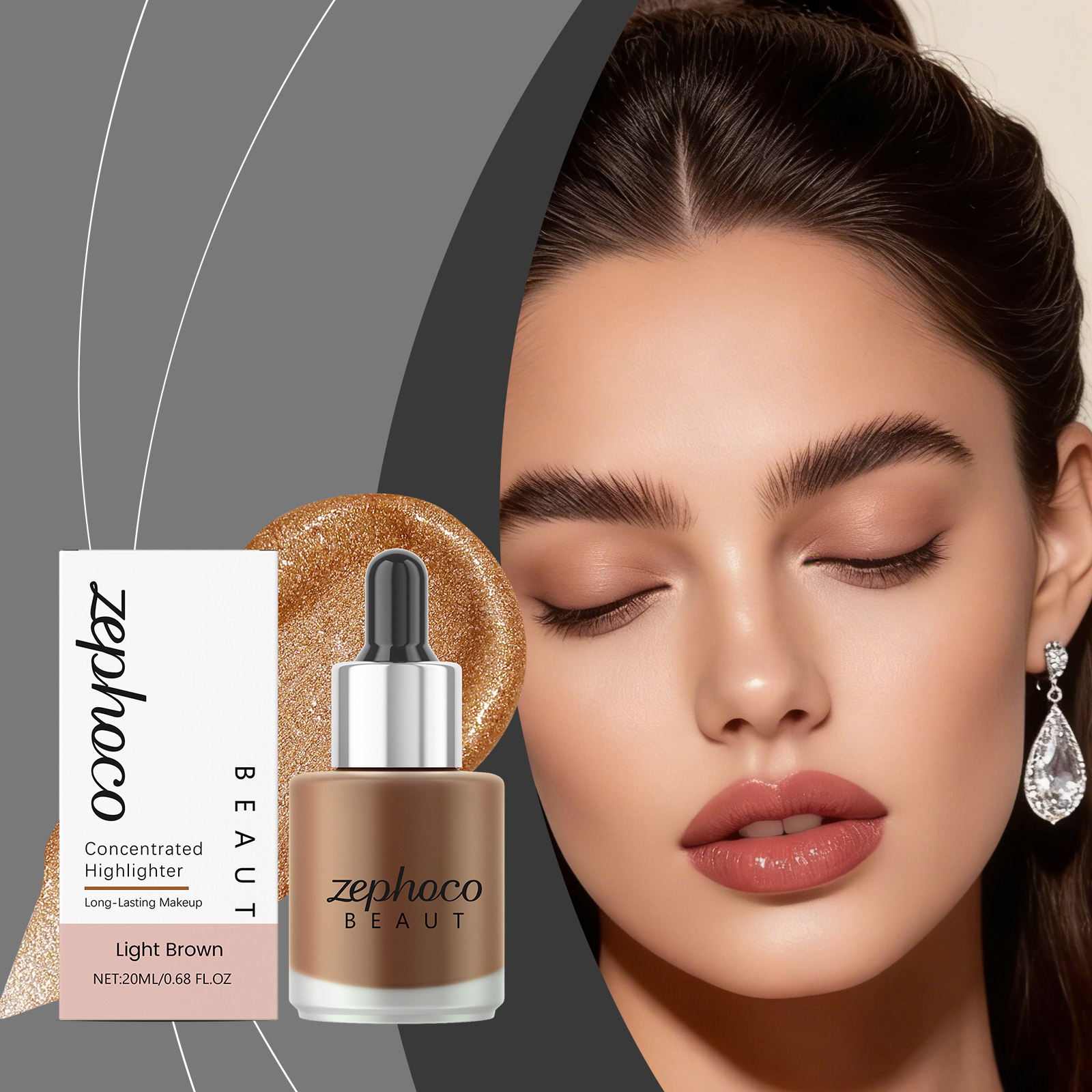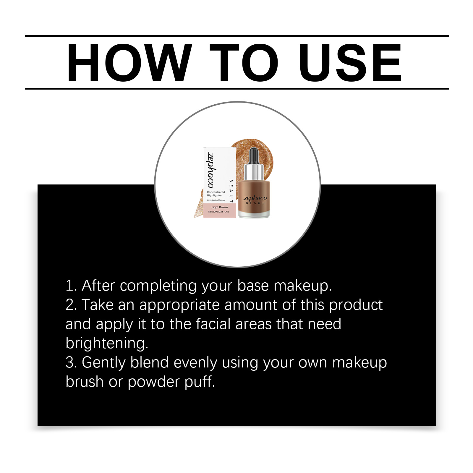 我们的浅棕色浓缩高光提亮液,由矿油、棕榈酸乙基己酯精心调配而成。专为使皮肤呈现半透明和发光的光泽,感觉轻盈,不会结块设计。使用方法极为便捷:1. 完成底妆后。2. 取适量本产品涂抹于需要提亮的面部区域。3. 用化妆刷或粉扑轻轻晕染均匀。并且它可以快速粘附且不会结块。