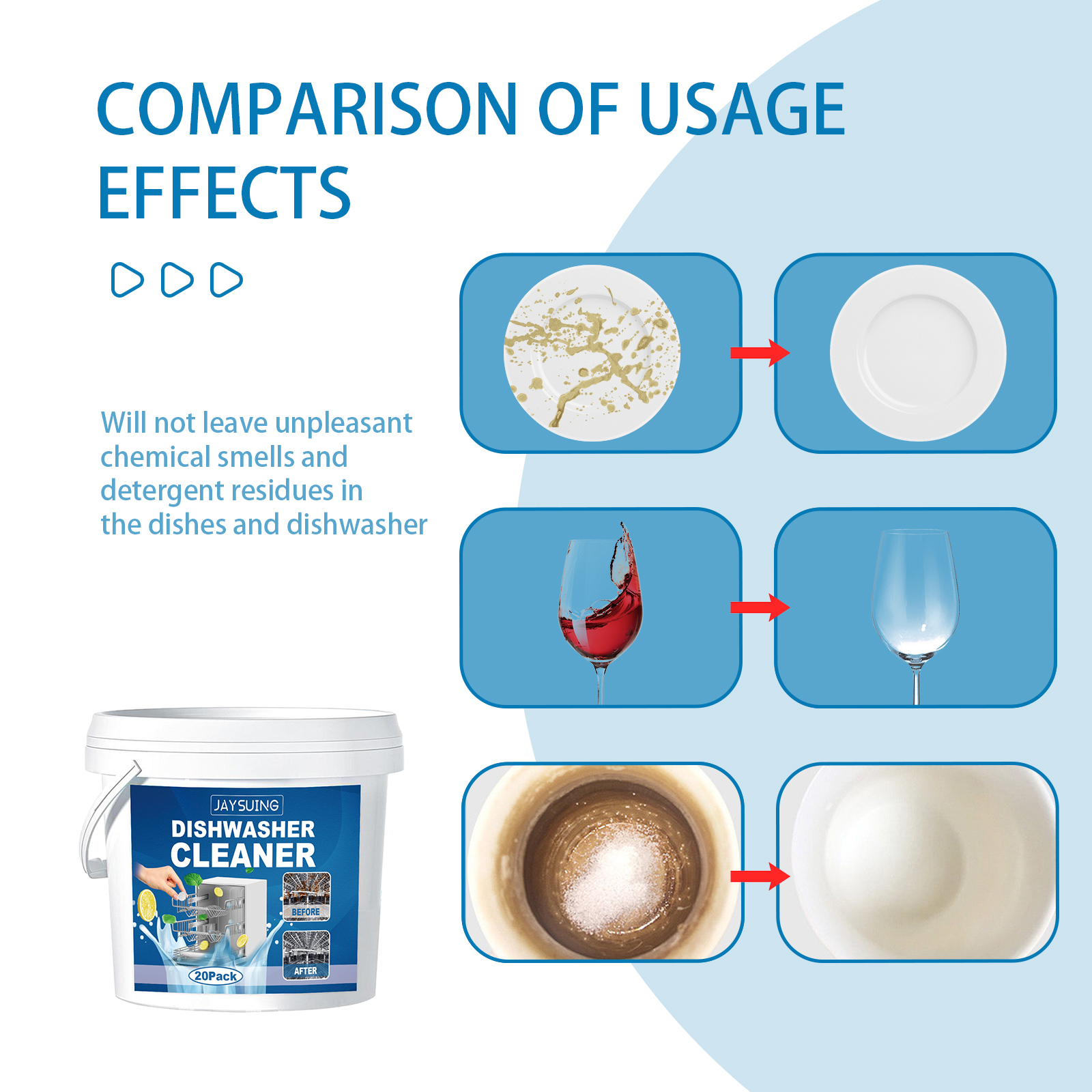 我们的洗碗机清洁片含有小苏打、柠檬提取物、橙皮提取物。它可以清洗洗碗机的所有部件,即使是看不见的部件,也不能自己清洗,让污垢无处可逃。它的使用方法很简单:清空洗碗机,放一个泡腾剂将药片放入洗碗机,启动自洁模式,清洗2小时。并且可以清洁厨房。