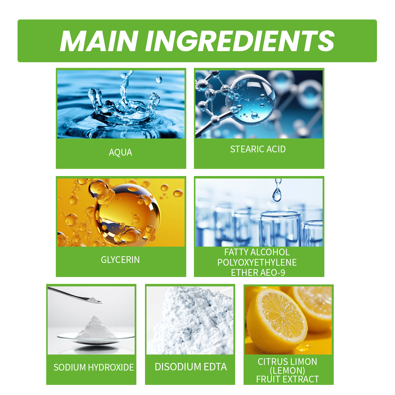 我们的多功能厨房清洁乳含有硬脂酸、甘油。它可以帮助快速去除油渍、污垢和水垢等顽固污渍,使您的清洁工作更加轻松,能够清洁家具的每一个角落,如厨房、浴室、地板等,有助于节省您的能源。它的使用方法很简单:将适量本品挤在需要清洁的物体表面来回擦拭,最后用清水冲洗干净即可。可以清洁的同时不会对表面造成损伤,提高了整体环境的舒适度,用于各种表面,包括炊具、炉灶、电器等,是您所有清洁需求的理想选择。