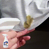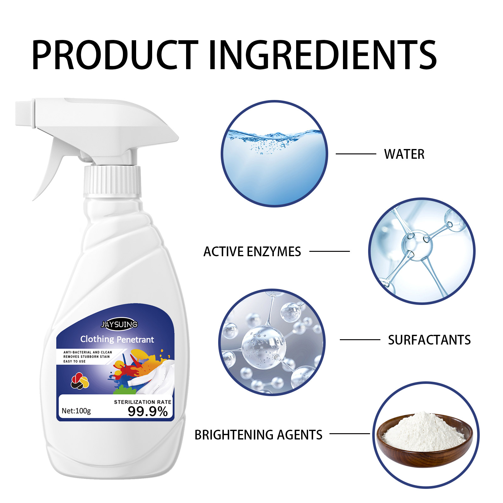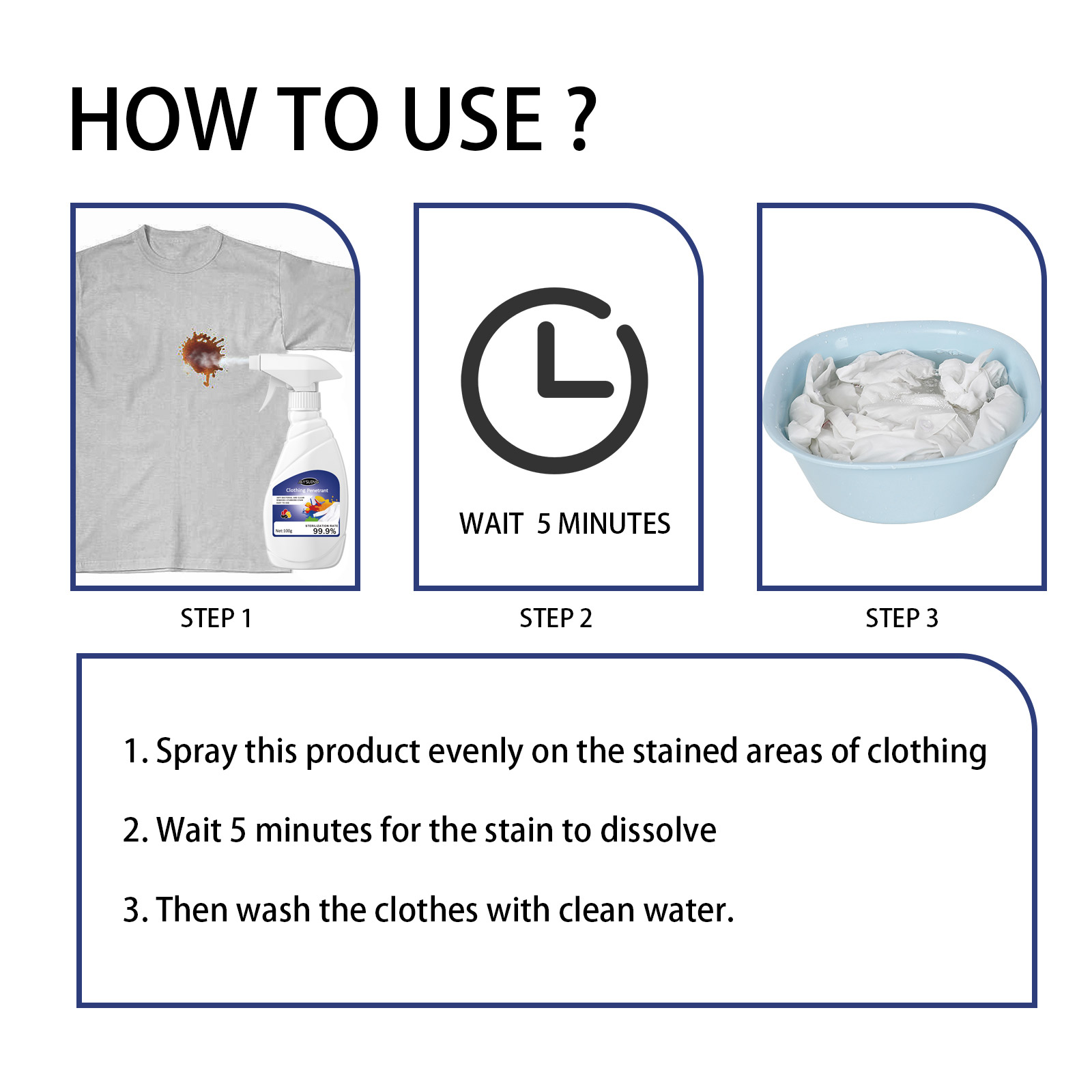 我们的衣服油渍清洁剂含有活性酶、表面活性剂、亮白剂。它可以有效去除衣物上的顽固污渍。它的使用方法很简单:将本品均匀喷于衣物污渍处。等待5分钟让污渍溶解。然后用清水洗衣服。不伤害衣服和手,保护您的健康和衣物质量。