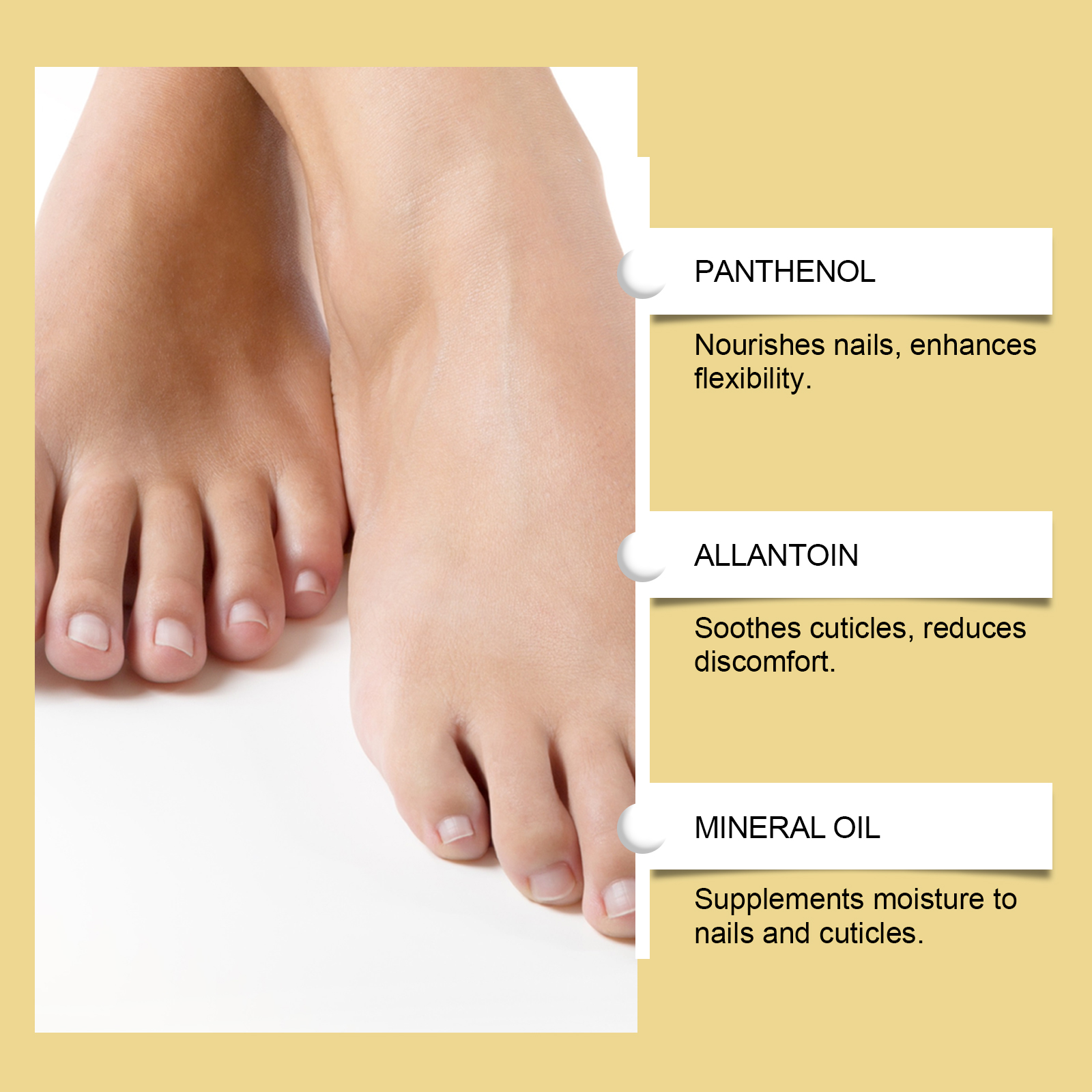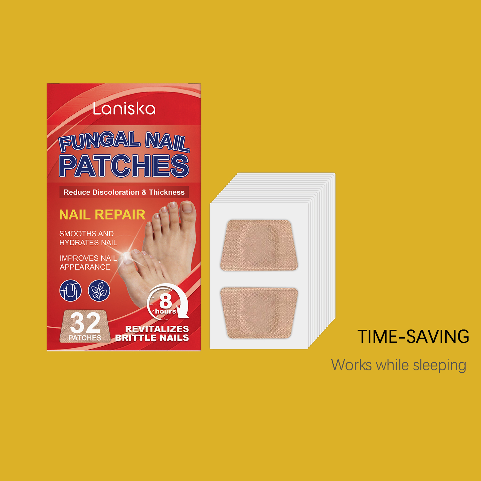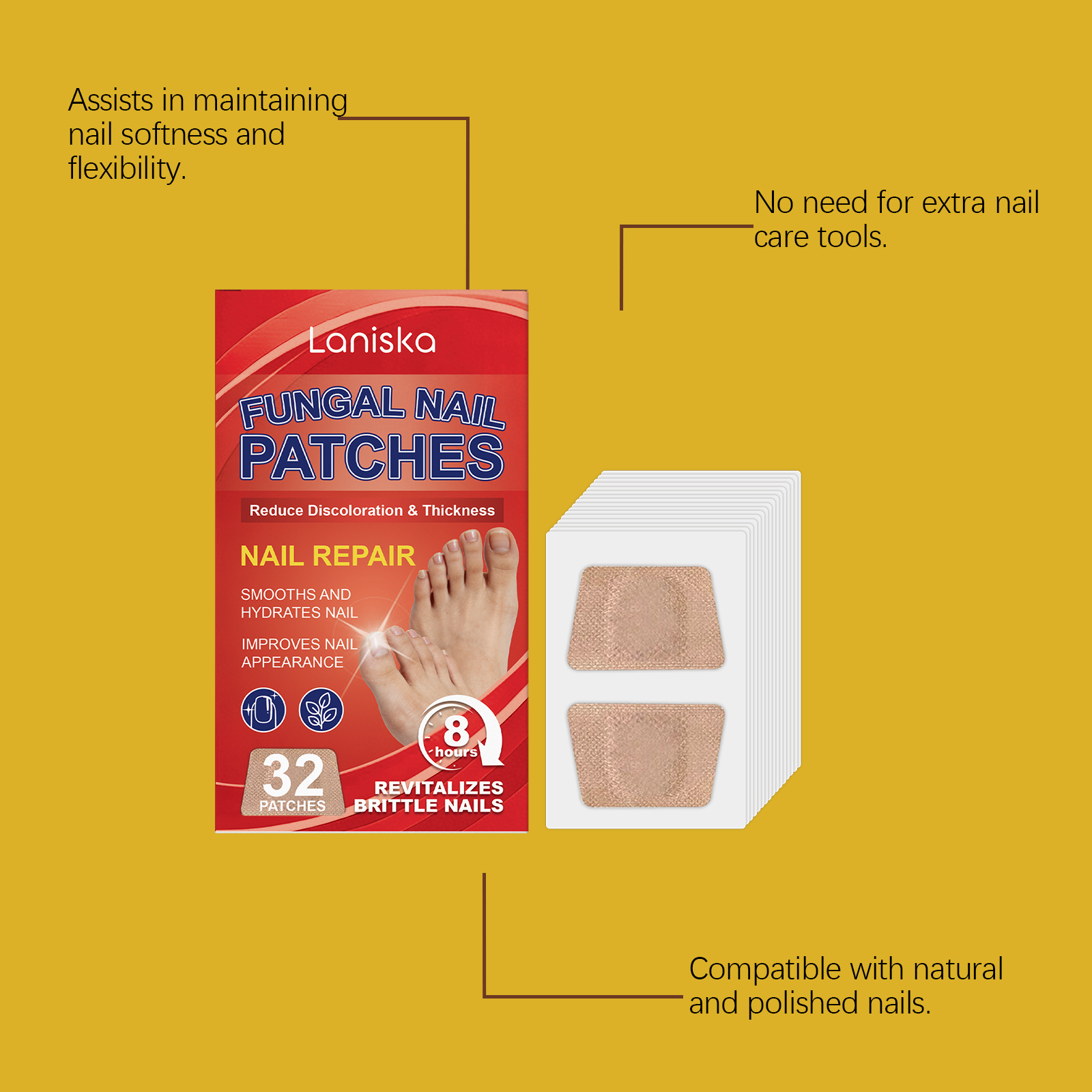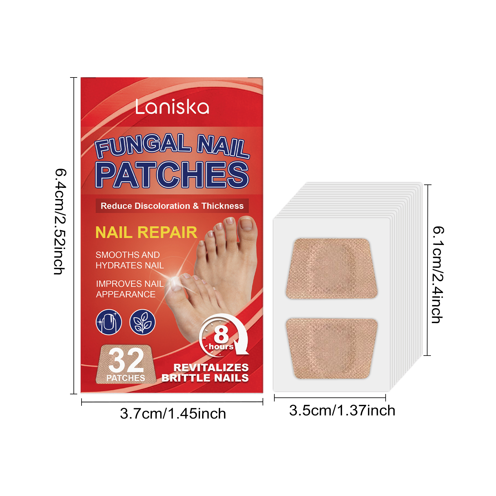 我们的指甲护理贴,由蛇床果提取物、茶叶油精心调配而成。专为支持健康的指甲纹理设计。使用方法极为便捷:1.睡前彻底清洁并擦干脚趾甲。2.撕掉保护膜,将贴片贴在脚趾甲上,并轻轻按压以确保牢固贴合。3.醒来后或8小时后,轻轻撕下。并且可以缓解指甲周围轻微不适。