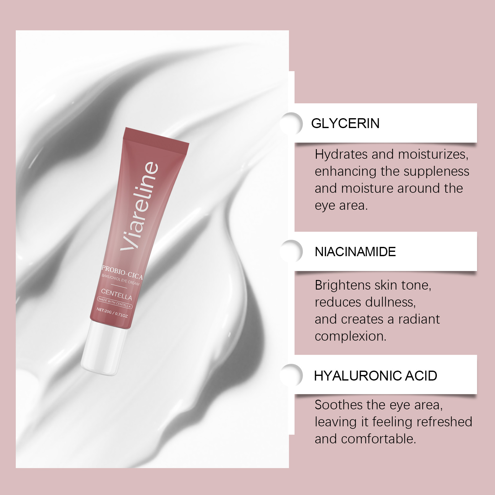 我们的滋润眼霜,由补骨脂酚、积雪草提取物精心调配而成。专为缓解眼部暗沉,使眼周区域焕发光泽设计。使用方法极为便捷:1.清洁皮肤并拍干。2.将适量本产品均匀涂抹于眼部肌肤。3.轻柔按摩至完全吸收。并且可以持久保湿和滋润,缓解干燥和不适。
