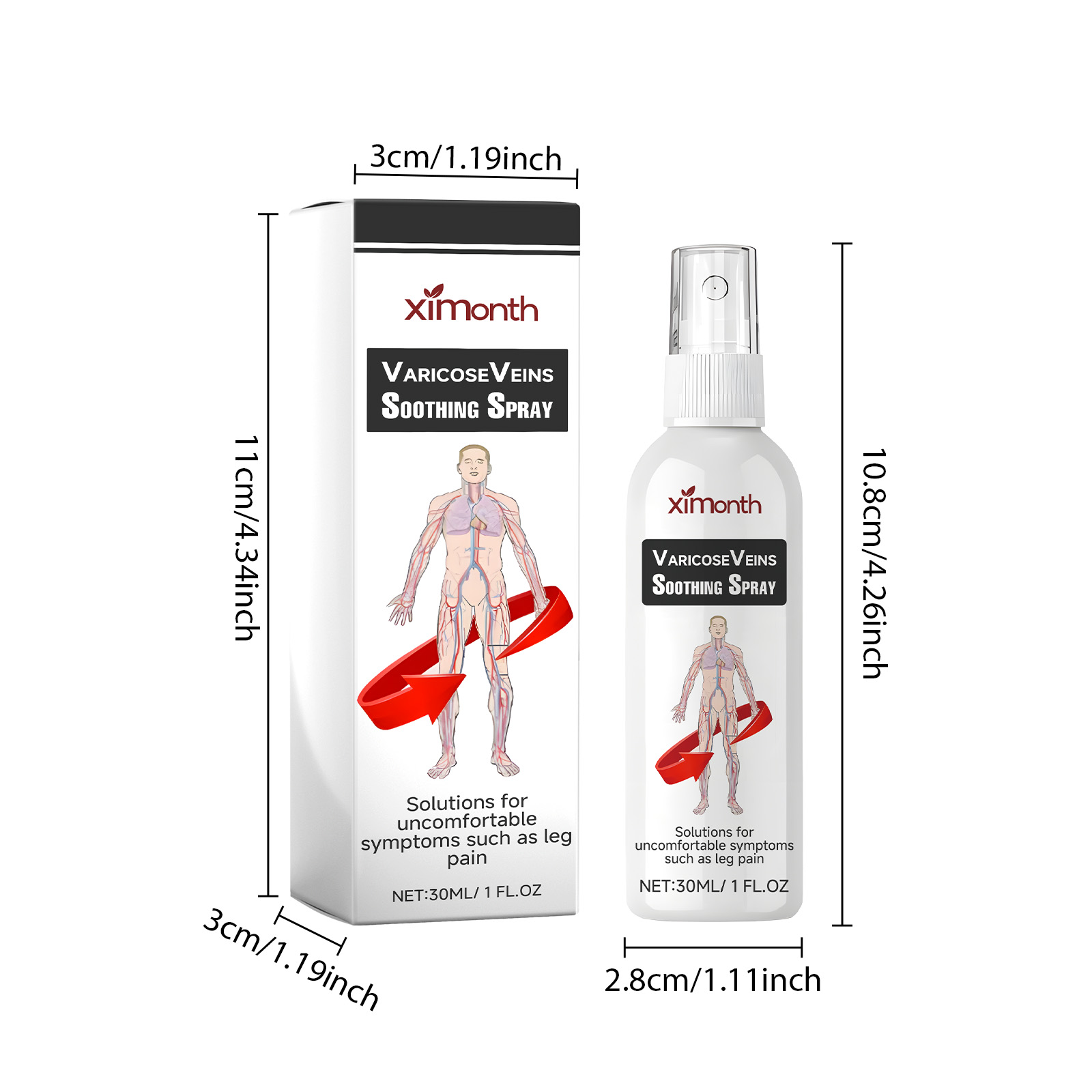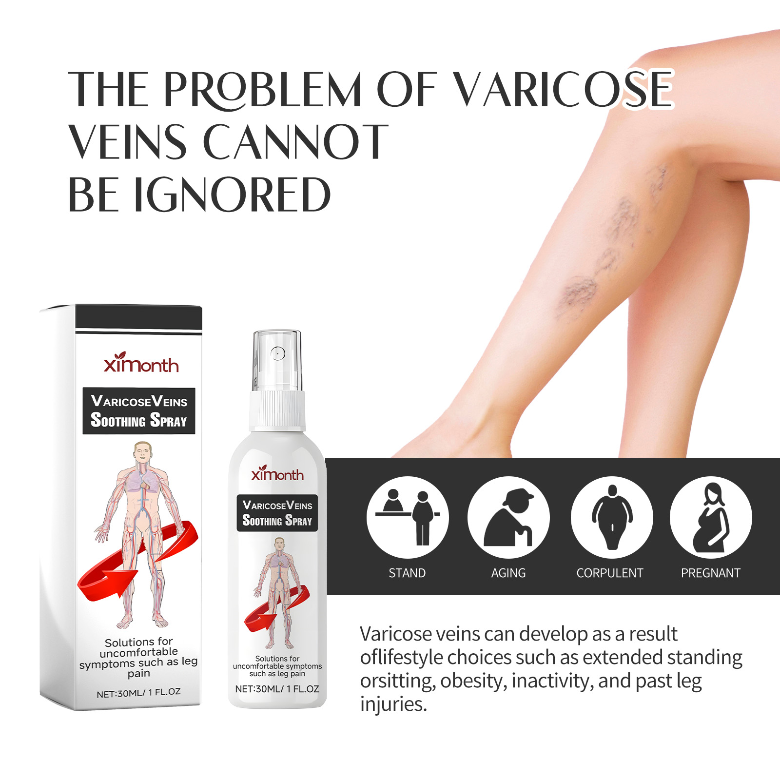 我们的静脉喷雾含有红花提取物、七叶树提取物、积雪草提取物。它可以帮助减少静脉曲张,恢复腿部皮肤的光滑度,使腿部更加舒适,缓解肿痛,有效滋润舒缓肌肤,促进腿部血液循环。它的使用方法很简单:按1-2泵的喷雾,均匀地分布在皮肤上,用手轻轻打圈按摩15分钟,帮助吸收即可。有效缓解静脉曲张的疼痛,减少静脉曲张的出现。