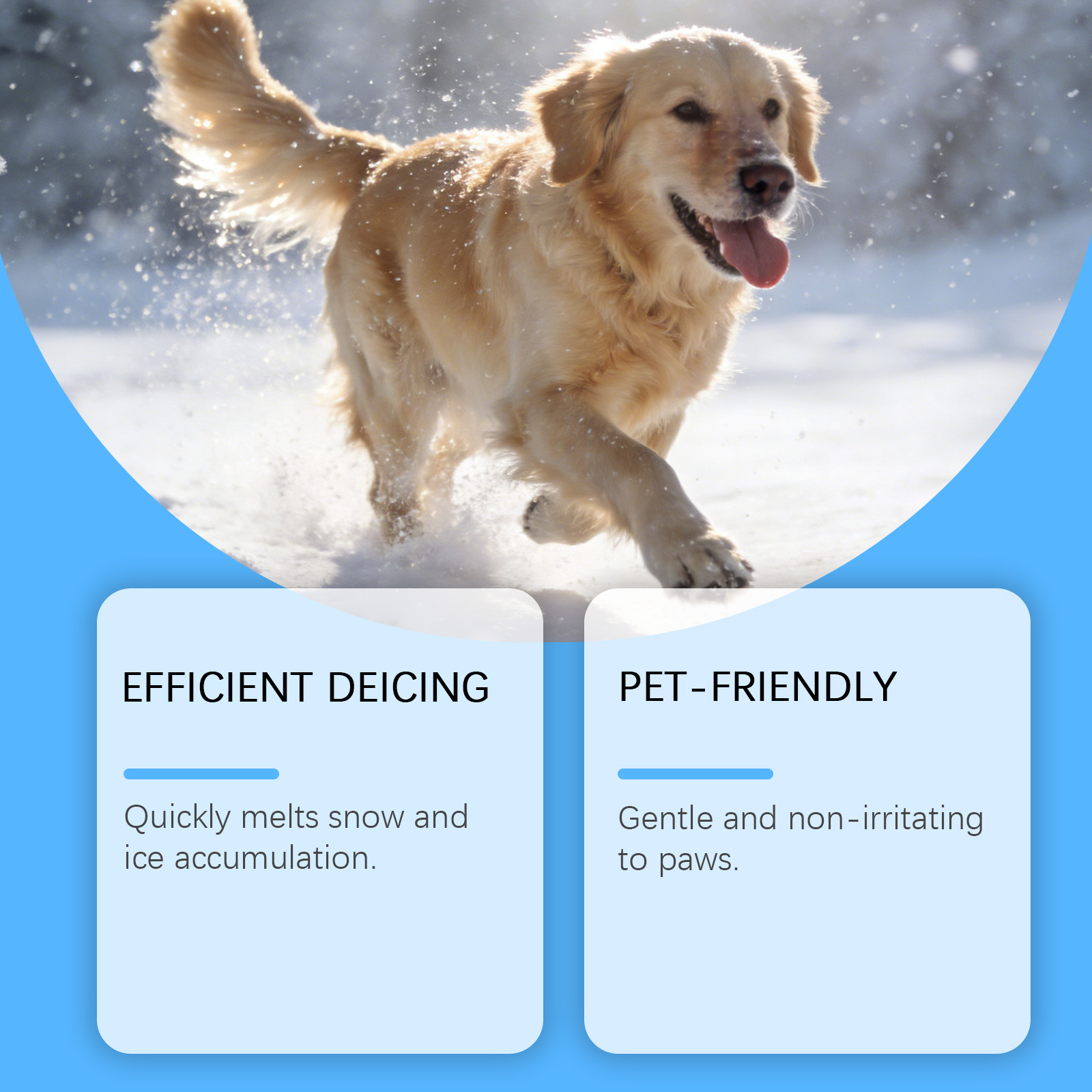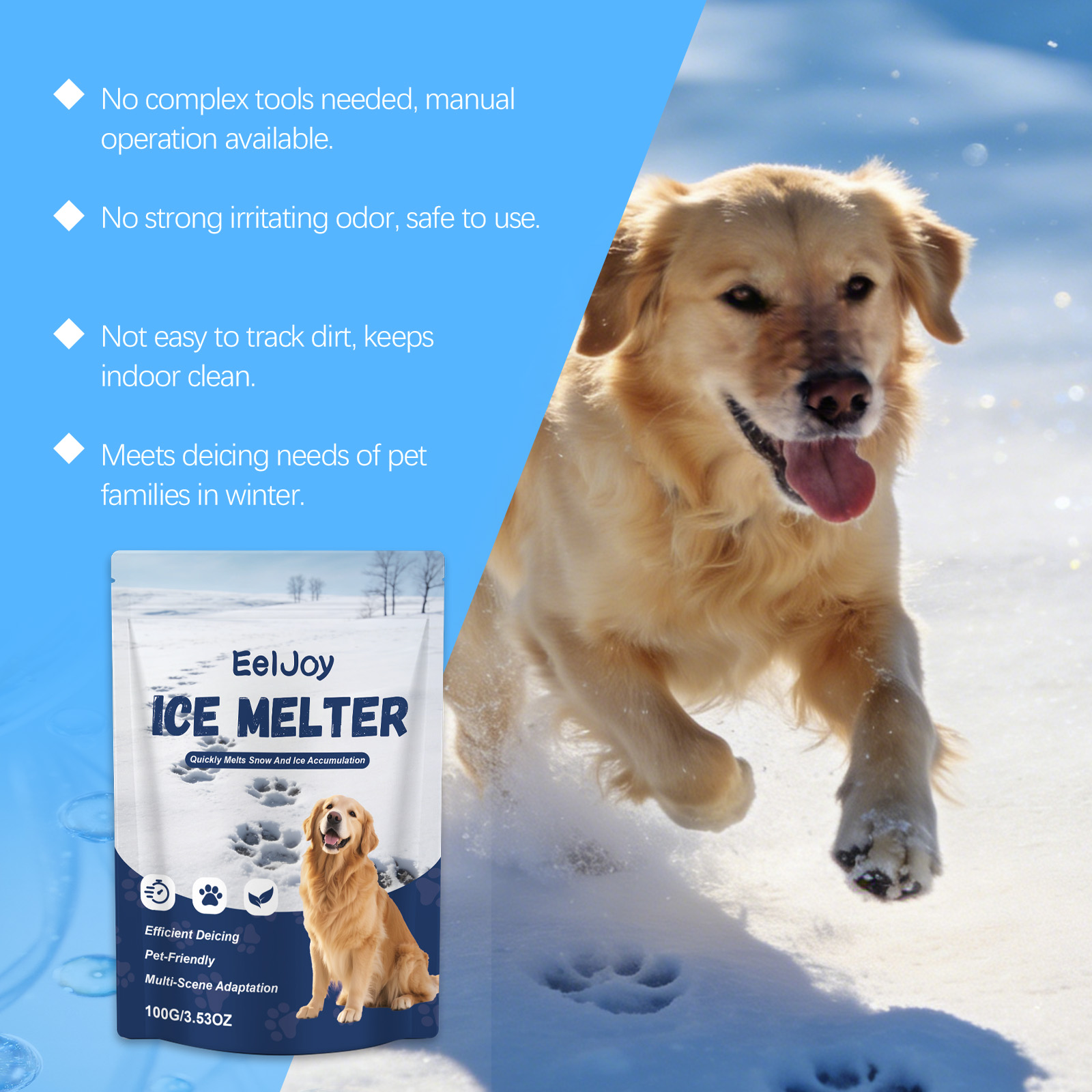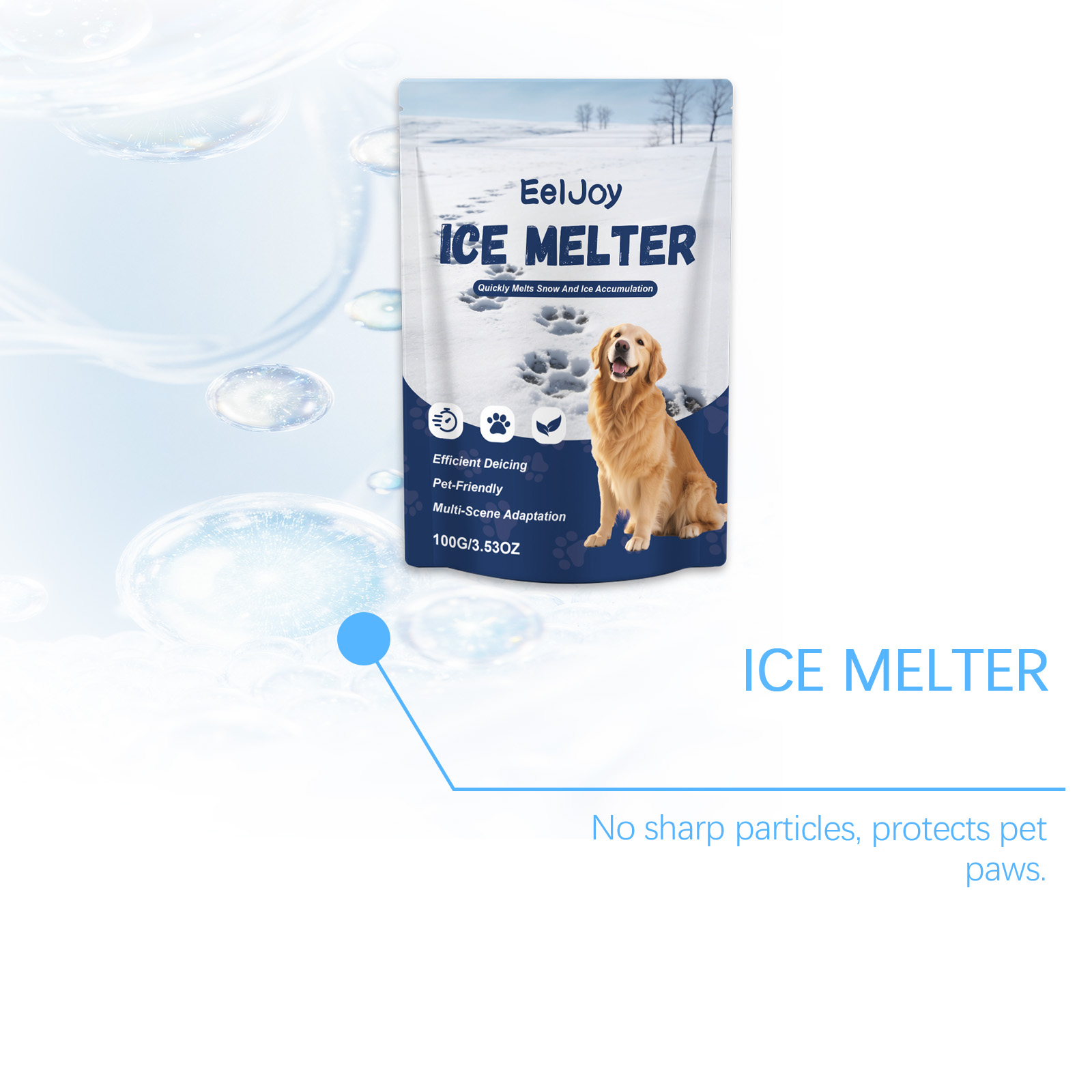 我们的宠物融冰剂,由二氧化硅、滑石粉精心调配而成。专为快速融化积雪和冰层设计。使用方法极为便捷:使用勺子取适量本产品,均匀撒在待处理表面(您需要自备勺子)。冰融化后,建议及时清除污垢和水分,以防再次结冰。并且对爪子温和且无刺激。