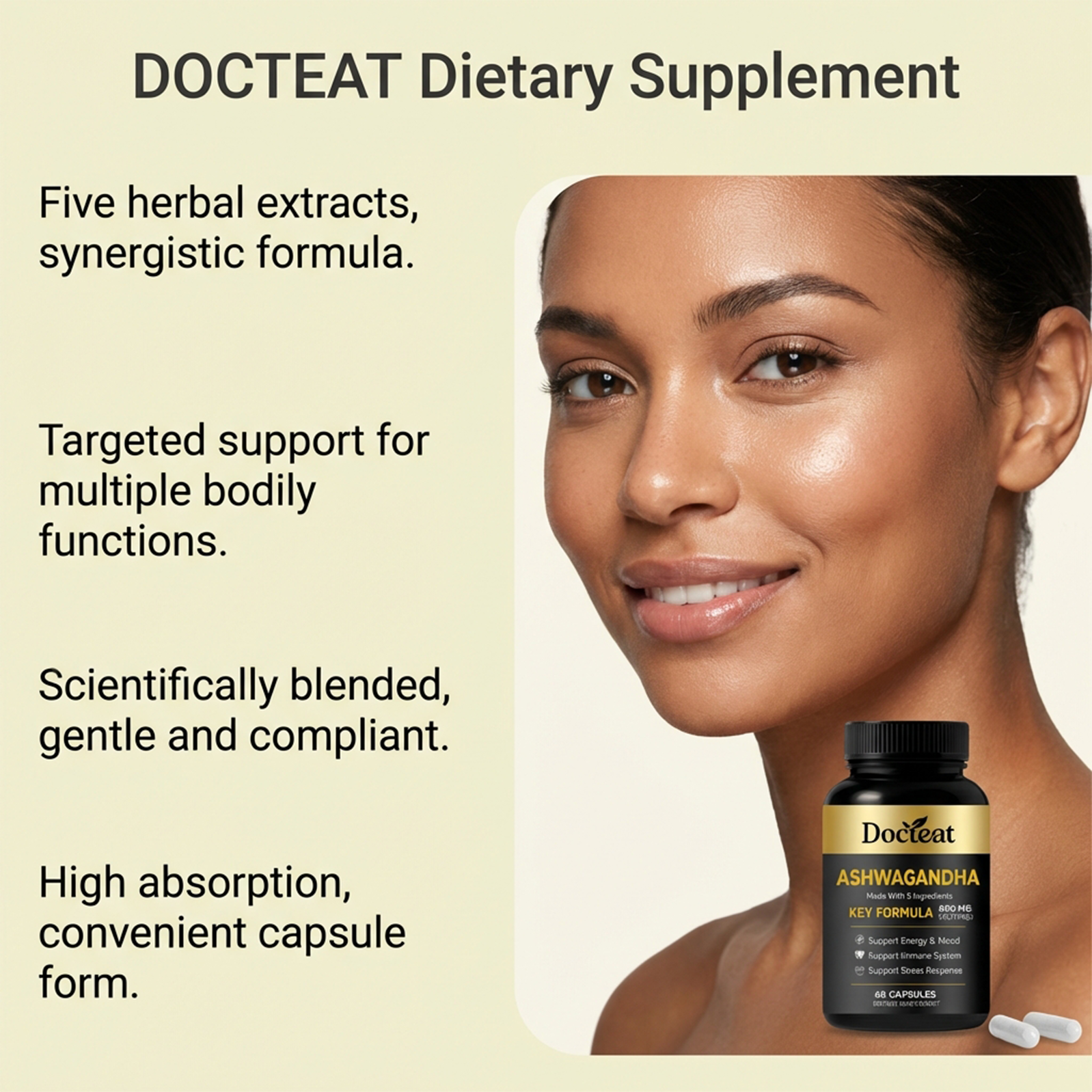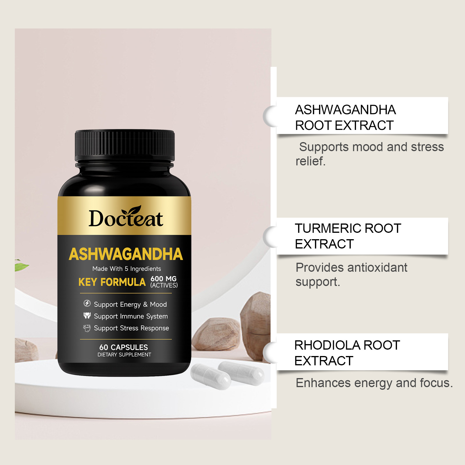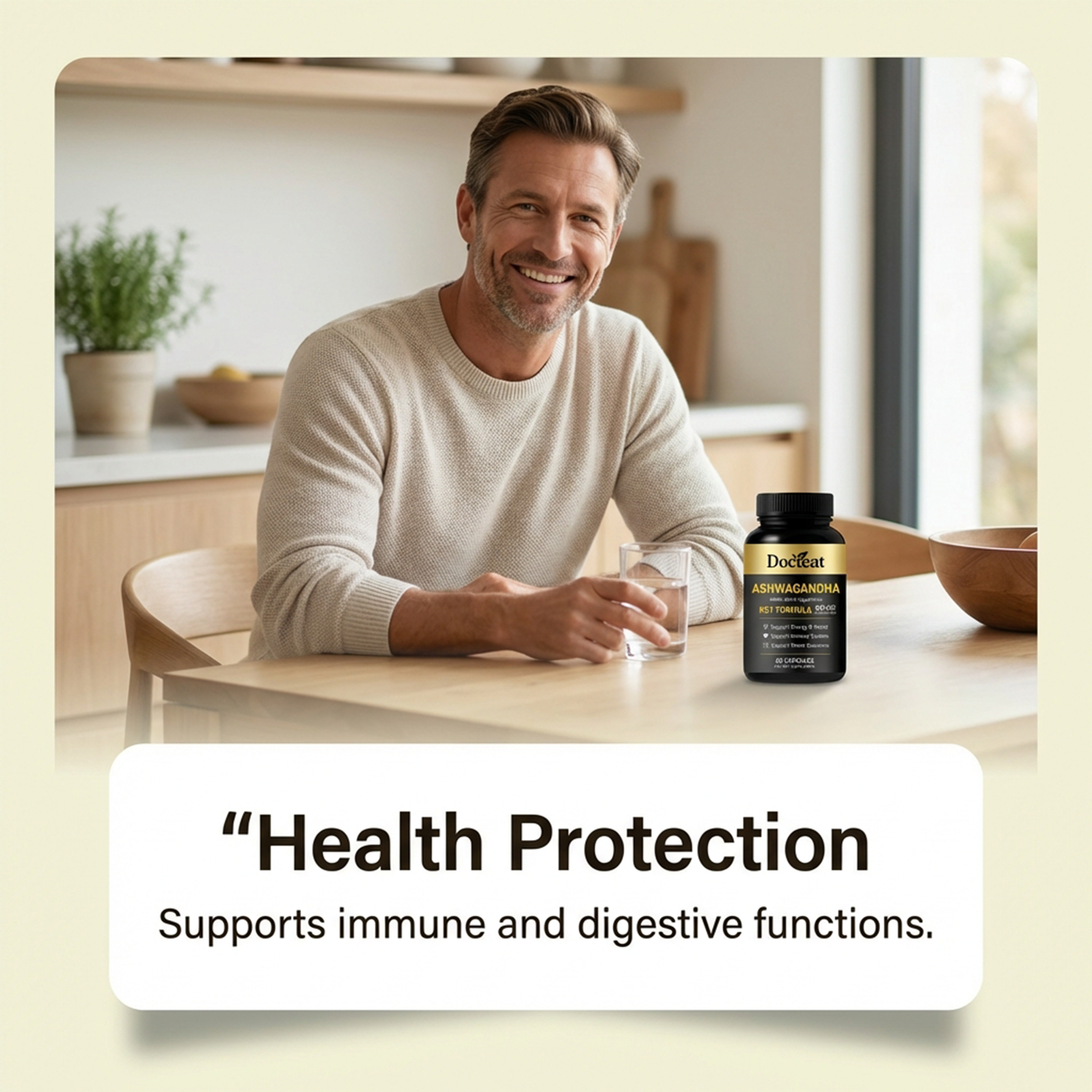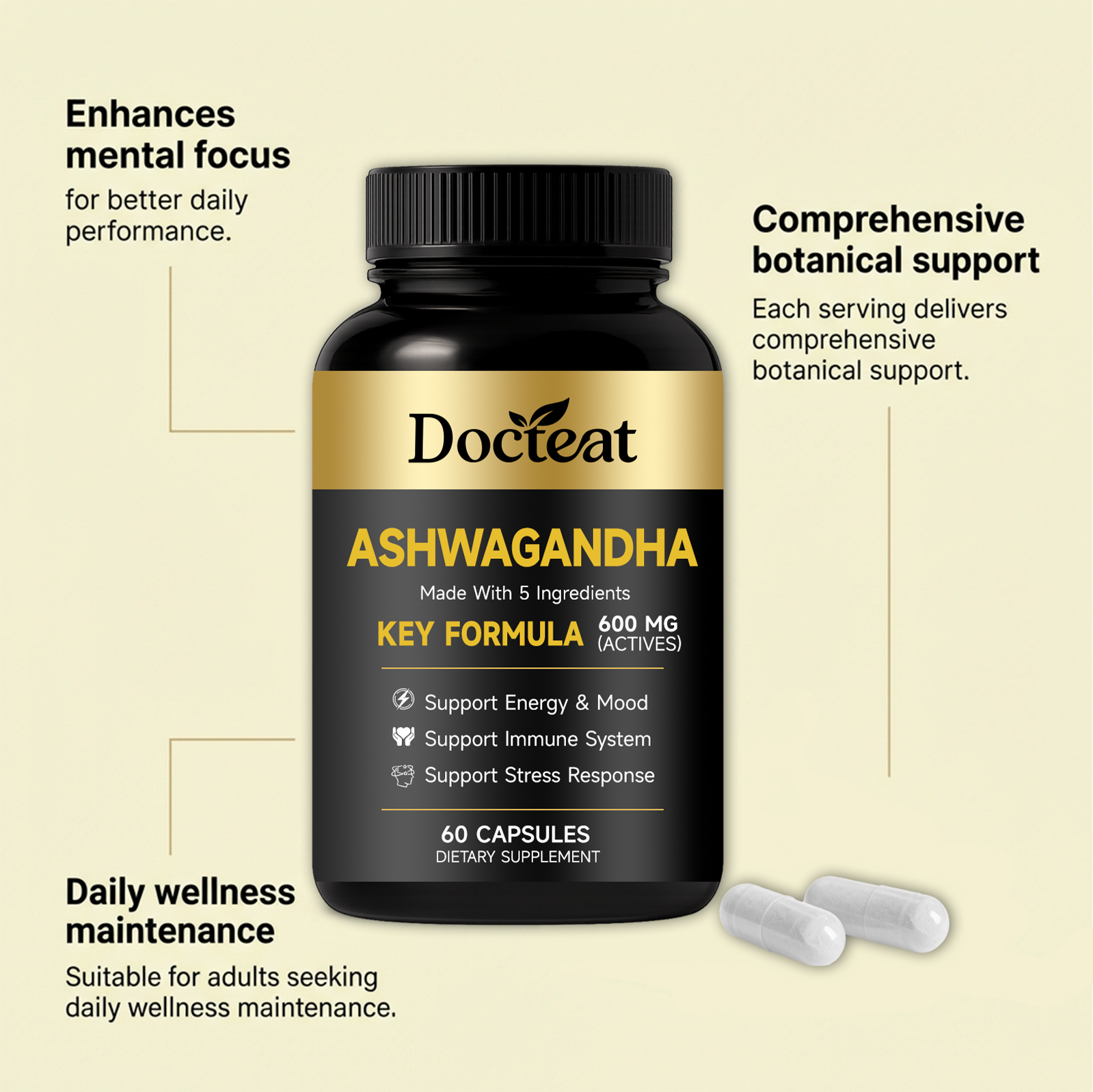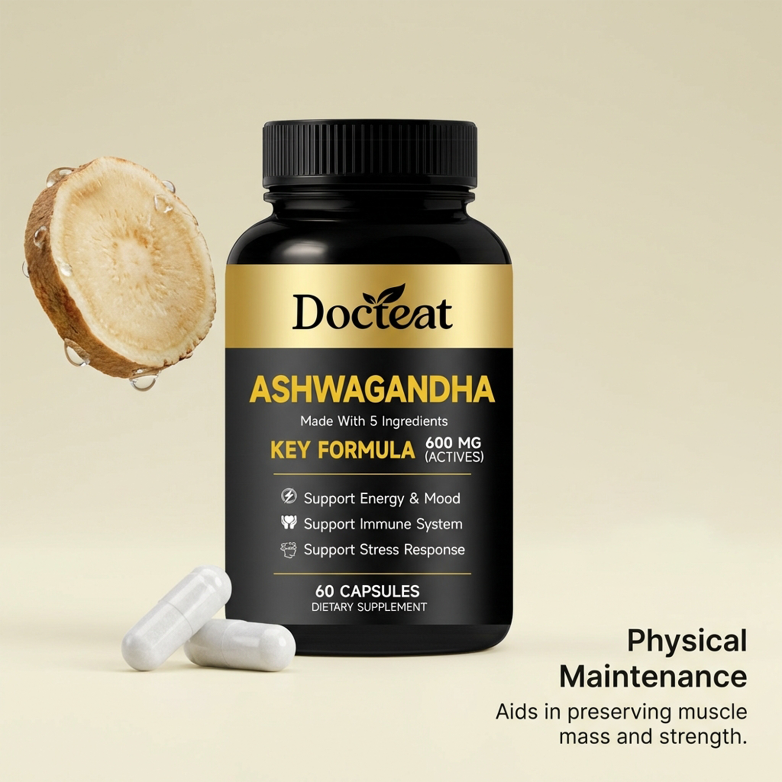 我们的身体护理膳食胶囊,由南非醉茄根提取物、姜黄根提取物精心调配而成。专为辅助舒缓压力,稳定情绪状态,提供持续日常能量,助力恢复活力设计。使用方法极为便捷:每日1次,每次服2粒胶囊,用水送服。并且它可以支持免疫系统与消化健康,辅助维持肌肉量,提供抗氧化支持。
