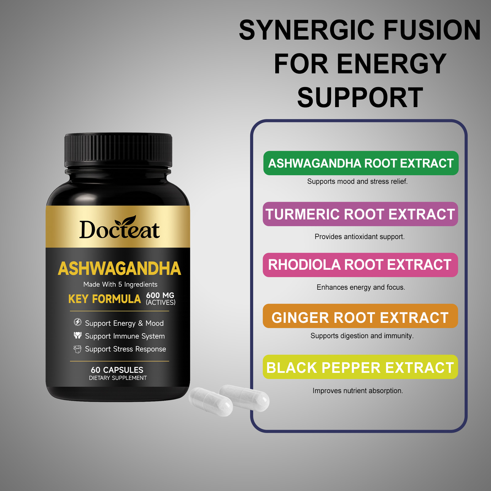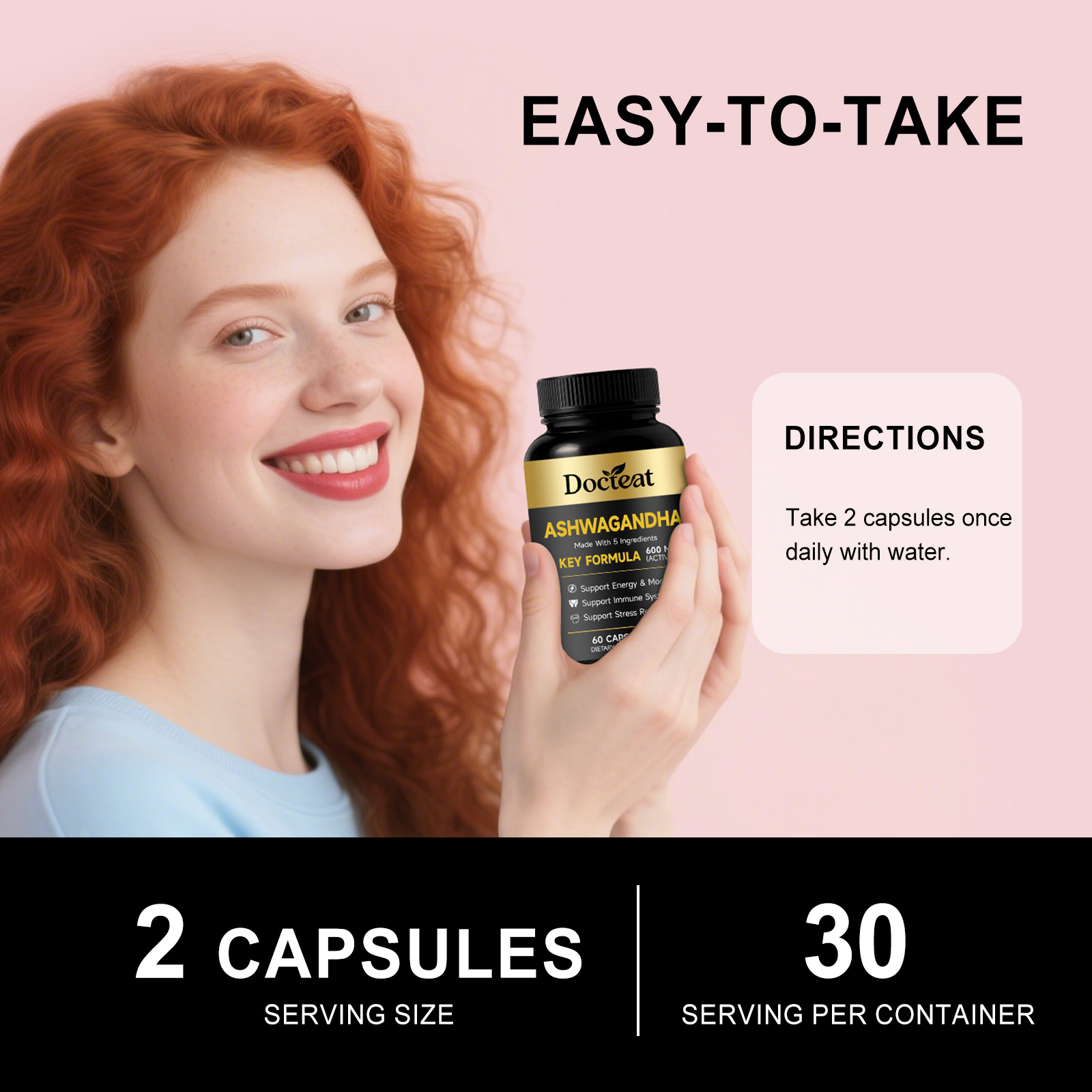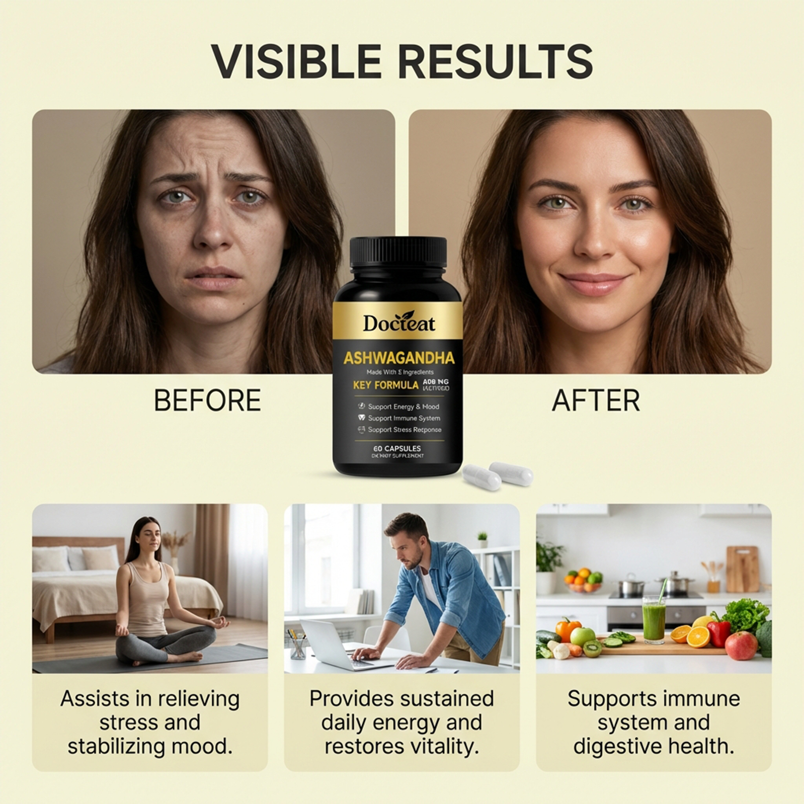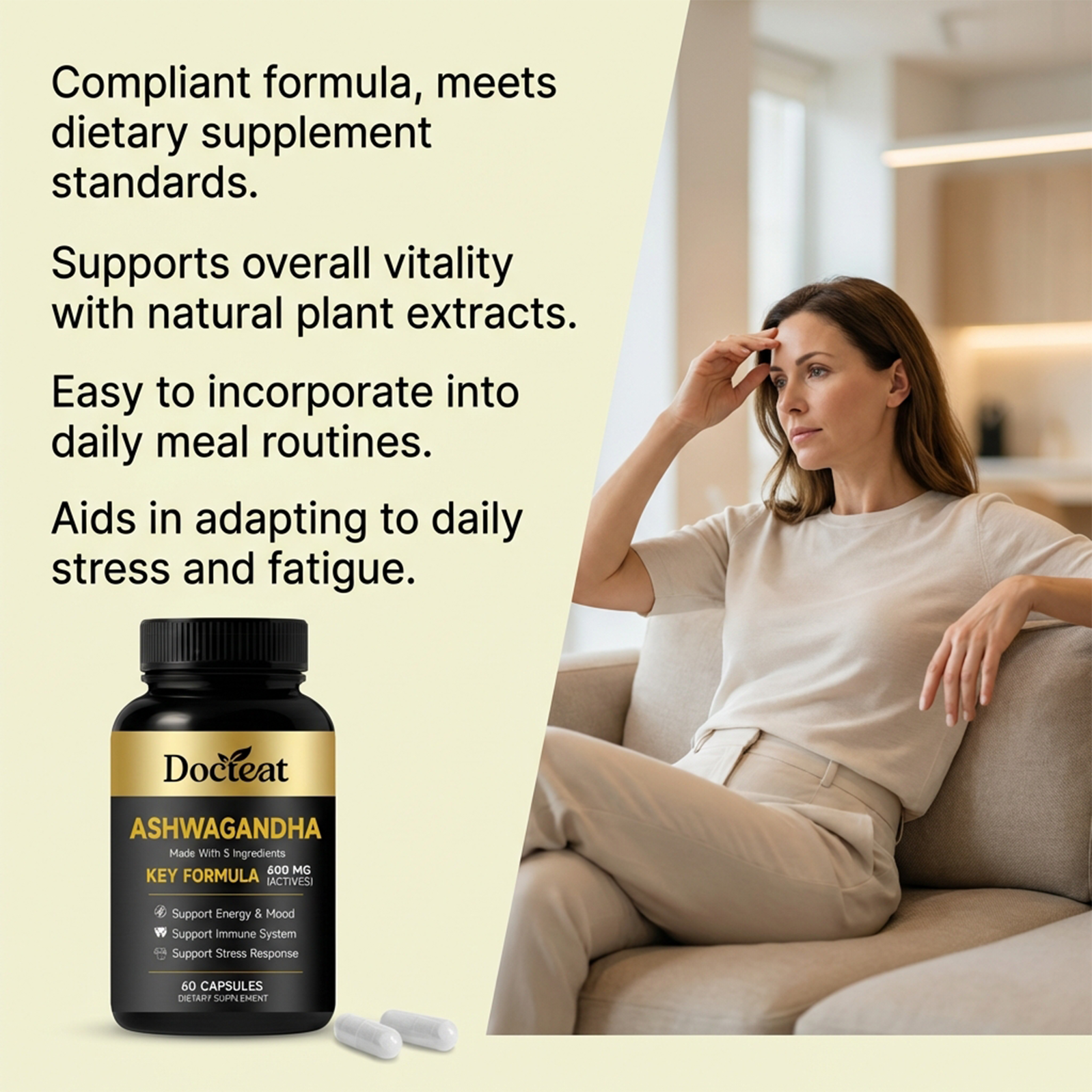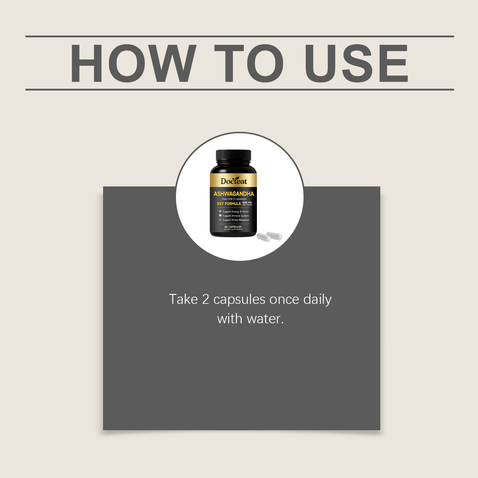 我们的身体护理膳食胶囊,由南非醉茄根提取物、姜黄根提取物精心调配而成。专为辅助舒缓压力,稳定情绪状态,提供持续日常能量,助力恢复活力设计。使用方法极为便捷:每日1次,每次服2粒胶囊,用水送服。并且它可以支持免疫系统与消化健康,辅助维持肌肉量,提供抗氧化支持。