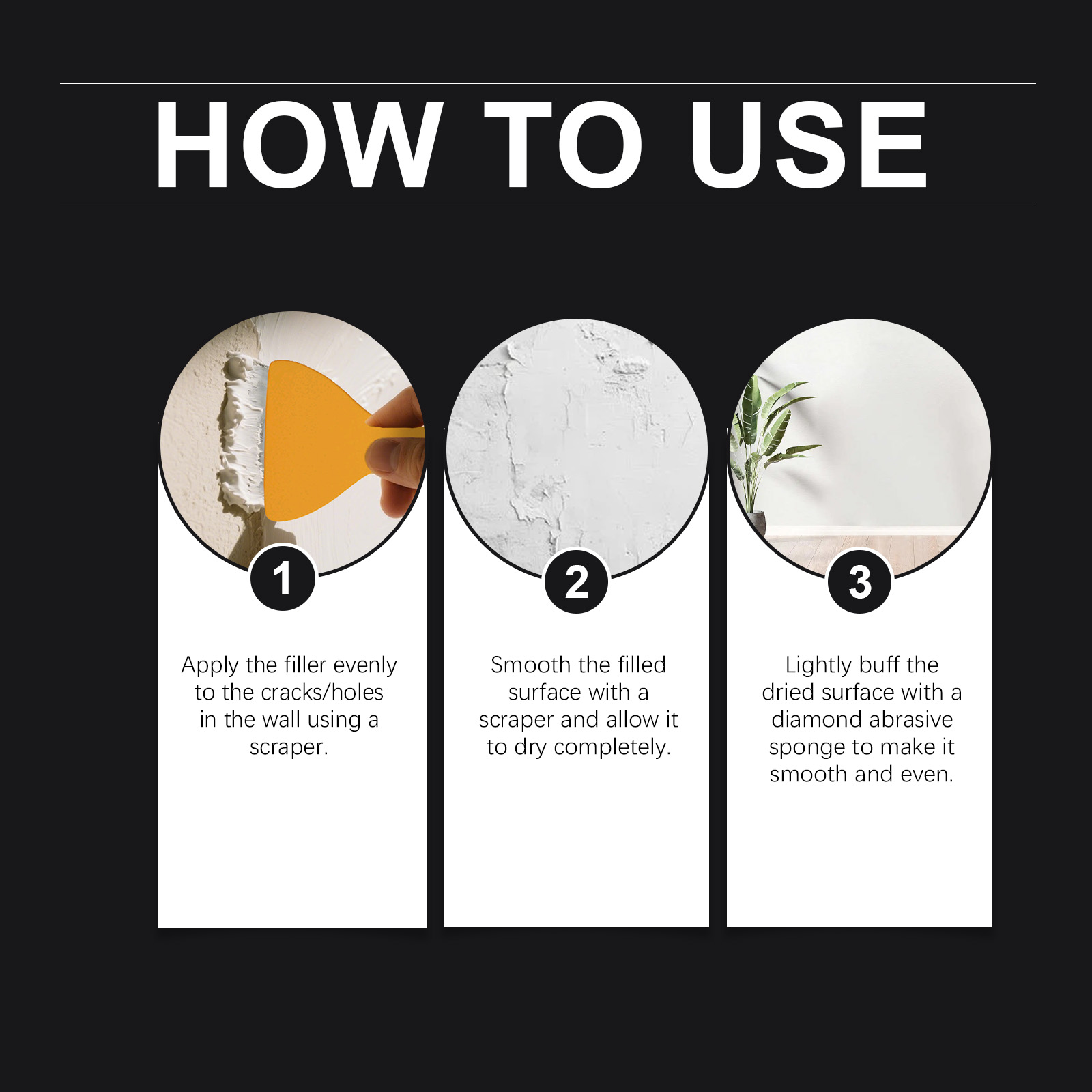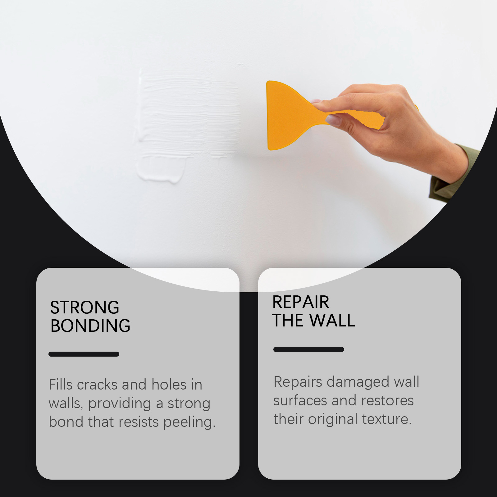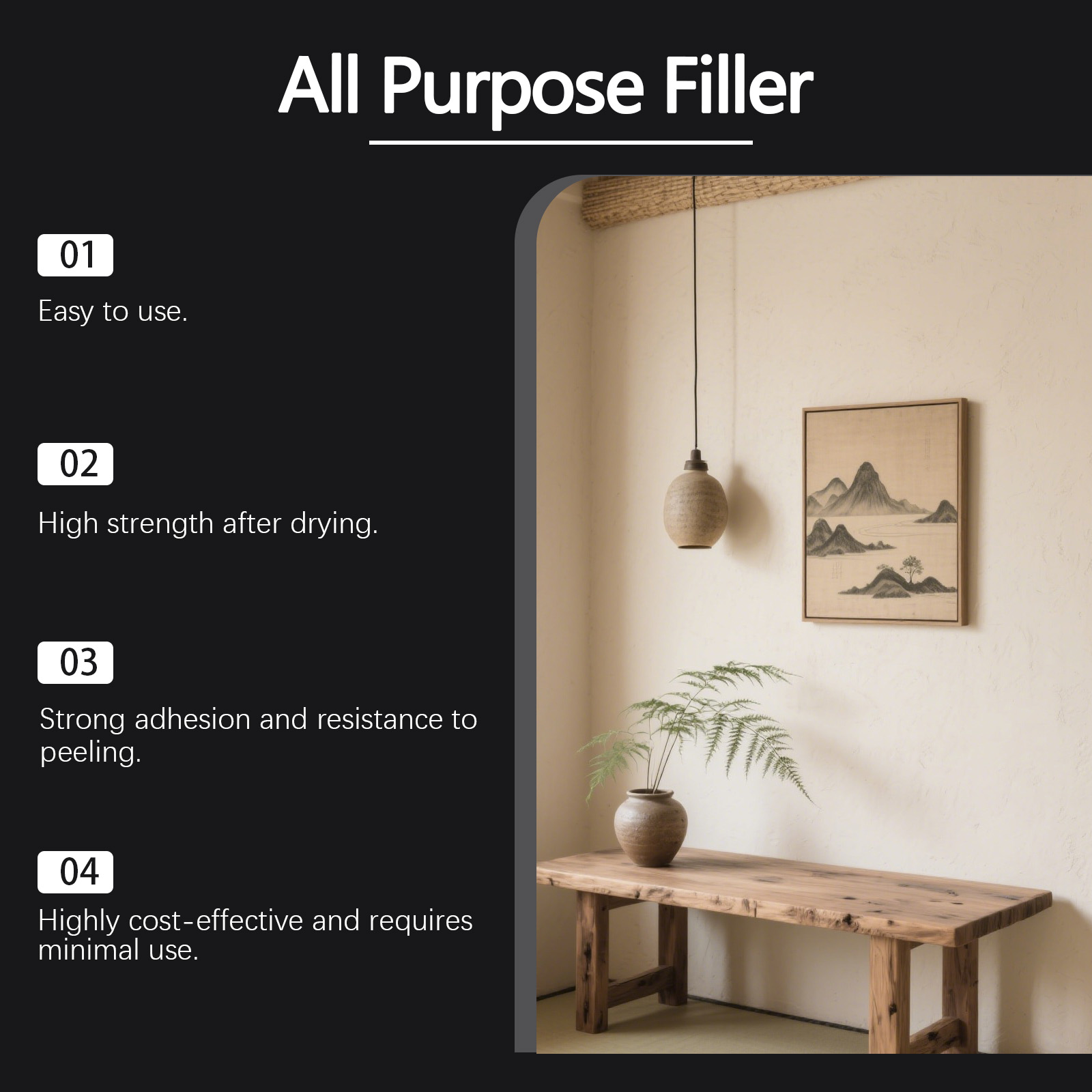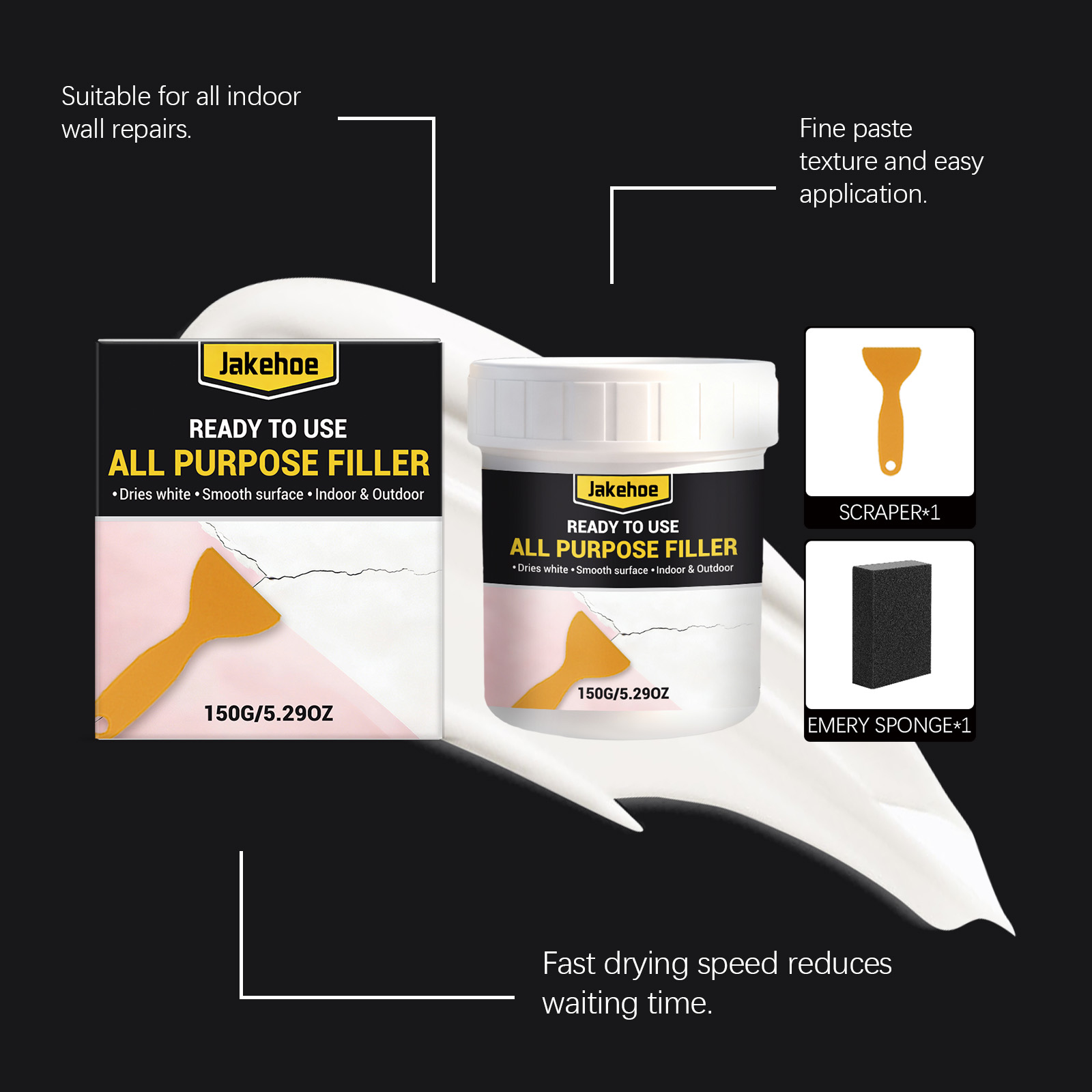 我们的多用途墙面修补套装,由碳酸钙、氧化钙精心调配而成。专为填补墙壁上的裂缝和孔洞设计。使用方法极为便捷:1.用刮刀将填充物均匀地涂抹在墙上的裂缝/孔洞处。2.用刮刀将填充表面刮平,并让其完全干燥。3.用金刚砂海绵轻轻擦拭干燥的表面,使其变得光滑平整。本品能够修复受损的墙面表面,并恢复其原有的纹理。形成牢固的粘合剂,从而防止剥落现象发生。