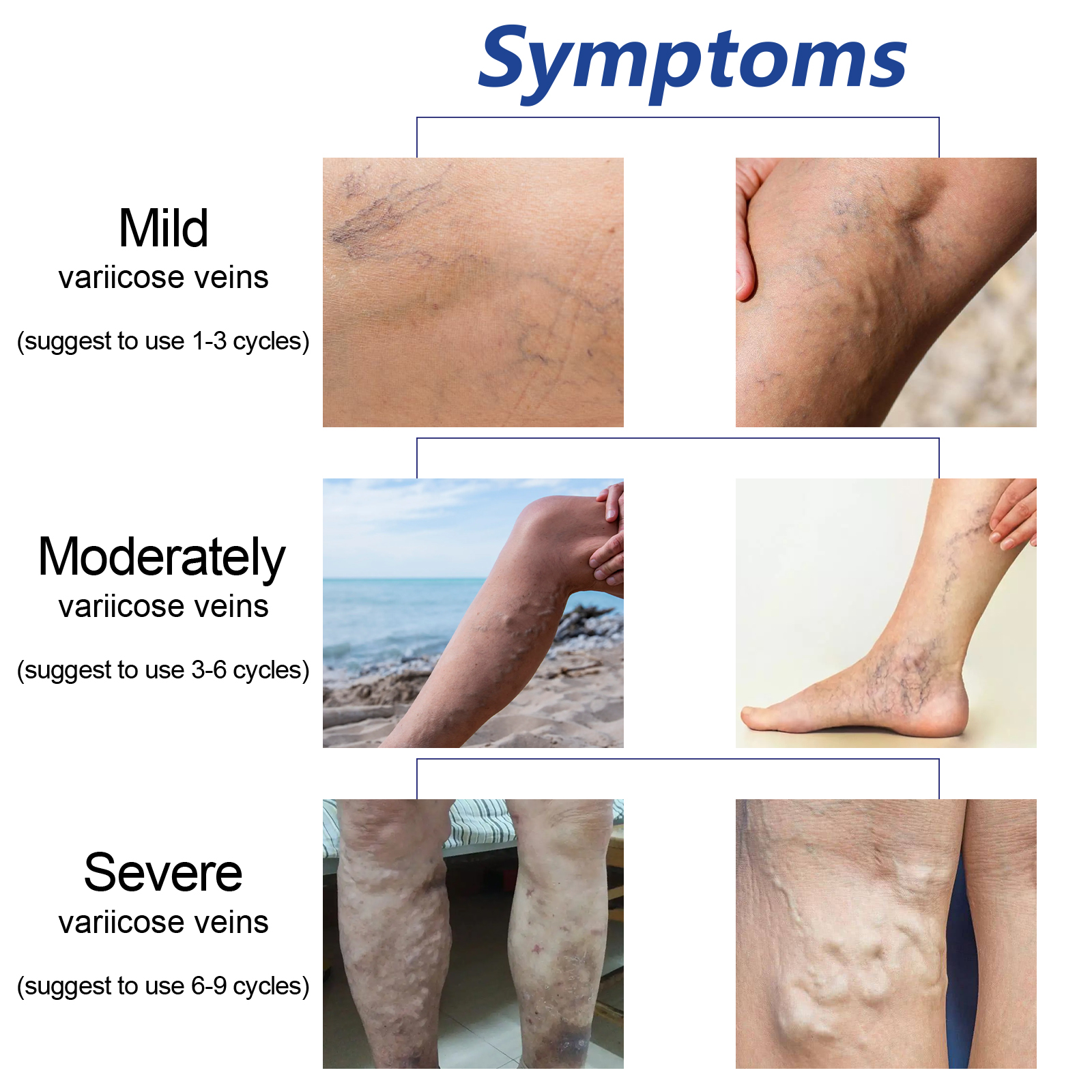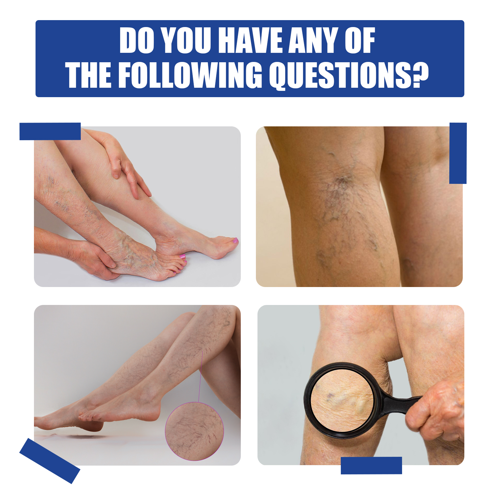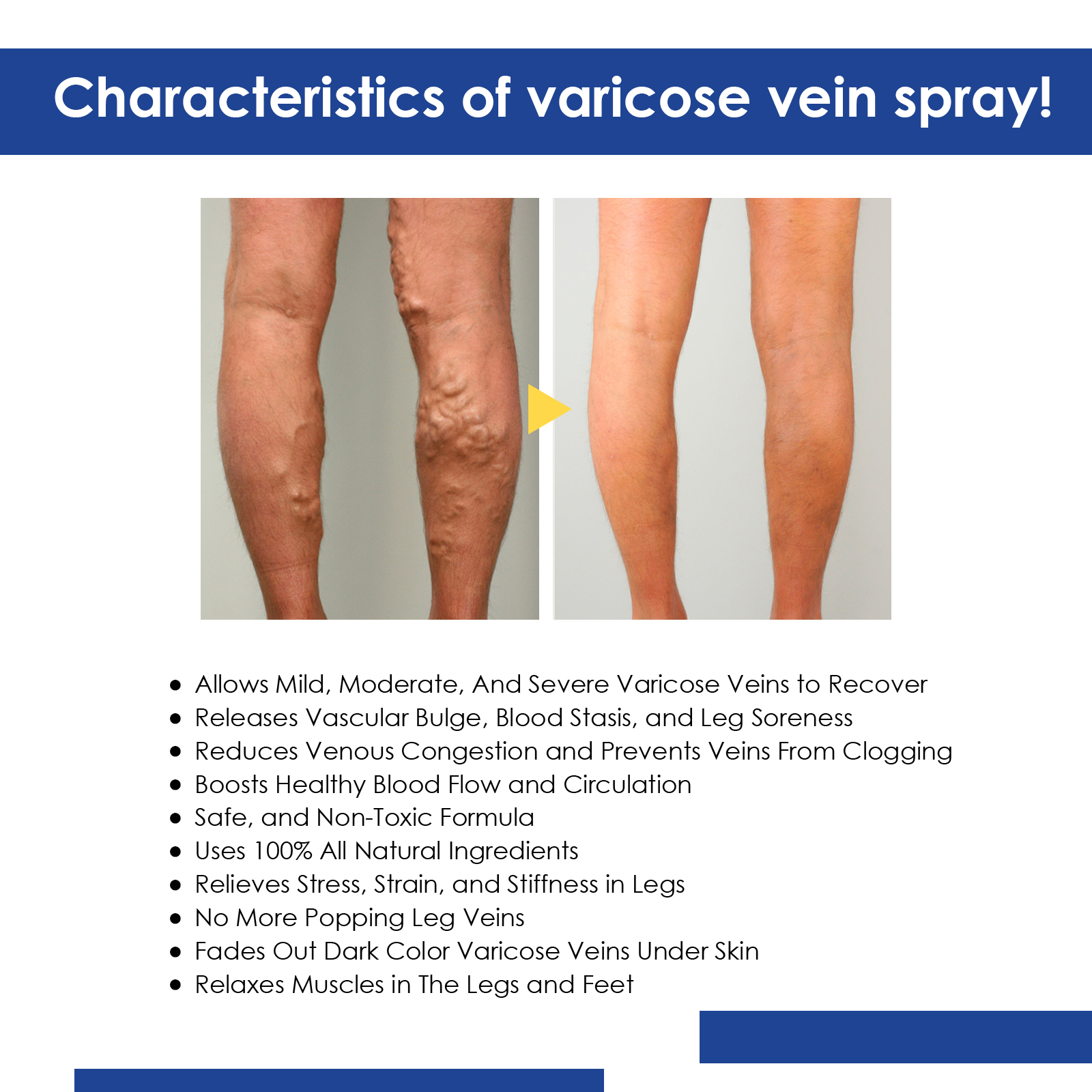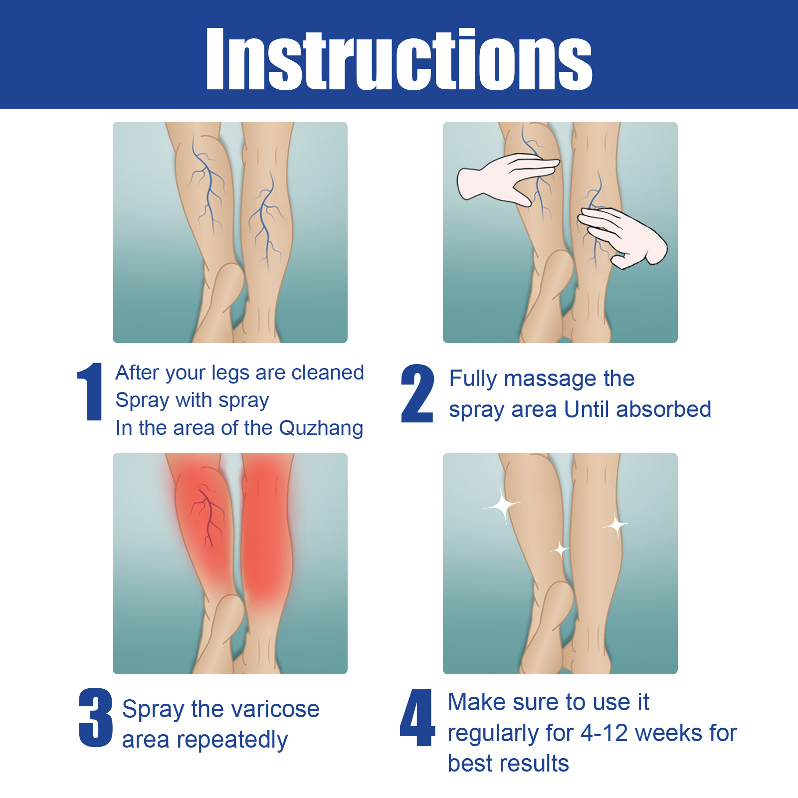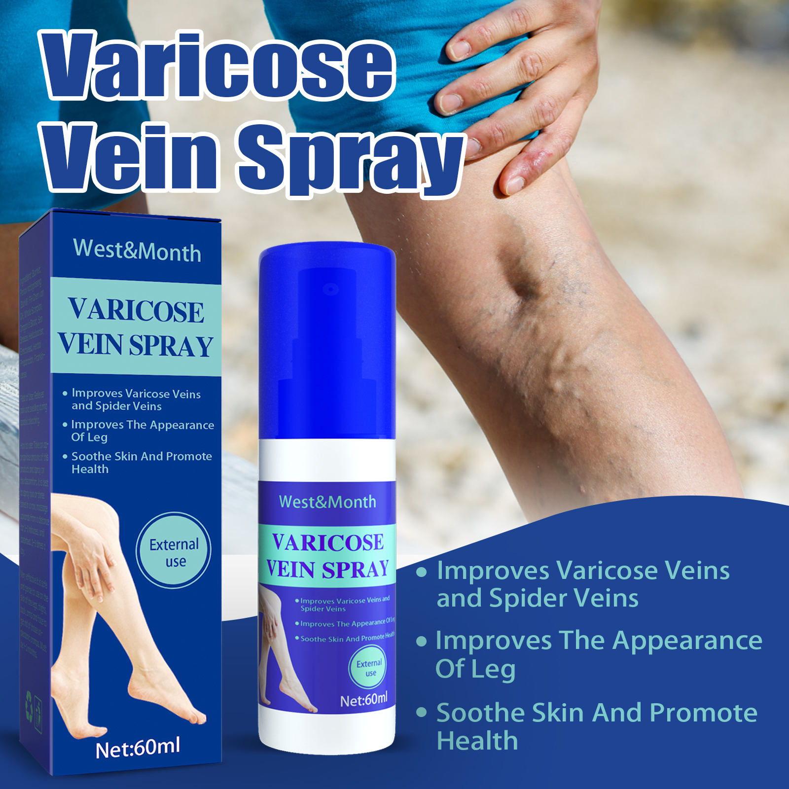 我们的静脉按摩喷雾含有胭脂草,三七,全蝎。它可以减少和消除蜘蛛和静脉曲张,帮助改善血液循环和毛细血管健康。它还可以减少静脉充血,防止新的静脉曲张形成。它的使用方法很简单:1. 清洗完腿后,用喷雾剂喷在曲张部位;2. 充分按摩喷雾区域直至吸收;3.反复喷洒静脉曲张部位;4.为了获得最佳效果,请确保定期使用4-12周。静脉按摩喷雾改善静脉曲张和蜘蛛静脉,改善腿部外观,舒缓皮肤,促进健康。