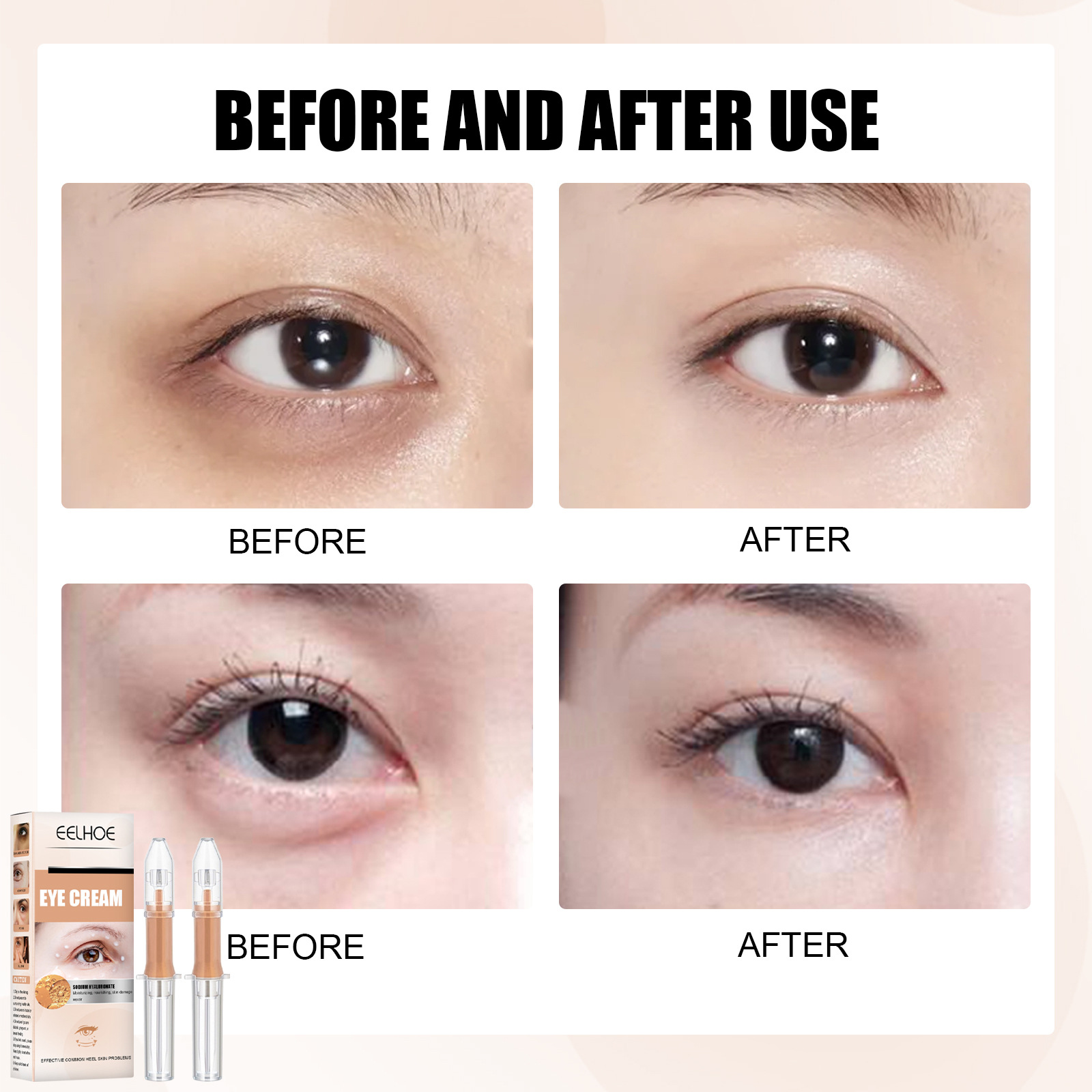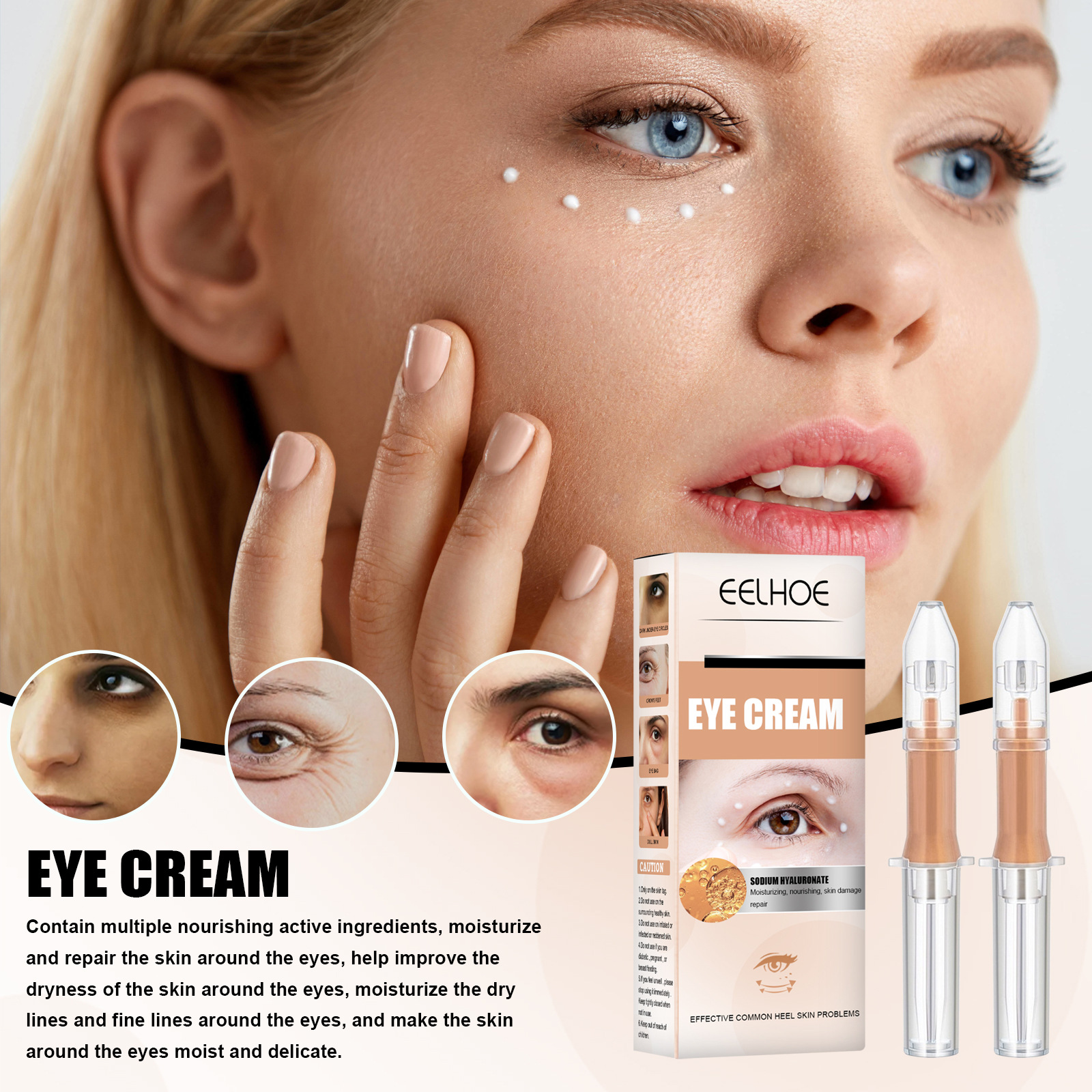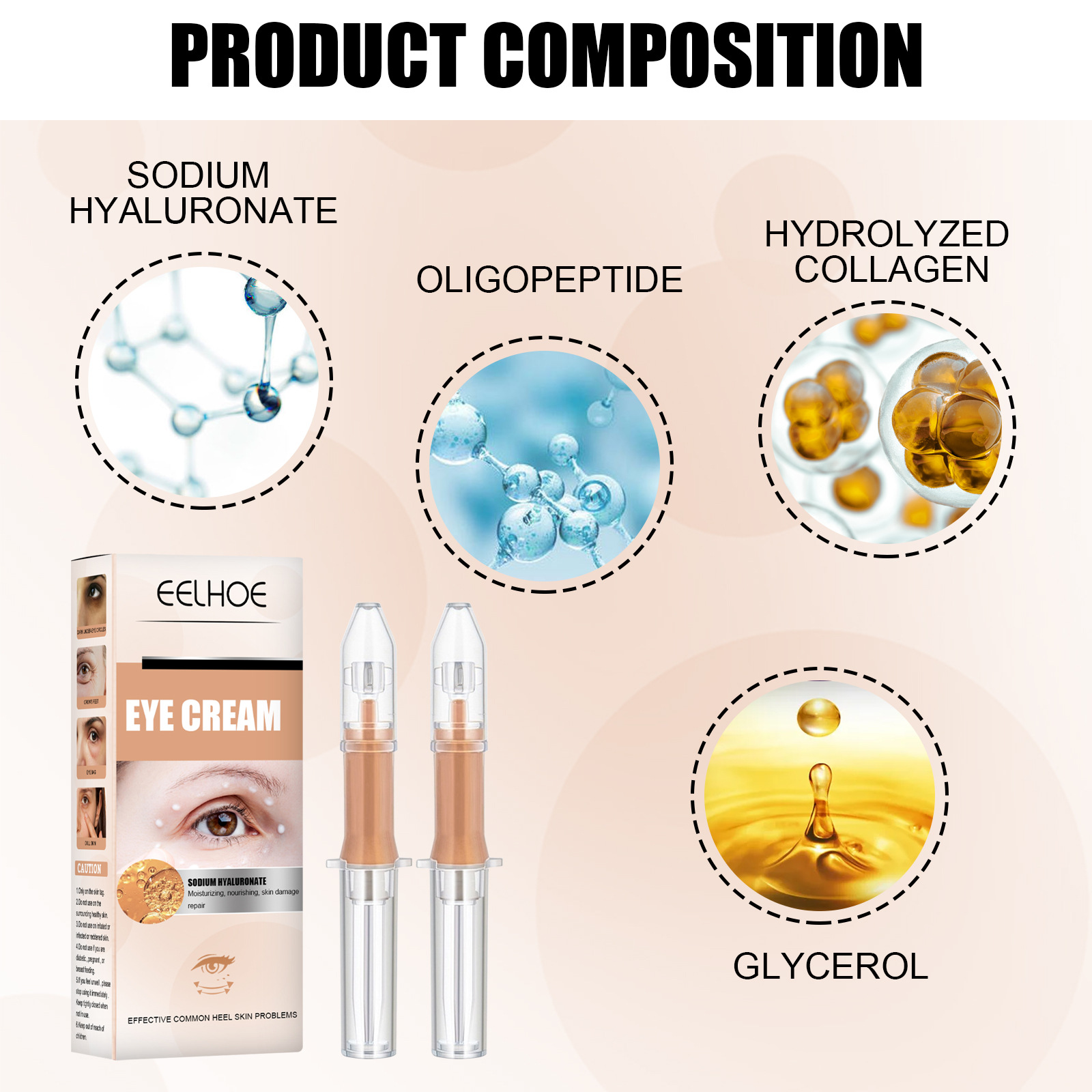 我们的眼霜含有甘油、水解胶原蛋白。它可以润修护眼周肌肤,帮助改善眼周肌肤干燥,滋润眼部干纹、细纹,令眼周肌肤水润细致。它的使用方法很简单:1.拆下眼霜密封处的盖子。2.切断密封塞。拆卸保护套管。3.向前按压活塞并挤压眼霜以涂抹。4.每次使用后,按压密封塞的背面。并且可以修复受损等问题。