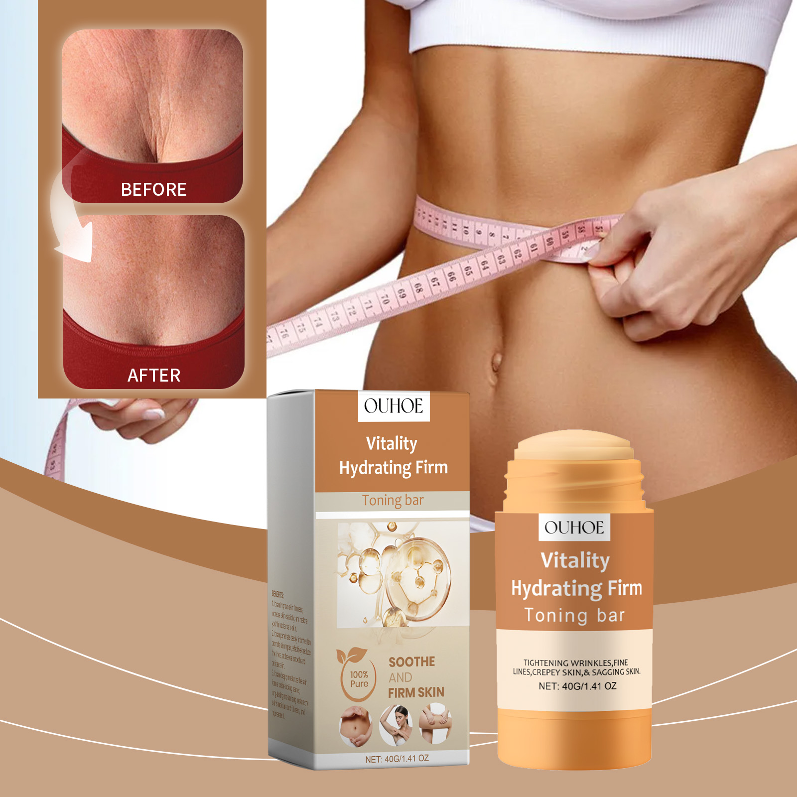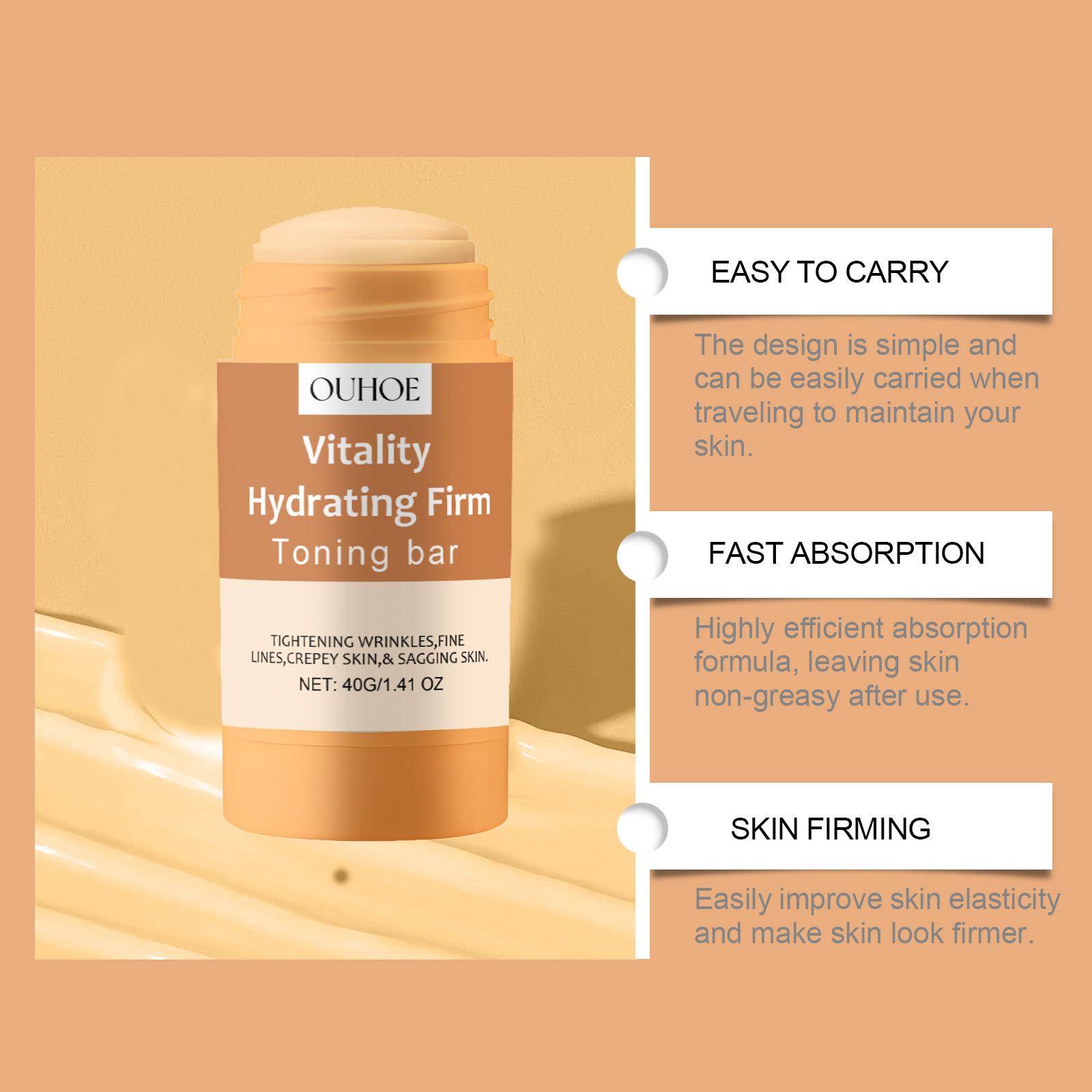 我们的紧致肌肤身体棒含有芙蓉花提取物、胶原。它可以设计简单,旅行时可以轻松携带,保养肌肤。快速吸收,高效吸收配方,使用后肌肤不油腻。它的使用方法很简单:清洁干燥身体皮肤,取适量产品均匀涂于肌肤上,轻轻按摩至吸收即可。并且可以深层渗透肌肤,促进肌肤修护,有效淡化细纹,展现光滑细腻的肌肤。深层滋润肌肤,形成锁水屏障,长效保湿,恢复肌肤水润饱满,焕发青春活力。