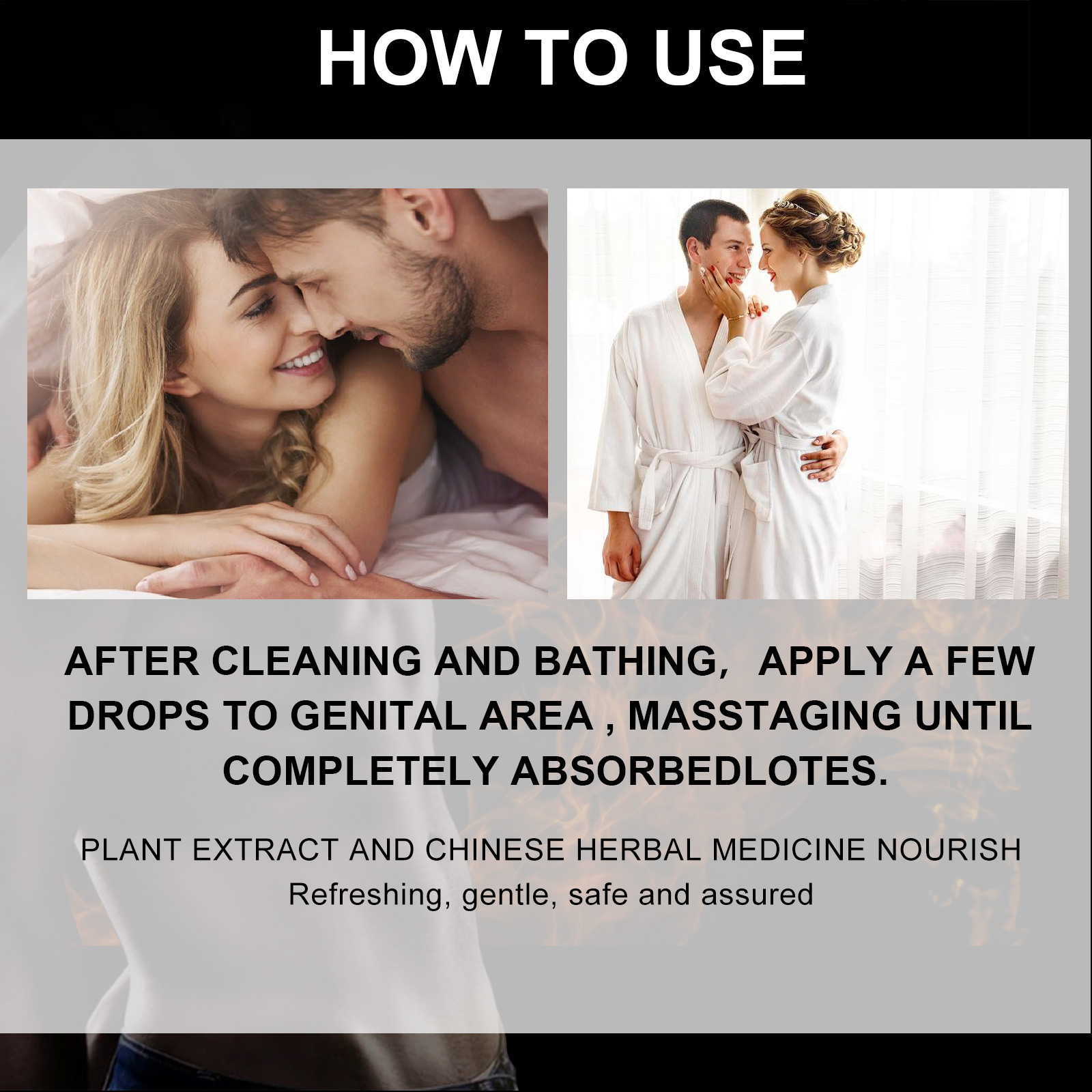我们的男士按摩精油含有人参根提取液,淫羊藿提取液,杜仲皮提取液。它可以改善性生活,增加性欲,提高男性性欲,满足女性欲望,让您的性伴侣满意而快乐。它的使用方法很简单:清洁沐浴后,取几滴于生殖器部位,按摩至完全吸收。可以支持男性能量和减少压力,提高您的性表现,帮助男人释放内心隐藏的力量,将亲密体验提升到新的高度。