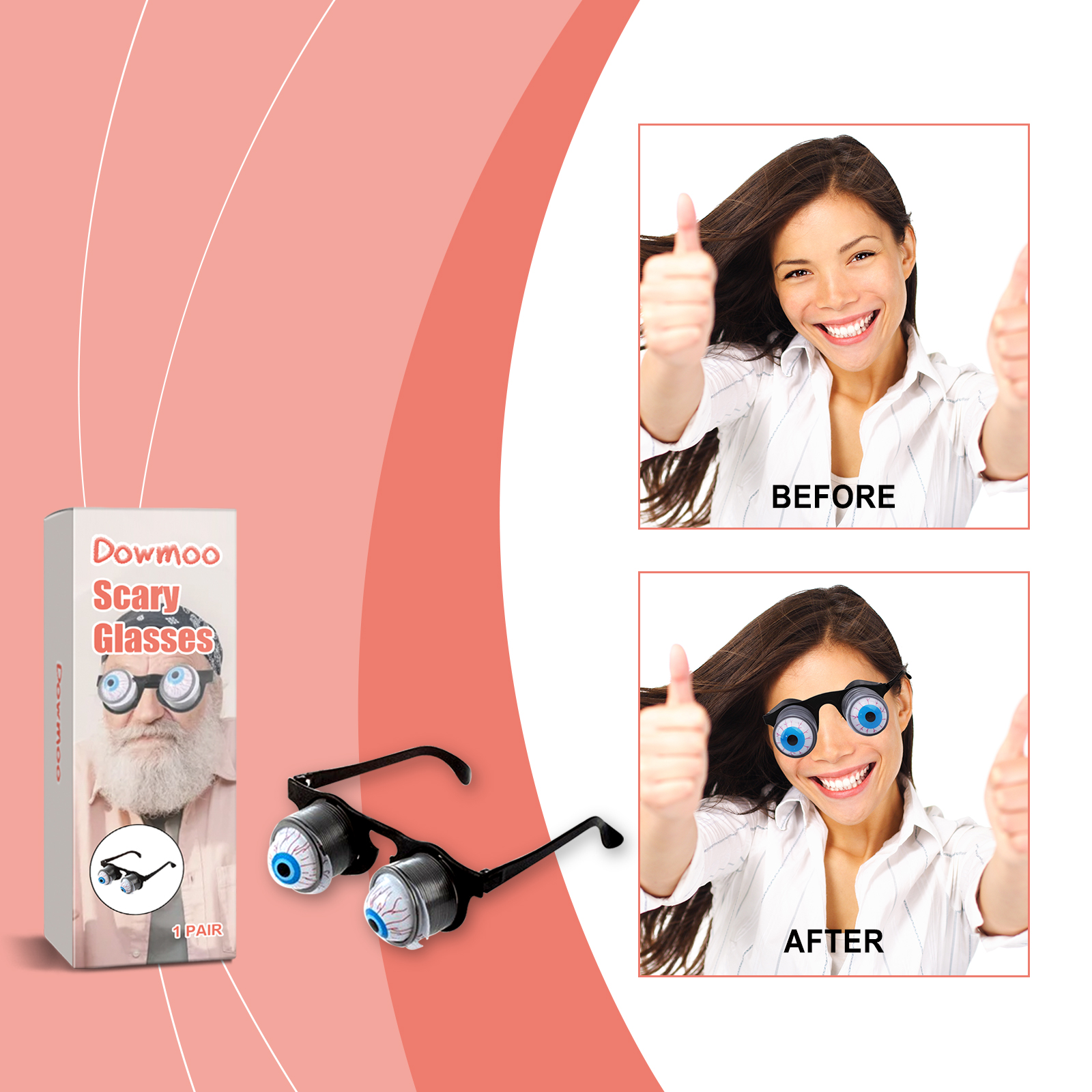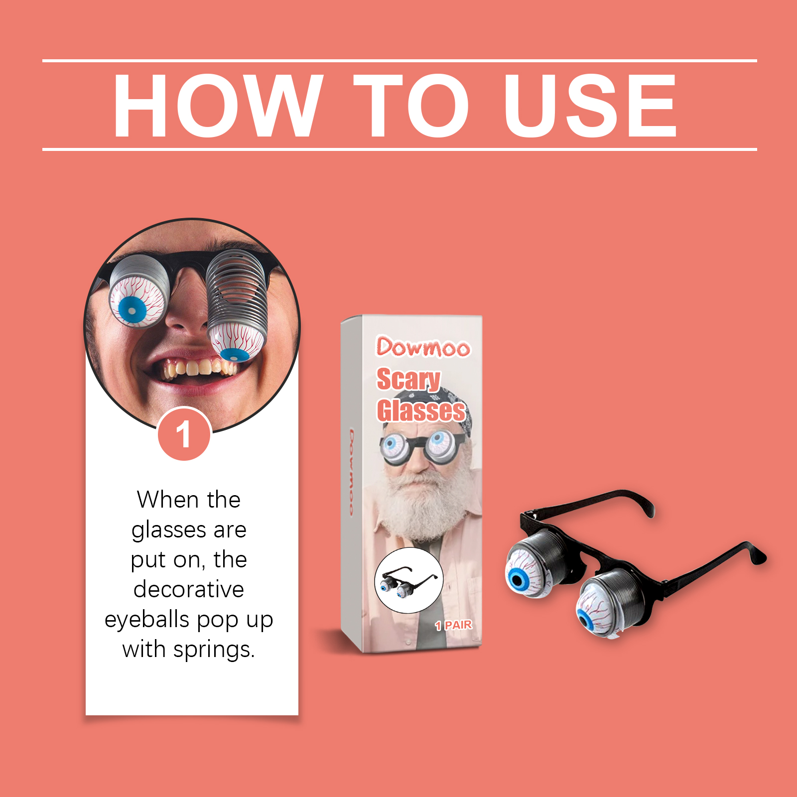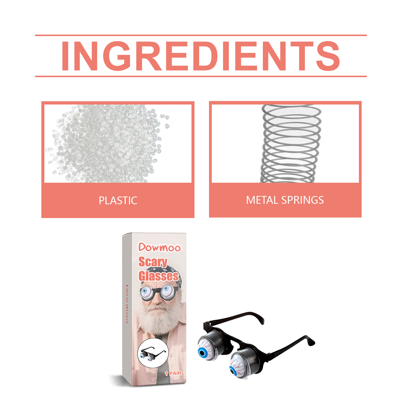 我们的恐怖眼镜含有塑料、金属弹簧。它可以营造出一种逼真而恐怖的氛围。它的使用方法很简单:打开包装,戴上眼镜后装饰性的眼球会随着弹簧弹出来。并且重量轻,舒适,你可以立即创建一个氛围。