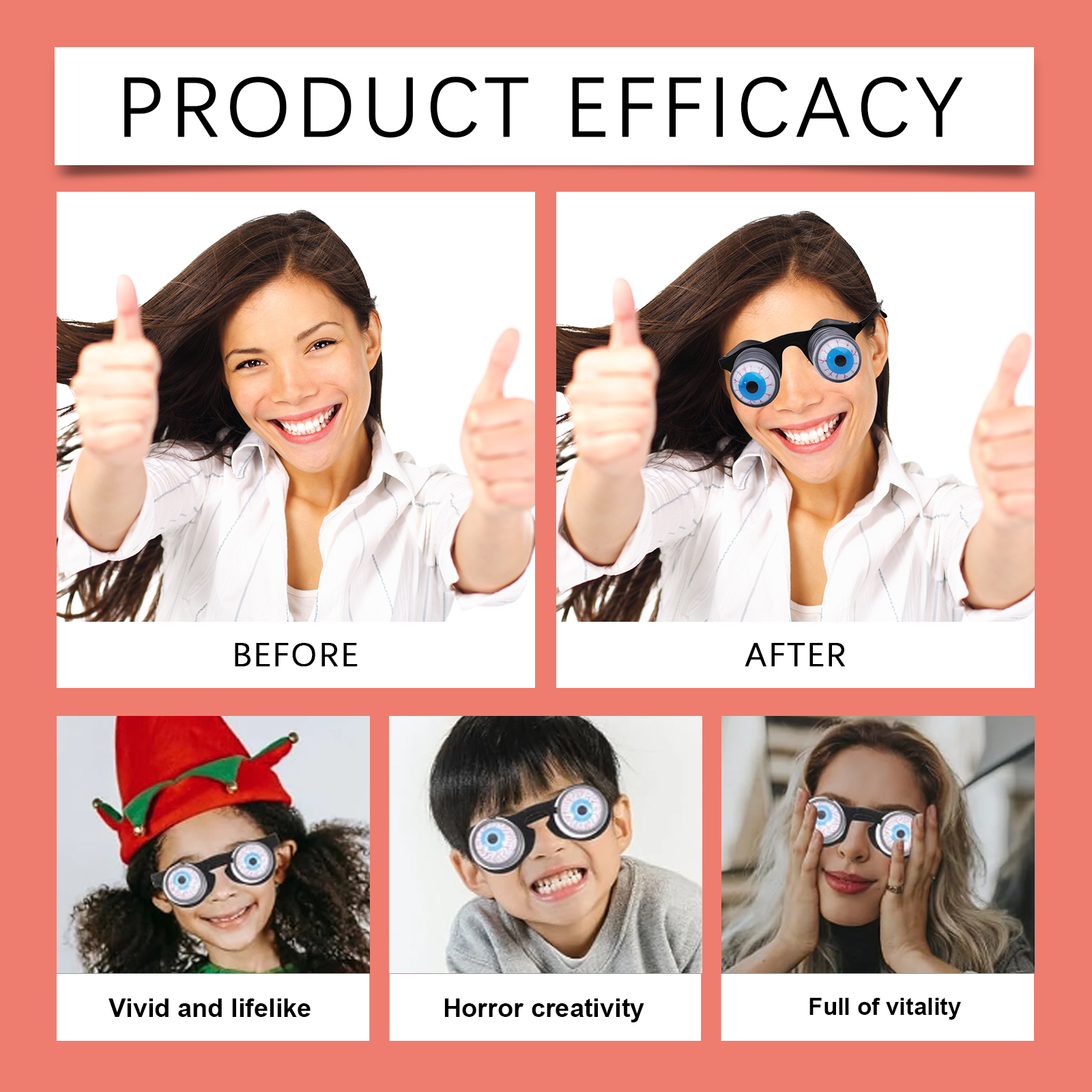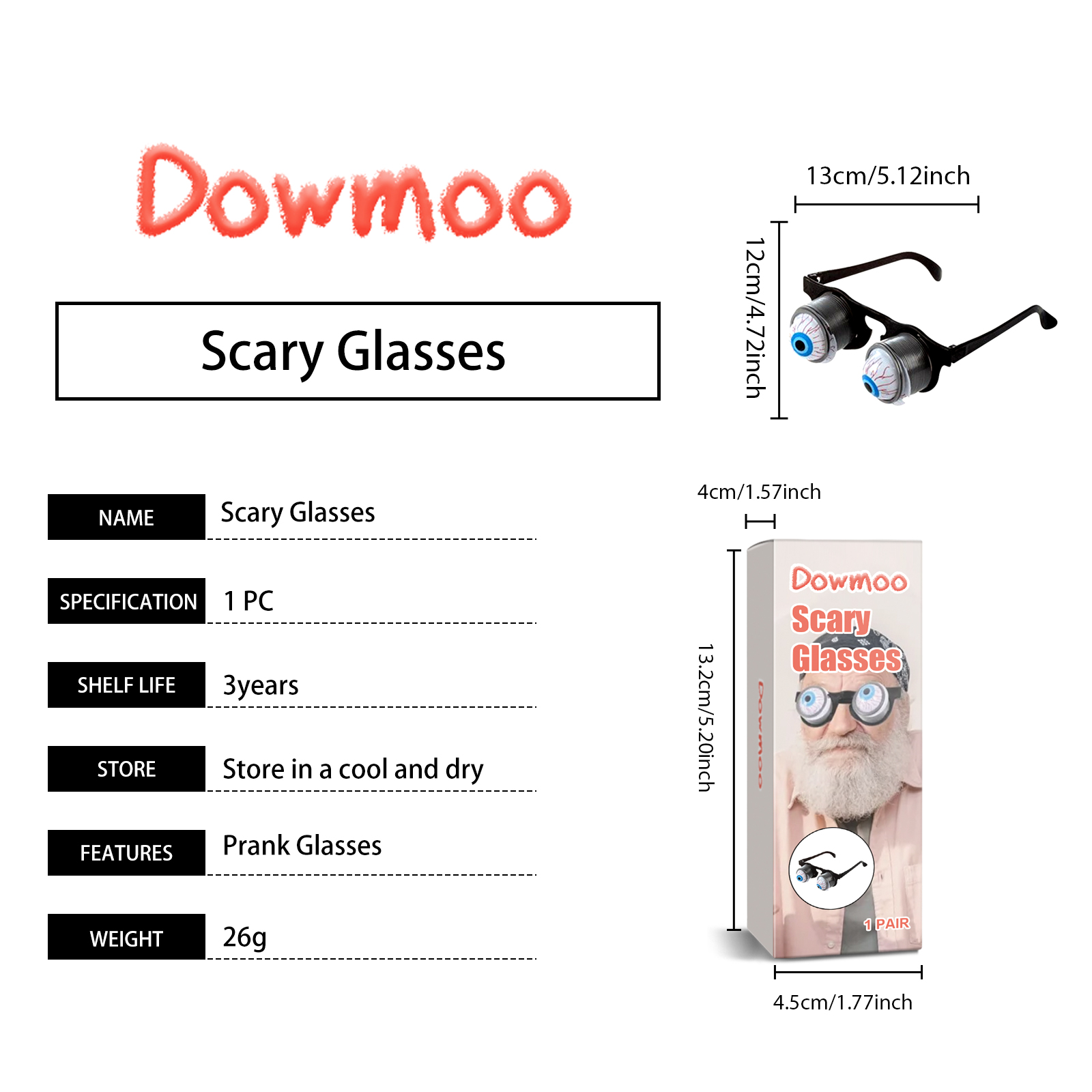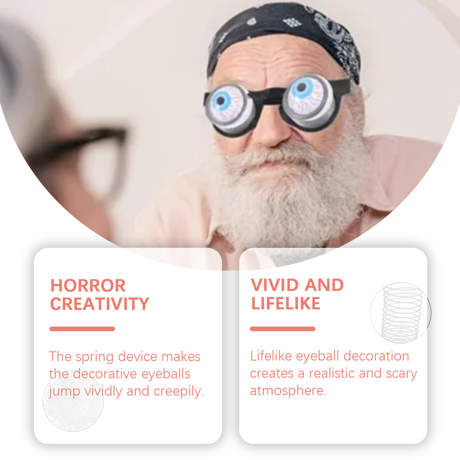 我们的恐怖眼镜含有塑料、金属弹簧。它可以营造出一种逼真而恐怖的氛围。它的使用方法很简单:打开包装,戴上眼镜后装饰性的眼球会随着弹簧弹出来。并且重量轻,舒适,你可以立即创建一个氛围。