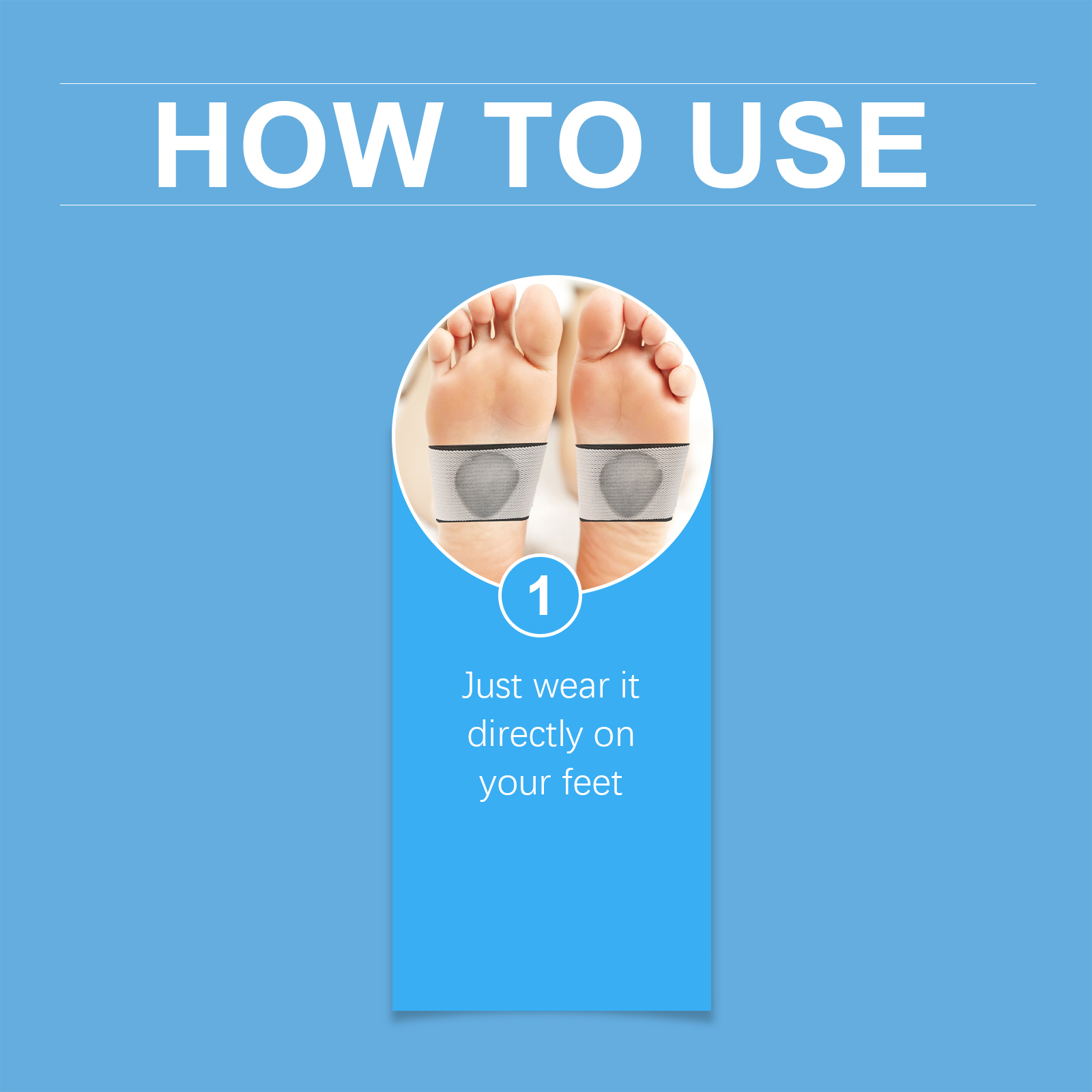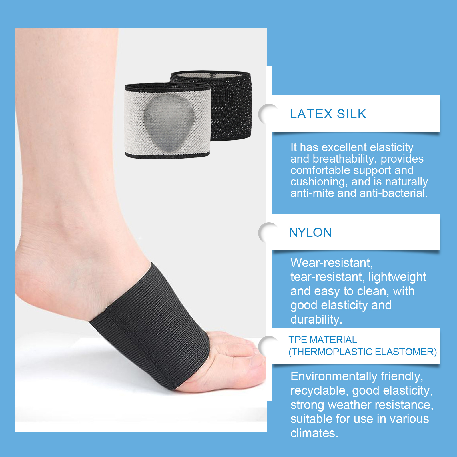 我们的足弓垫含有35%涤纶、5%乳胶丝、15%尼龙。它可以防止足部肿胀,特别适合长时间站立的专业人士。它的使用方法很简单:直接穿在脚上就可以了。并且可以减少足弓压力,有效缓解因长时间站立或行走而引起的足部疼痛。