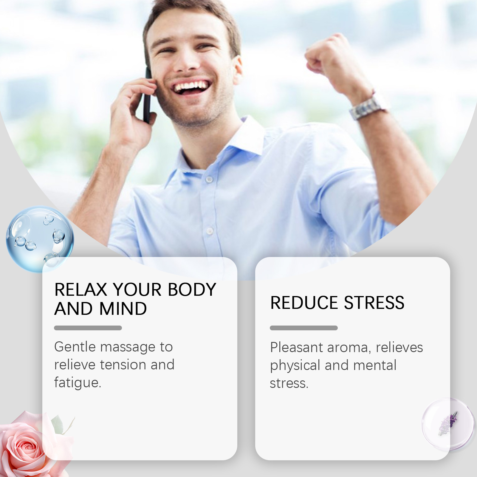我们的男性按摩油含有玫瑰花油、薰衣草油、丁香花油。它可以缓解紧张,促进皮肤柔软。浪漫的花香让人感到快乐;温暖心灵,提升情绪状态,使人感到安心和舒适。清新的香气,缓解疲劳和不适,帮助保持皮肤健康。它的使用方法很简单:1. 清洁和干燥皮肤;2. 取适量精油均匀涂抹于全身;3. 轻轻按摩至吸收。轻柔按摩,舒缓紧张和疲劳。怡人的香气,缓解身心压力。