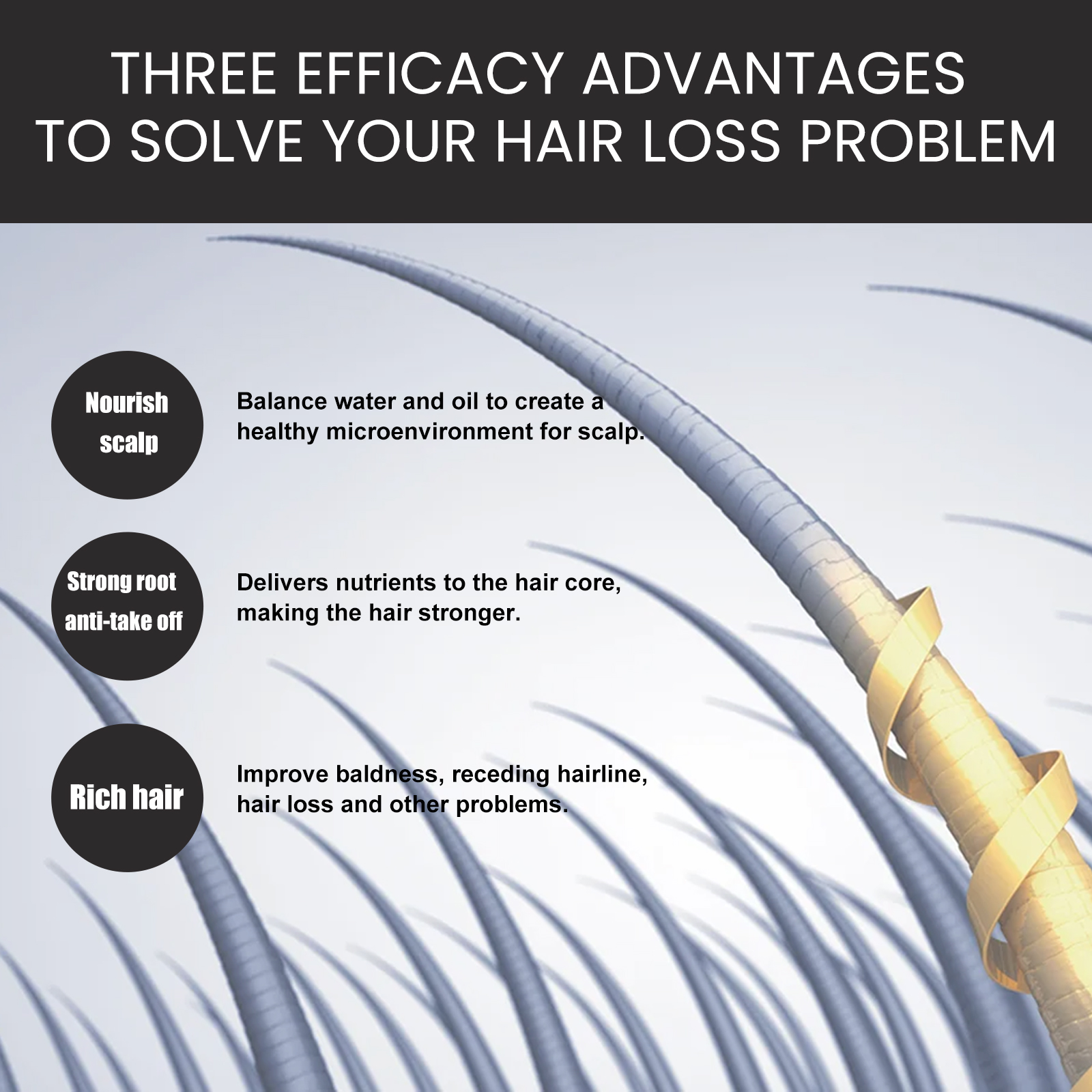 我们的生物素密发精华液有人参提取物、维生素E、生姜提取物。它可以滋养头皮,平衡水油,为头皮创造健康的微环境。强根防脱,将营养输送到发芯,让头发更结实。丰富的头发,改善秃顶、发际线后退、脱发等问题。它的使用方法很简单:首先将适量精华液均匀喷在发根上,用指尖和拇指从头皮两侧按摩到后脑勺。促进精华的吸收,持续两分钟,每天早晚各一次,效果更好。头皮可以完全吸收,不需要清洗。使用后修复受损头皮,促进头发生长,加强头皮健康,减少脱发,强韧发根,使头发更加乌黑浓密有光泽。