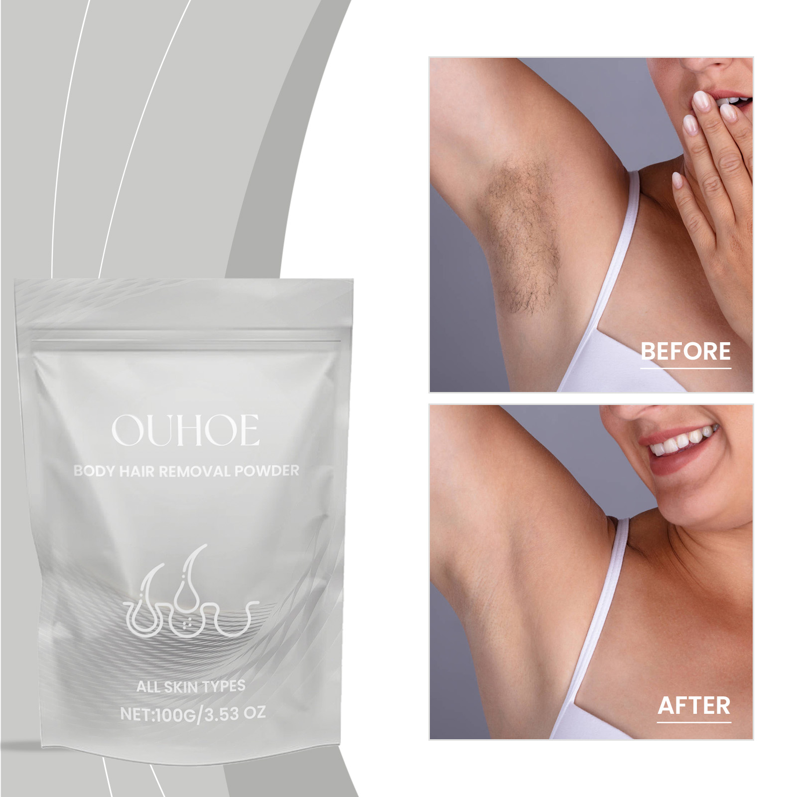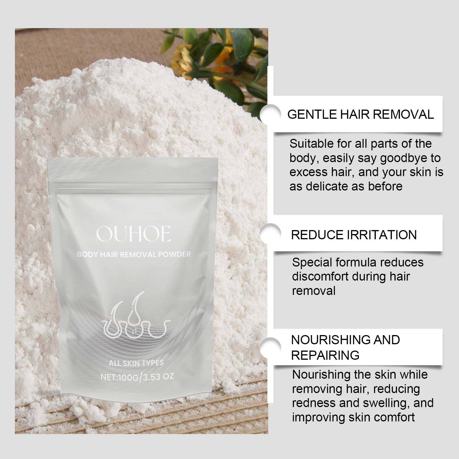 我们的身体脱毛粉含有维生素E、氢氧化钙。它可以给予肌肤温和呵护,改善肌肤光泽。亮的肌肤,自然容光焕发。长效作用,保持肌肤柔滑。它的使用方法很简单:将适量粉末倒入碗中,加入少量水,用搅拌棒搅拌至变得乳状,然后均匀涂抹在需要脱发的皮肤部位,待10分钟后,用附在上面的毛巾轻轻揉搓,最后用清水彻底冲洗干净。并且可以形成保护层,隔离摩擦损伤,也适用于敏感肌肤,安全无忧。