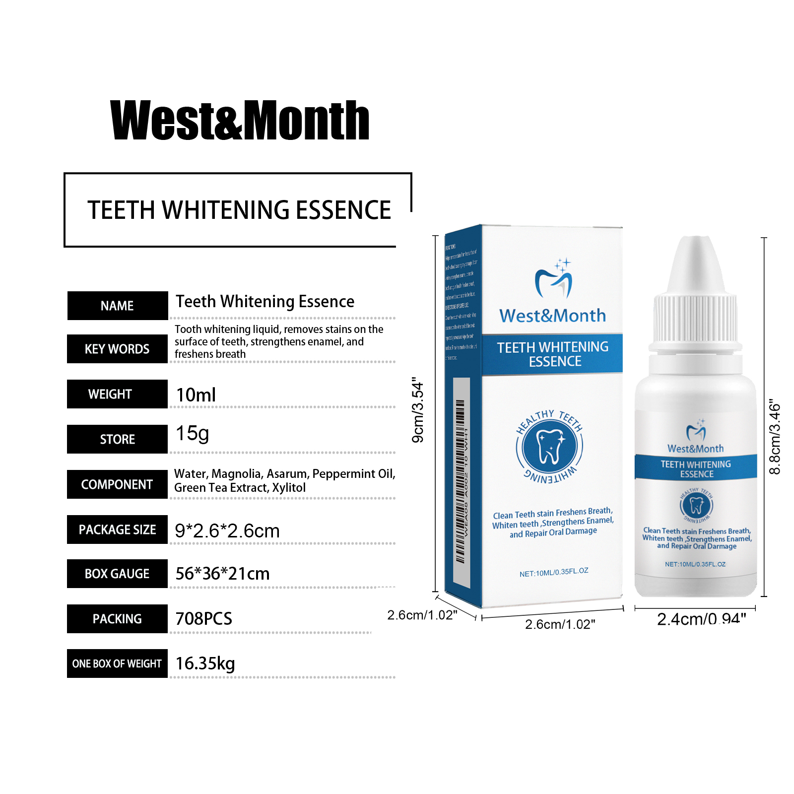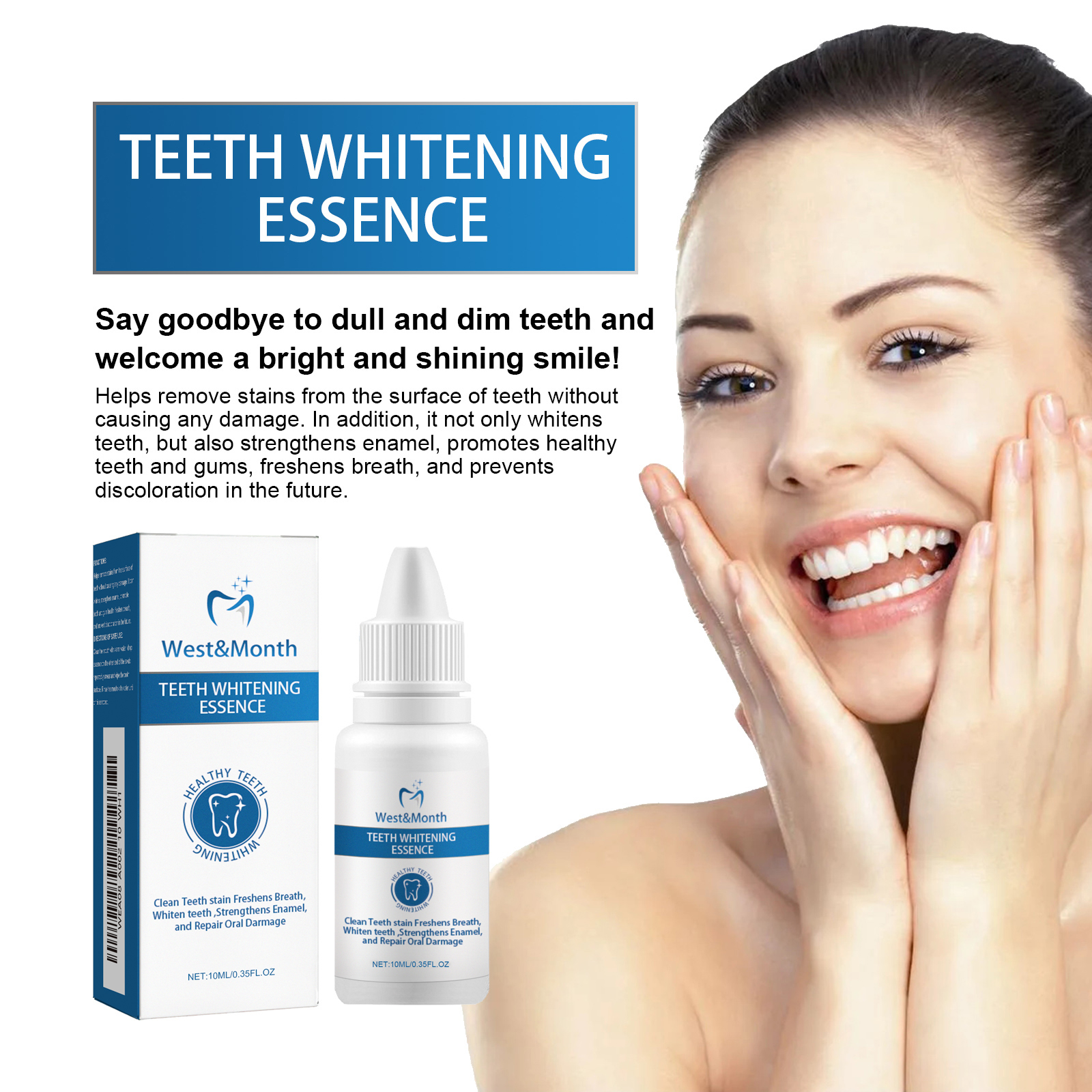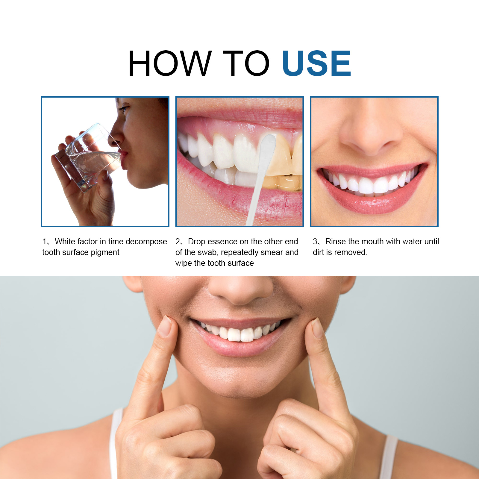 我们的牙齿亮白精华含玉兰、细辛、薄荷油。它可以帮助去除牙齿表面的污渍,而不会造成任何损伤。此外,它不仅能美白牙齿,还能强化牙釉质,促进牙齿和牙龈健康,清新口气,防止日后牙齿变色。它的使用方法很简单:使用前先漱口,将精华液滴在拭子的另一端,反复涂抹、擦拭牙齿表面,再用清水漱口,直到污垢被清除即可。可以深层淡化牙斑,有效去除牙齿污渍,保持口腔健康,消除口腔异味。