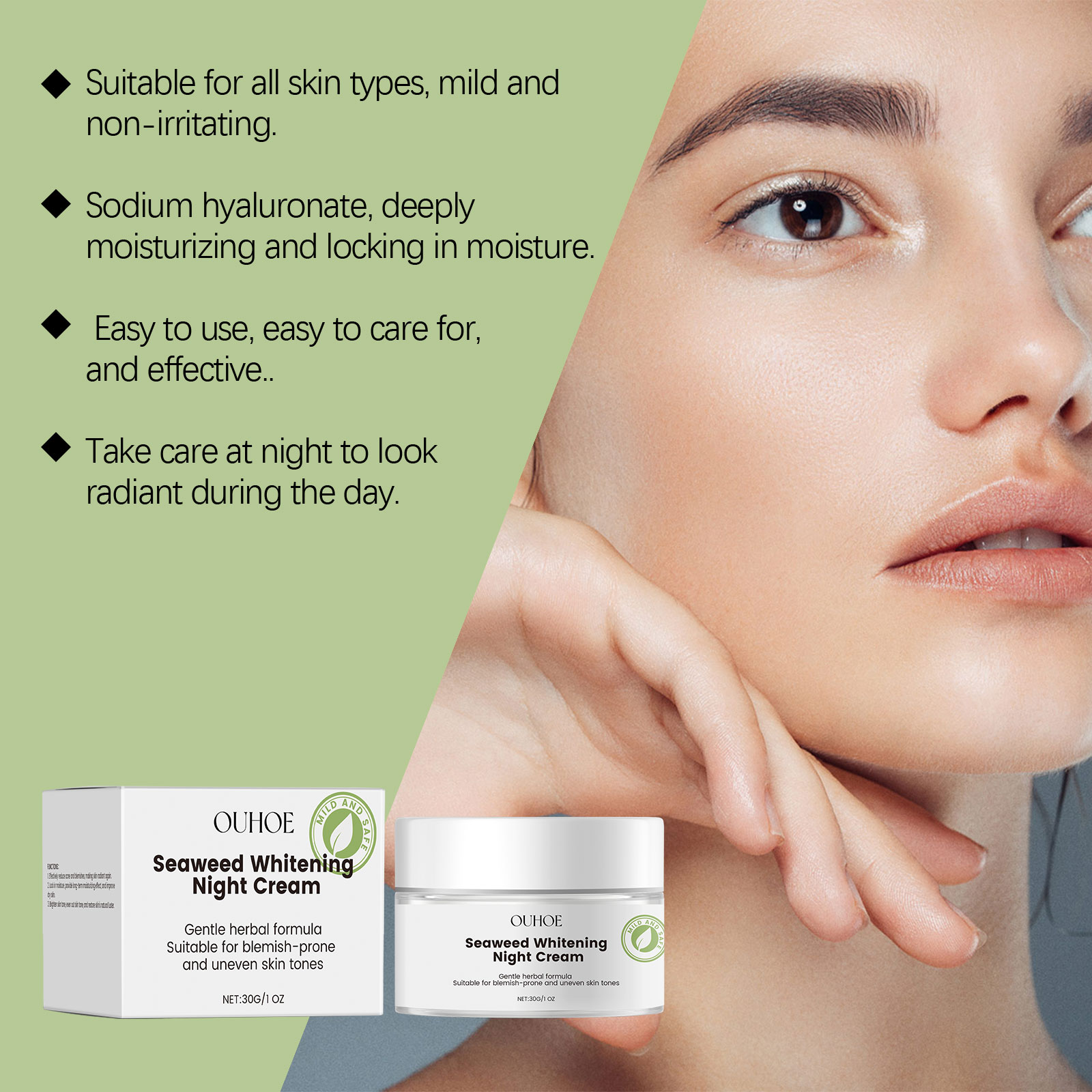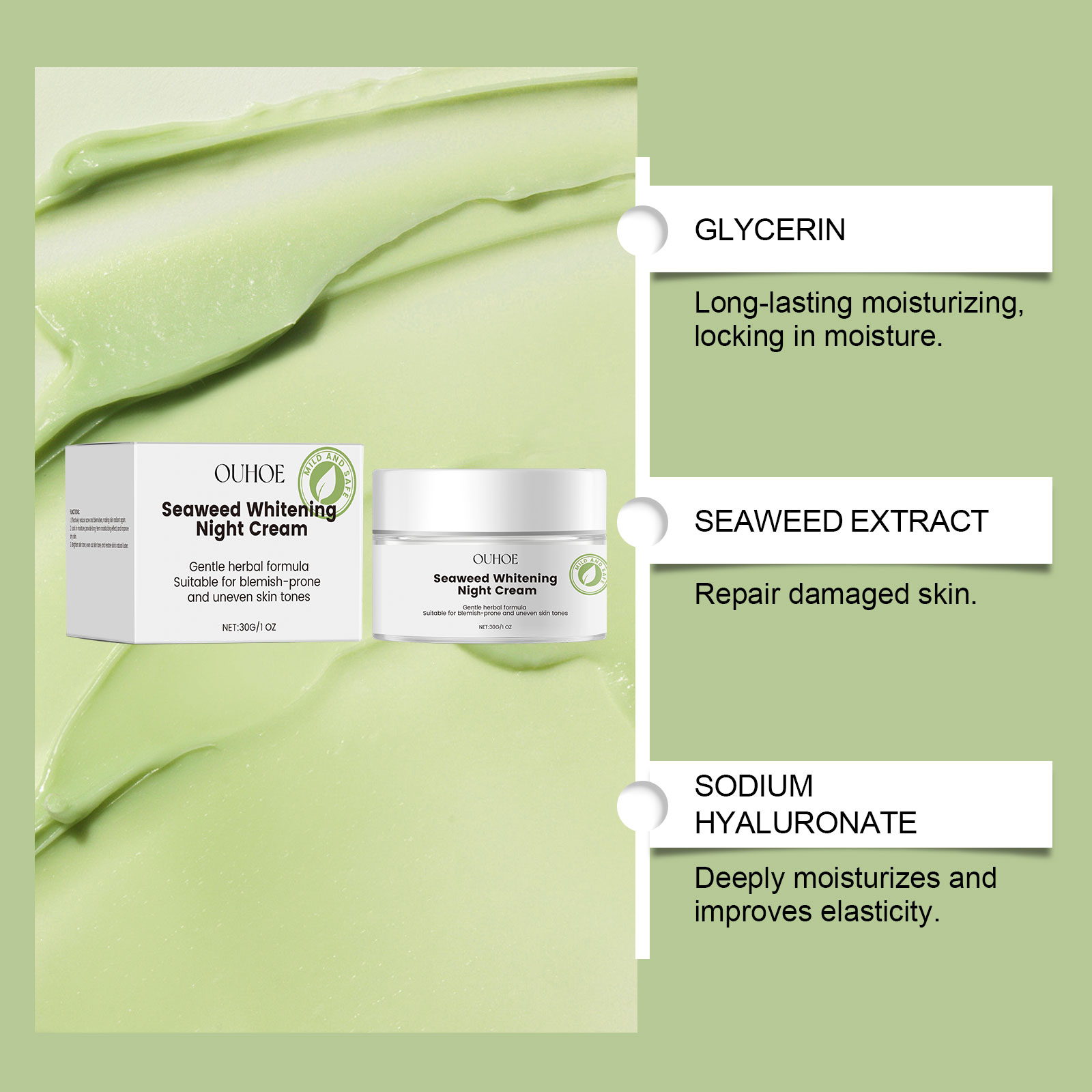 我们的海藻滋养晚霜含有三乙醇胺、透明质酸、大叶海藻提取物。它可以改善皮肤弹性,延缓衰老。它的使用方很简单:洁面后,取适量晚霜均匀涂抹于面部及颈部。轻轻按摩至肌肤吸收,每晚睡前使用效果更佳。并且可以改善肤质,使肌肤更柔软光滑。