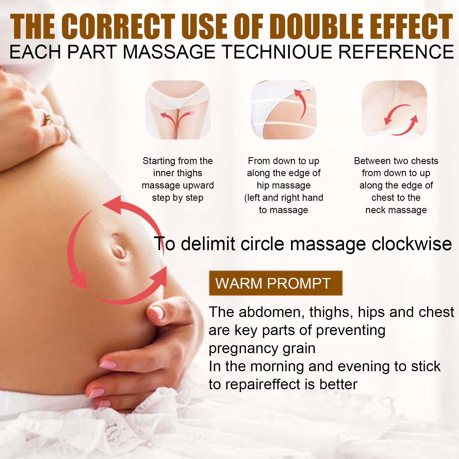 我们的妊娠霜修护霜含有姜黄、维生素C、甘油。它有助于淡化妊娠纹。它的使用方法很简单:每天至少两次(早晚各一次),均匀涂抹于腹部、大腿、臀部等部位并打圈按摩至吸收。建议每日坚持较好。在腹部使用时,从下往上按摩三分钟。乳房使用时,向上按摩乳房下部三分钟。腿部使用时,从膝盖推到大腿内侧,按摩三分钟。臀部使用由下而上,由内而外按摩三分钟。使用后增强皮肤弹性,抑制妊娠纹的生长,重点加强防御,持久的皮肤柔软度。