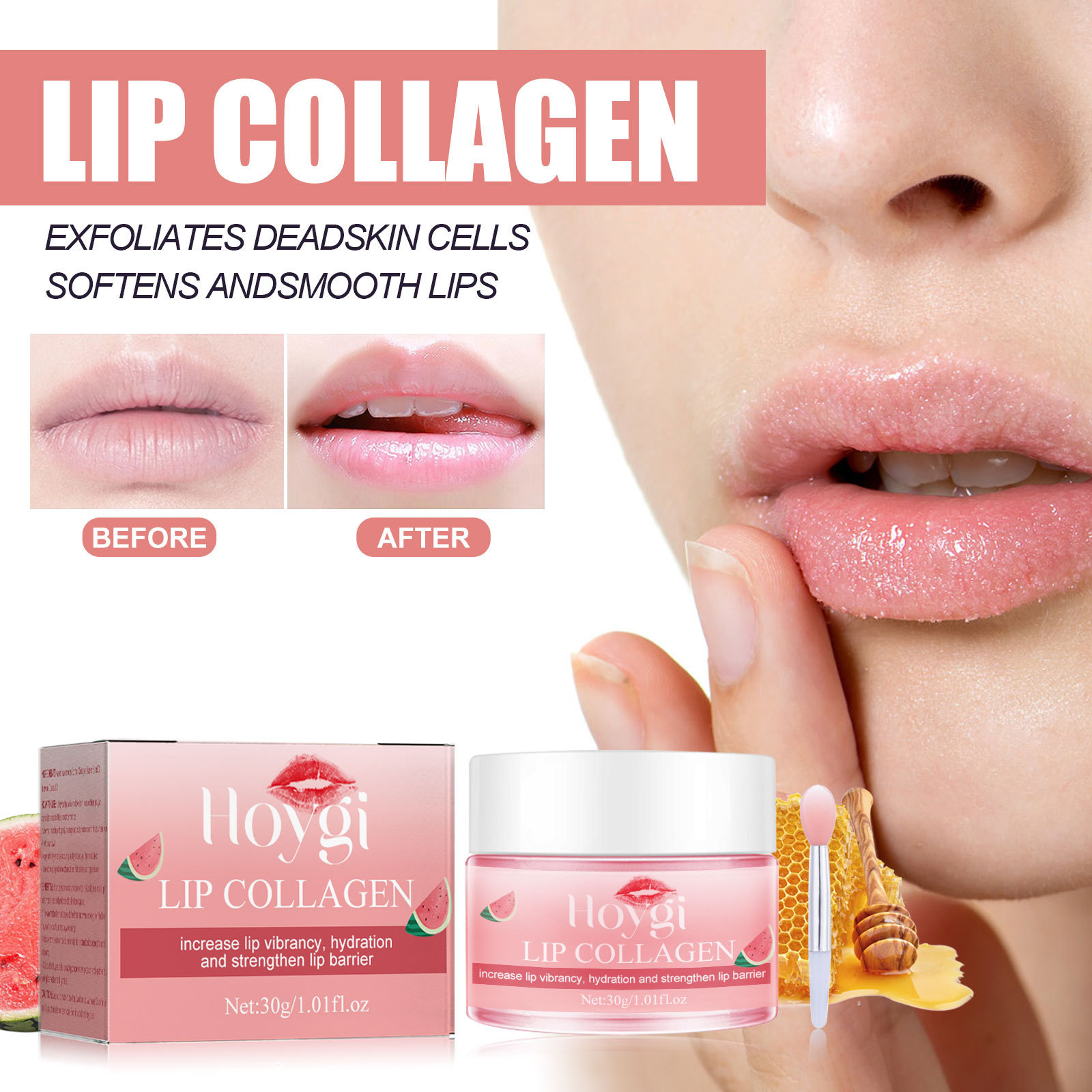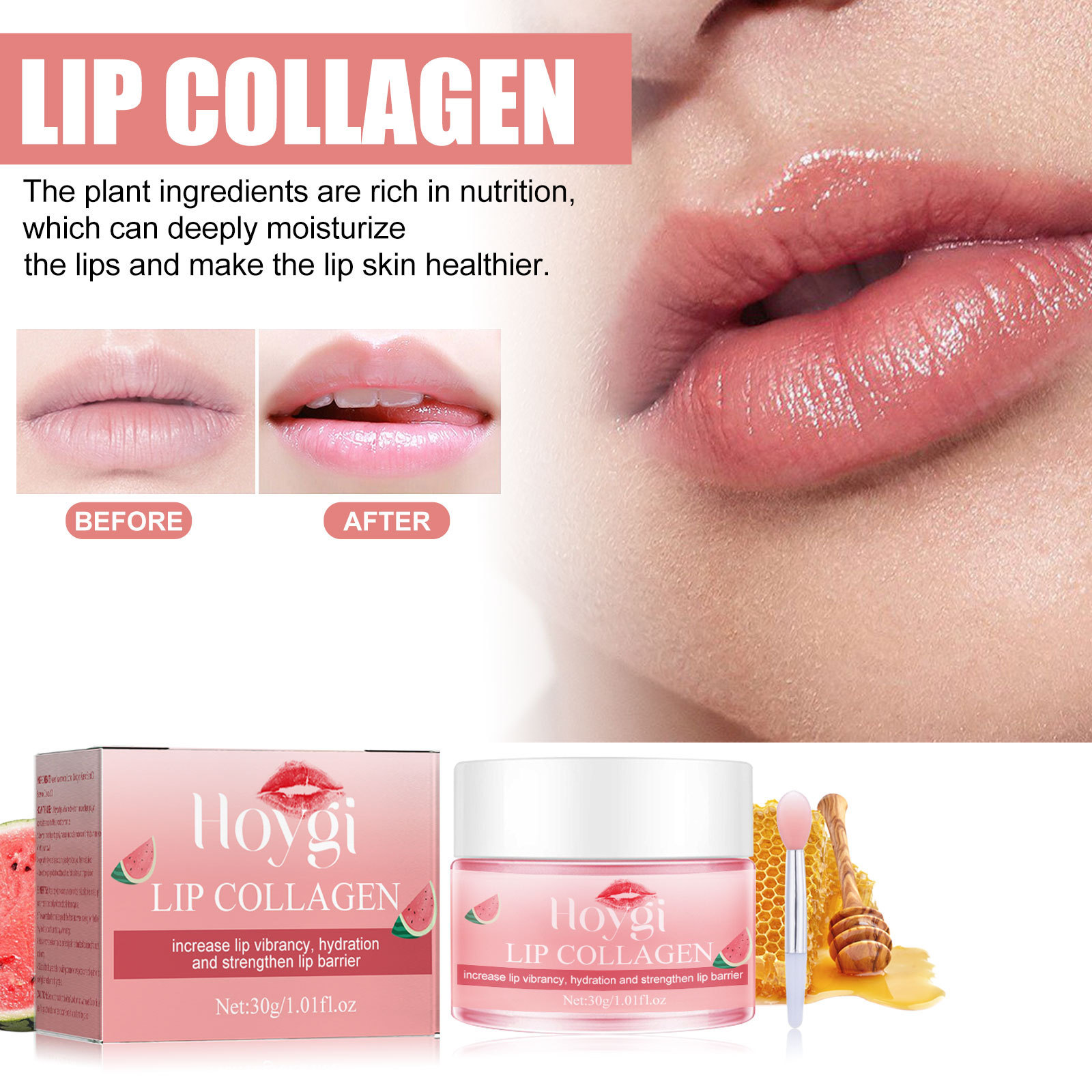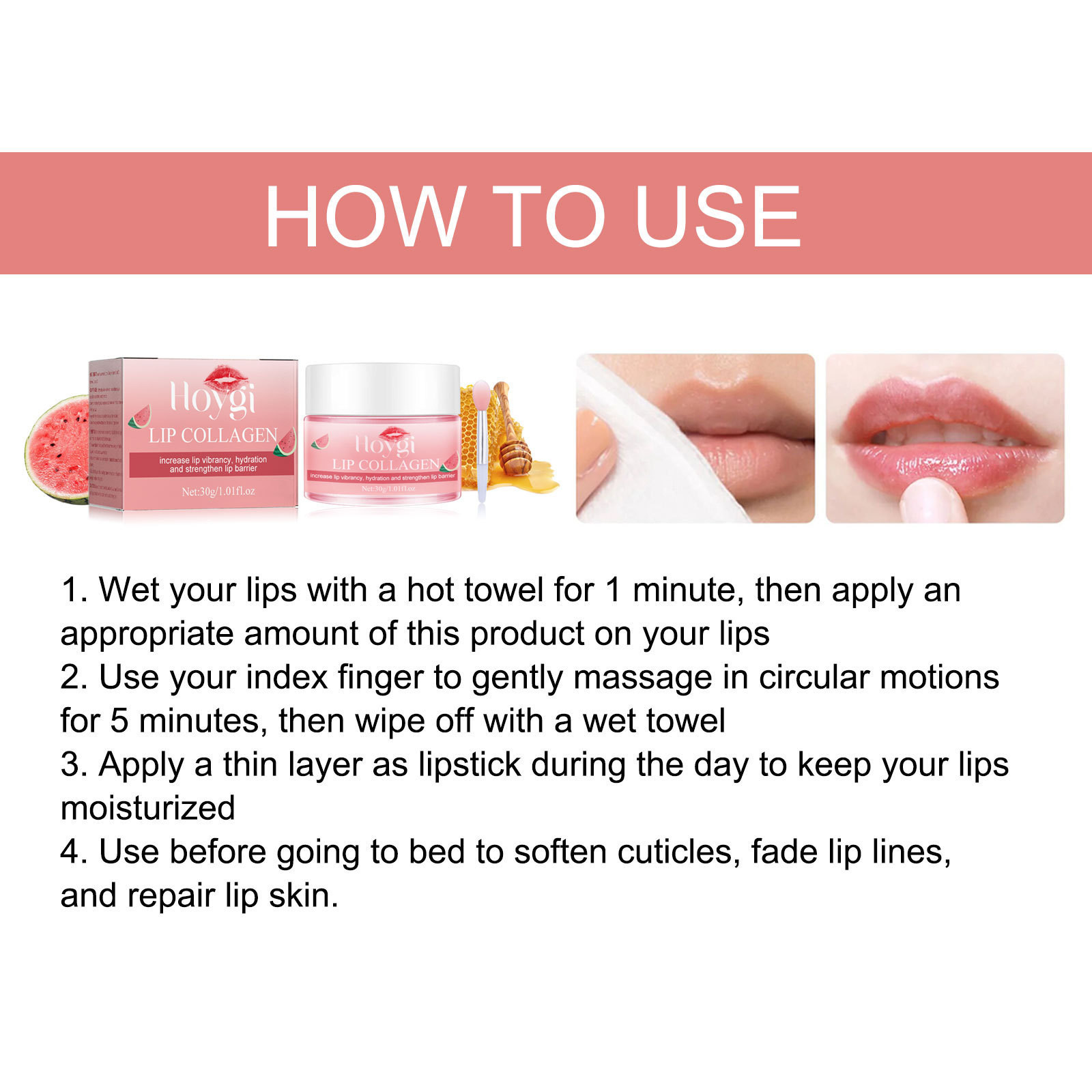 我们的西瓜味唇膜含有蜂蜡、椰子油。它可以深层滋润唇部,令唇部肌肤更健康。它的使用方法很简单:1.用热毛巾沾湿嘴唇1分钟,然后取适量本品涂于唇部。2.用食指轻轻打圈按摩5分钟,然后用湿毛巾擦去。3.白天涂上薄薄的一层作为唇膏,让嘴唇保持滋润。4.睡前使用,软化角质层,淡化唇纹,修复唇部肌肤。并且可以增加唇部活力,保湿,加强唇部屏障。