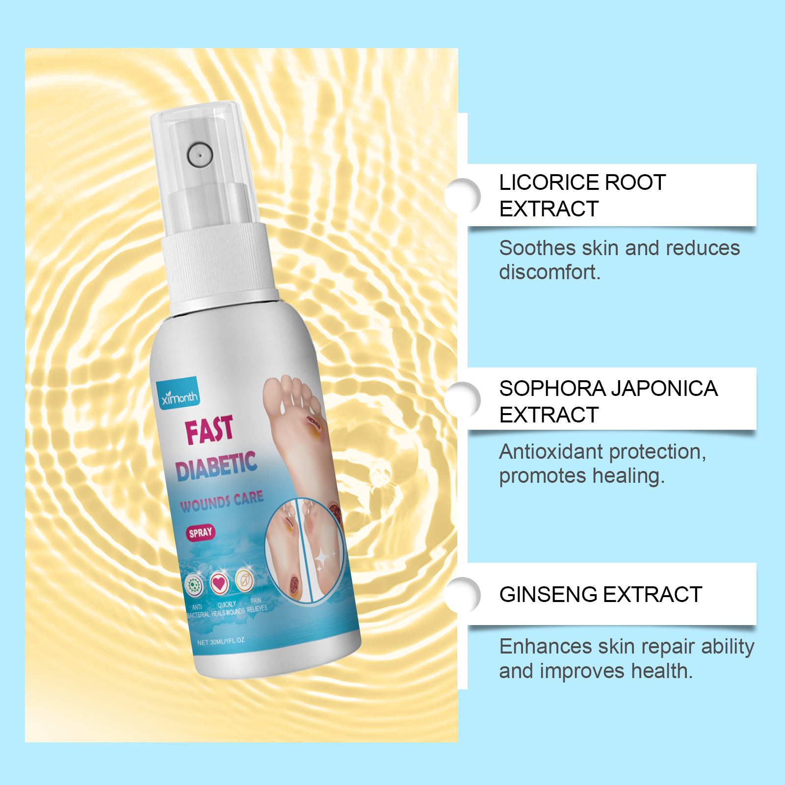 我们的皮肤护理喷雾含有甘草根提取物、槐花提取物、人参提取物。它可以提供深层护理,增强肌肤修复能力;温和配方,适合所有肤质,使用安全。它的使用方法很简单:1.保持伤口干燥;2.取适量本品均匀喷于创面;3.等它变干。高效配方帮助伤口快速愈合,减少不适。设计方便,喷雾使用,操作简单。