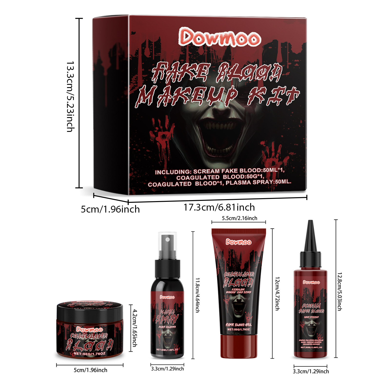我们的万圣节化妆套装含有尖叫假血:羧甲基纤维素、颜料,凝固的血液:山梨酸钾、颜料,凝固血膏:羧甲基纤维素、色素,血浆喷涂:颜料、甘油。它可以营造逼真的视觉效果,增强节日气氛,给人一种激动人心的效果。非常适合万圣节化妆和其他场景,包括小丑,怪物,恶作剧等。它的使用方法很简单:1. 清洁皮肤并保持干燥;2. 用指尖取适量本品涂抹于皮肤上;3. 取适量本品均匀喷于面部、手臂或腿部等部位。4. 要去除假血,只需用温肥皂水清洗即可。它使用安全的成分,不会刺激皮肤,让你自信地使用它。适合所有皮肤类型,安全使用。