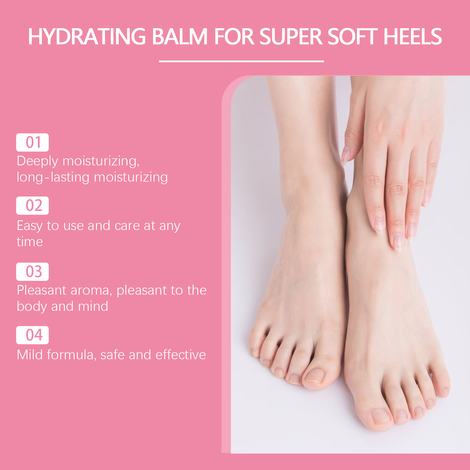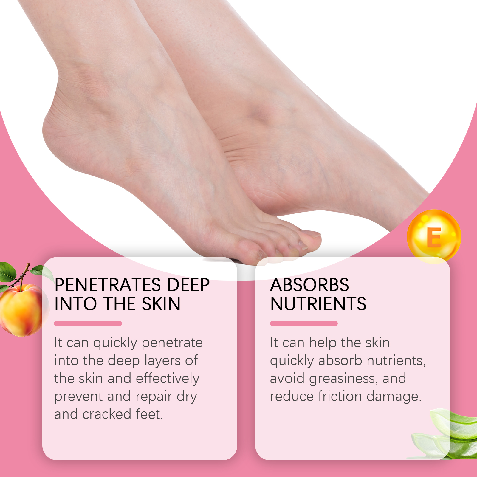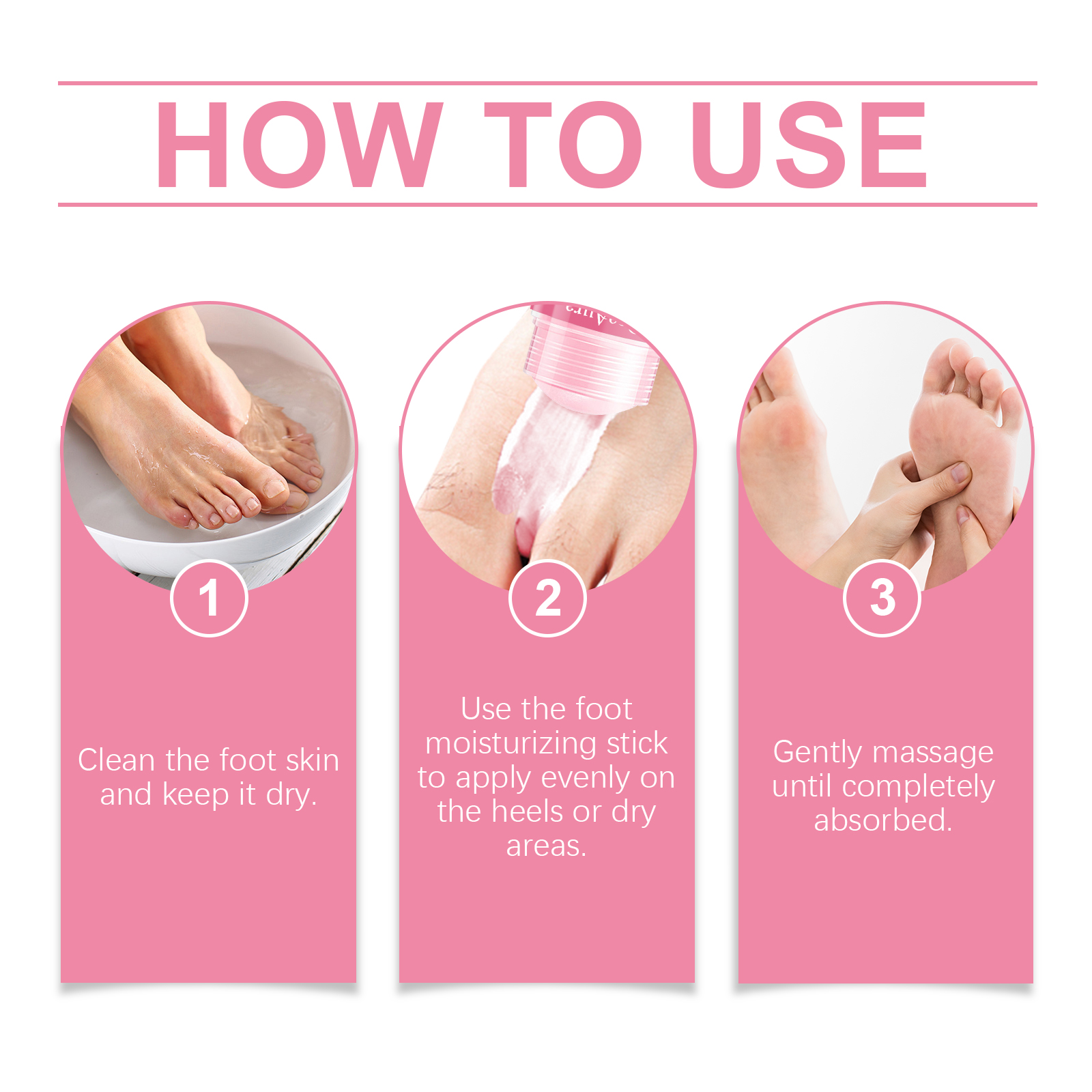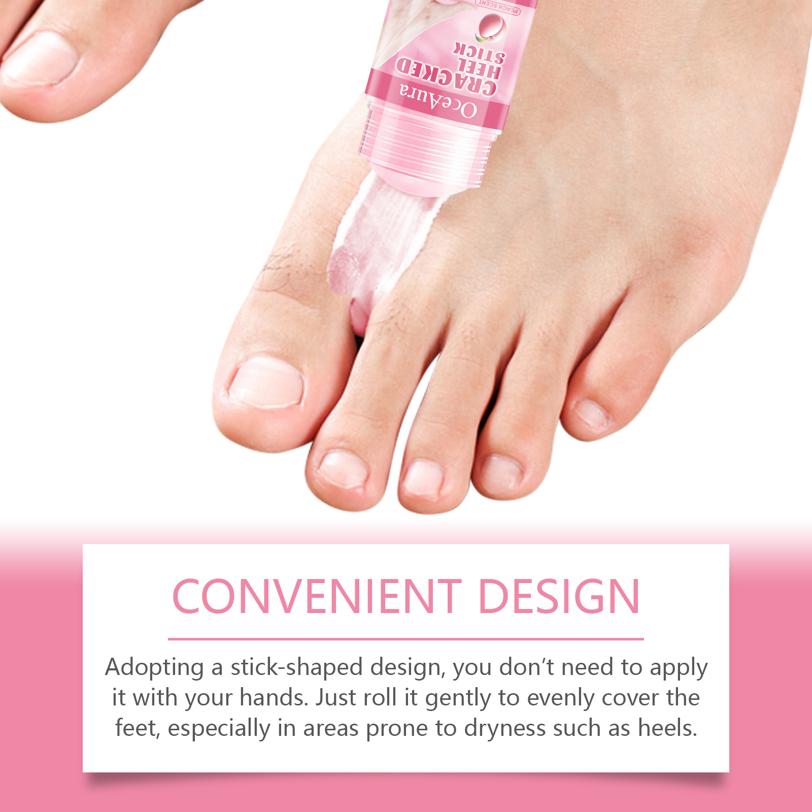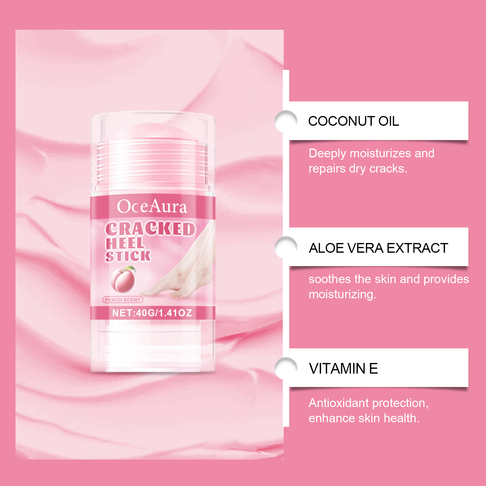 我们的蜜桃护足保湿棒含有椰子油、芦荟提取物、维生素E。它可以迅速渗透到皮肤深层,有效预防和修复干燥和干裂的脚。它的使用方法很简单:1. 清洗足部皮肤,保持干燥。2. 用脚部保湿棒均匀涂抹在脚后跟或干燥部位。3. 轻轻按摩直至完全吸收。帮助肌肤快速吸收营养,避免油脂,减少摩擦损伤。
