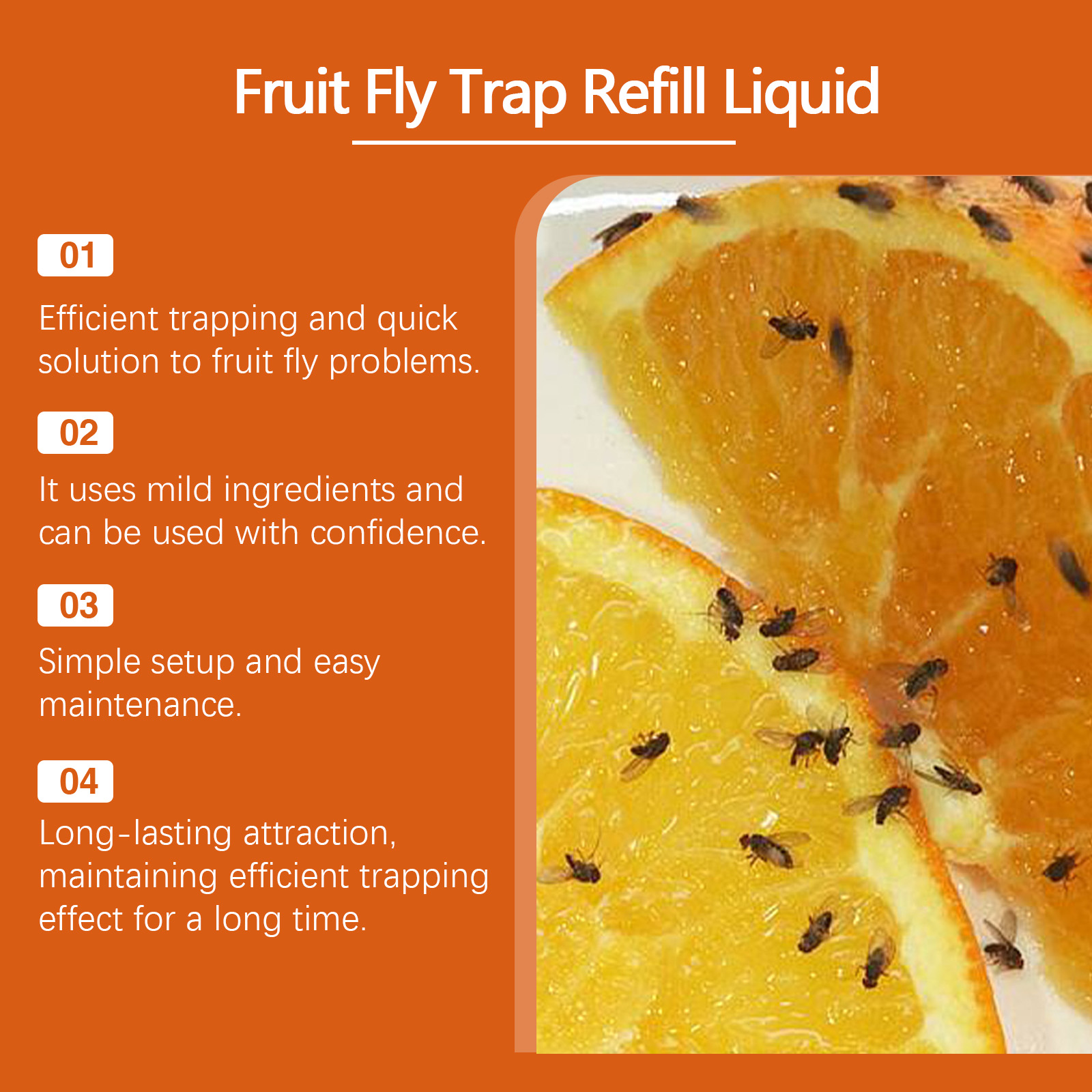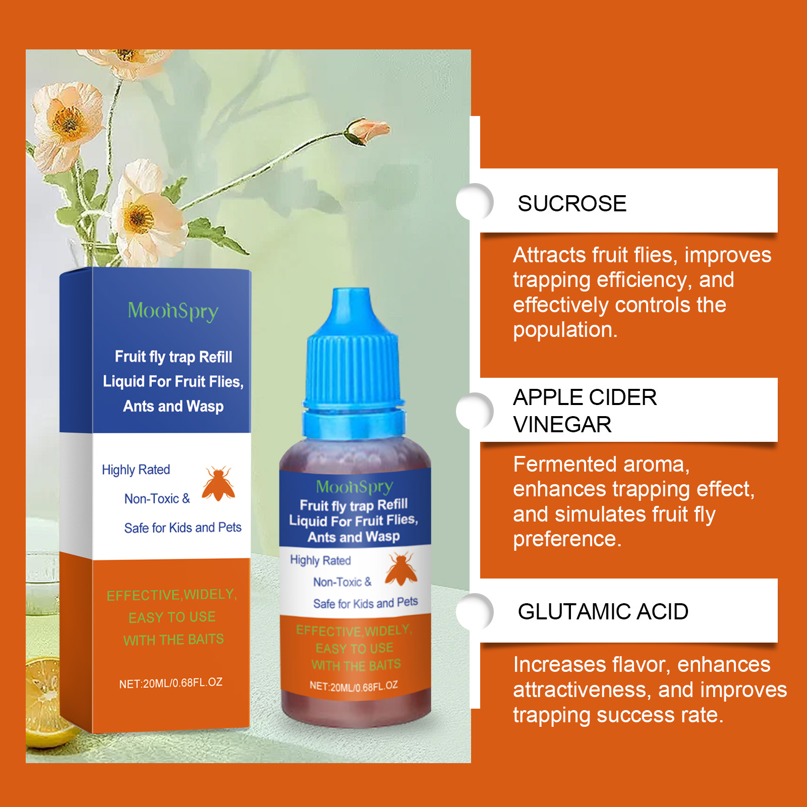 我们的果蝇诱捕液含有蔗糖、苹果醋、谷氨酸。它可以吸引果蝇,提高捕蝇效率,有效控制种群数量。发酵香气,增强诱捕效果,模拟果蝇偏好。增加风味,增强吸引力,提高嫁接成功率。它的使用方法很简单:将这种产品倒入捕蝇器中,放在果蝇和其他昆虫容易出现的地方。使用温和的配方来减少刺激。长期保持高捕获率,减少重复使用。混合蔗糖和苹果醋可以有效地捕捉果蝇。