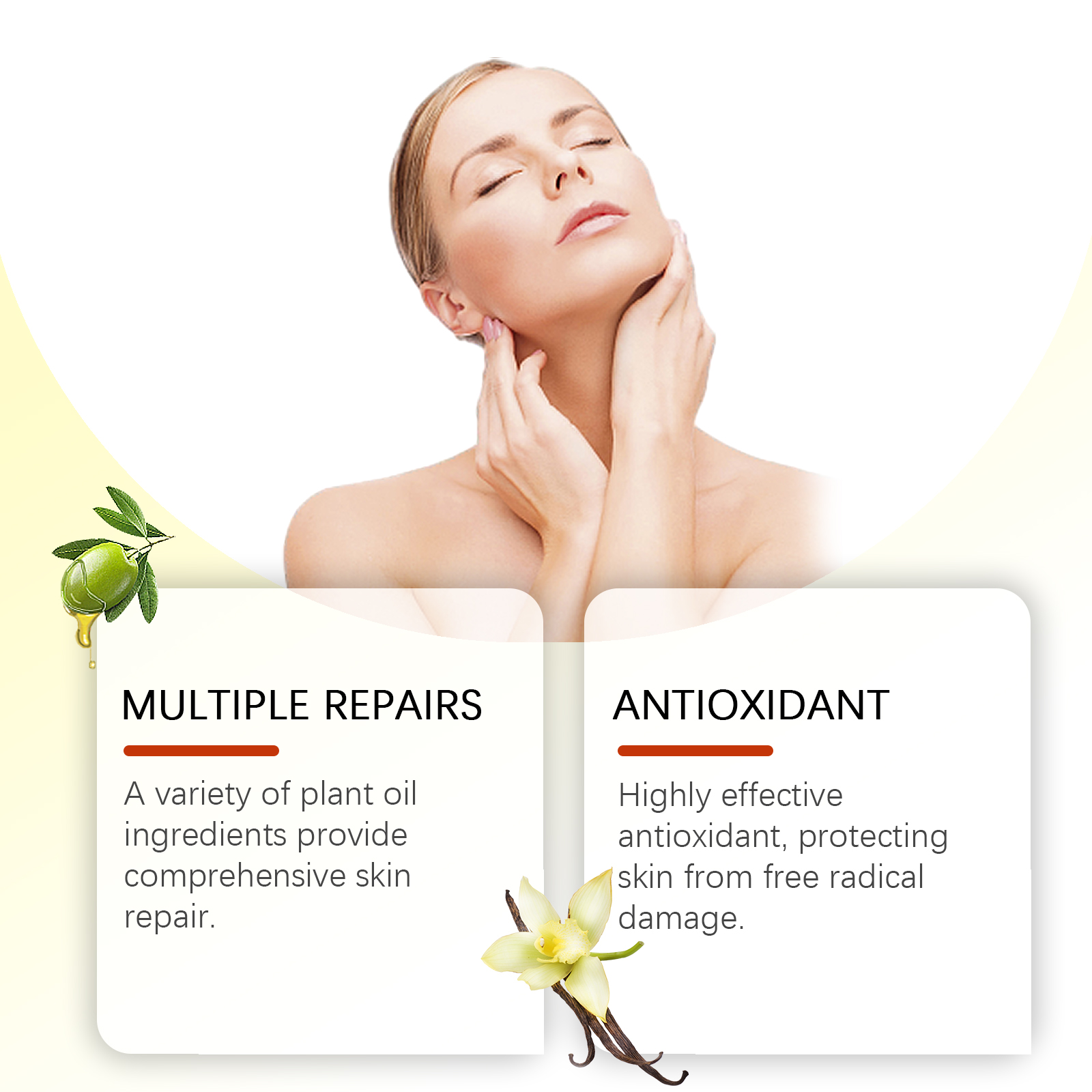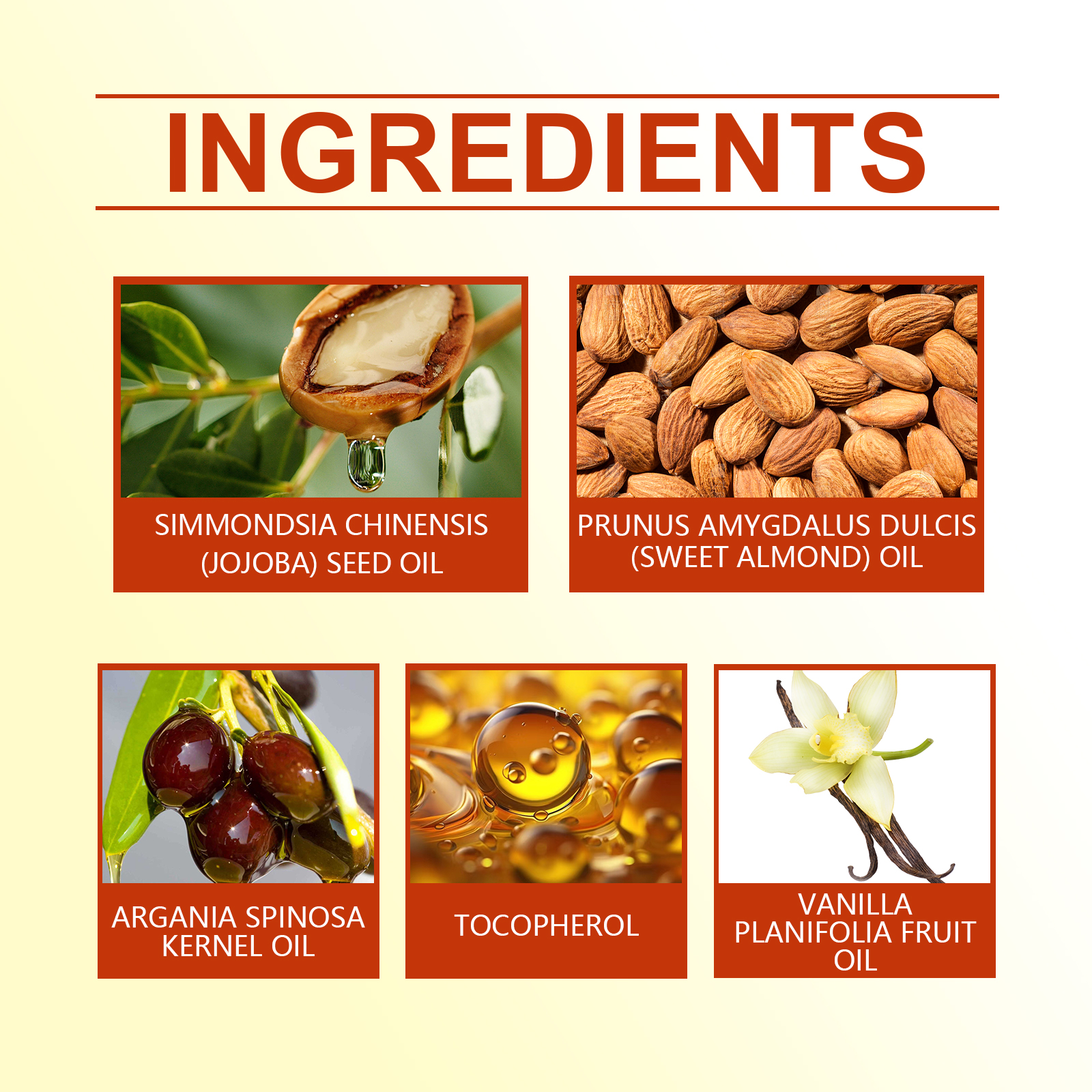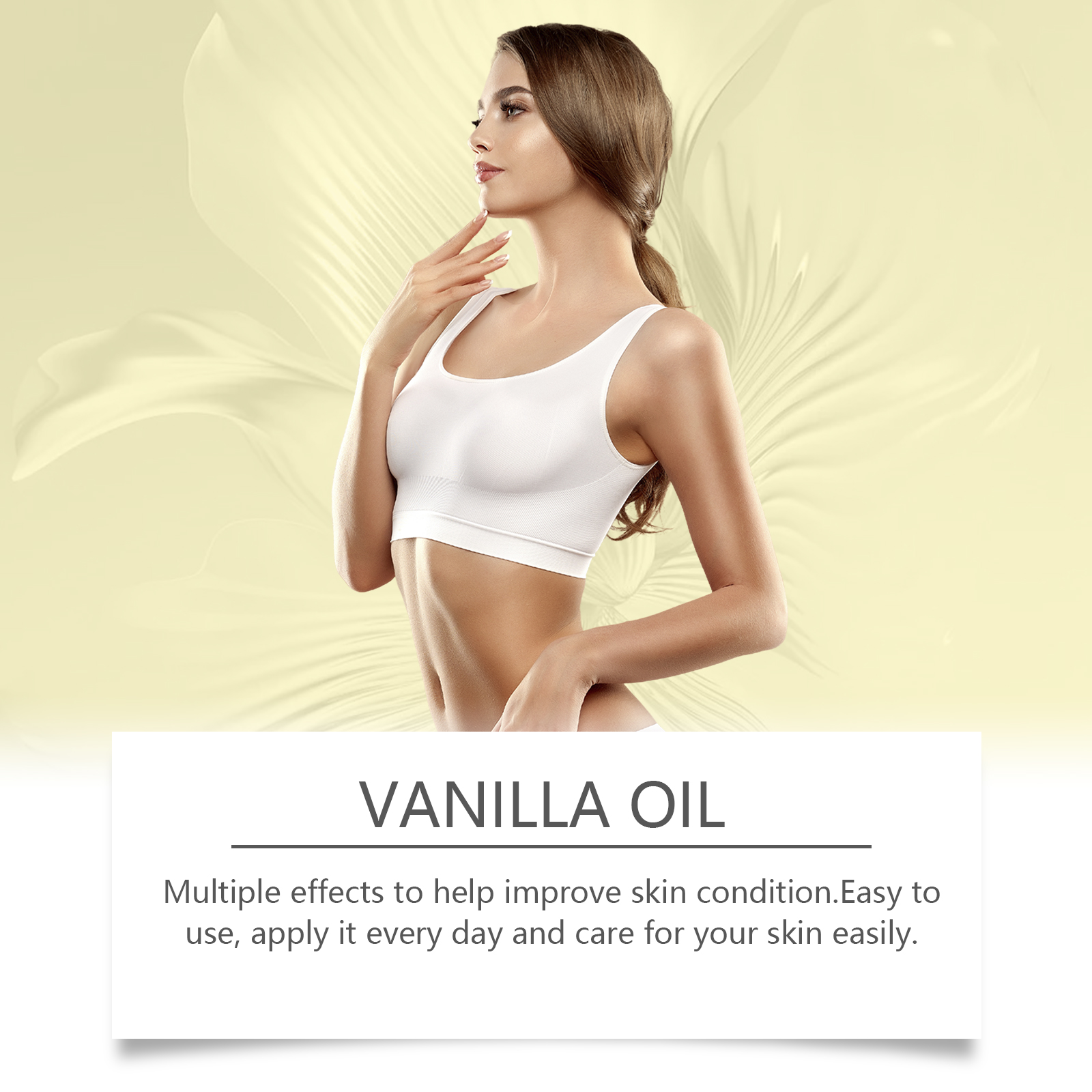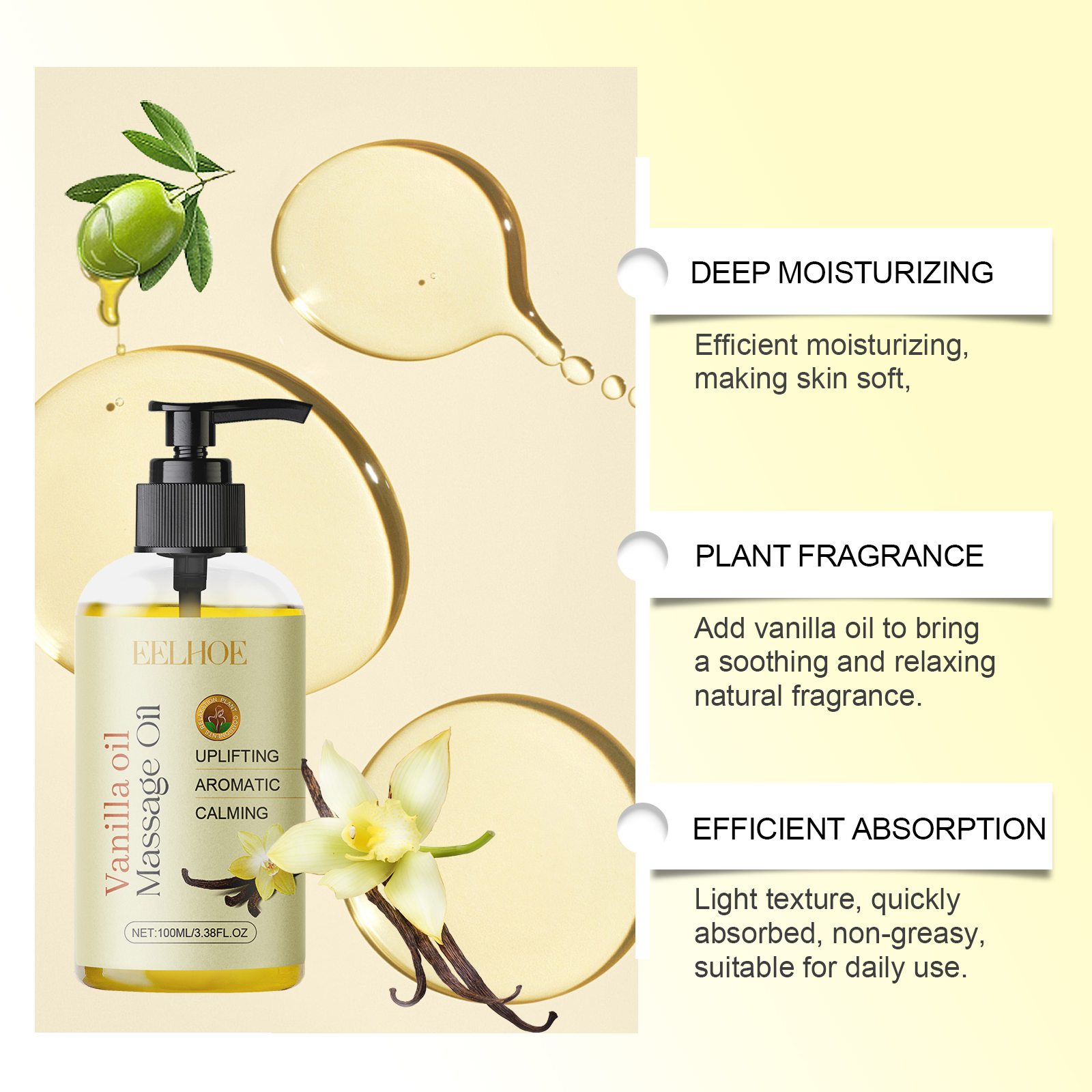 我们的香草身体精油含有摩洛哥坚果油、维生素E、香草油。它可以高效保湿。使皮肤柔软,加入香草油,带来舒缓和放松的自然香味。质地轻盈,吸收快,不油腻,适合日常使用。它的使用方法很简单:1.清洁皮肤,保持干燥。2.取几滴按摩油均匀涂抹在肩膀、手臂、大腿和其他部位。3.轻轻按摩以促进吸收。多种植物油成分提供全面的皮肤修复。高效抗氧化,保护皮肤免受自由基伤害。
