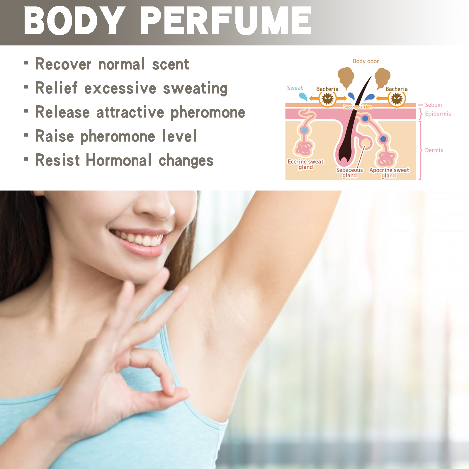 我们的身体香水,由茉莉花油、桂花油、玫瑰花油精心调配而成。专为消除汗水和狐臭,提高你的自然费洛蒙生产和刺激情绪,迷人宜人的女性香水设计。使用方法极为便捷:取适量本品均匀涂抹于手腕、耳后、颈部等想留香的部位,自然散发出迷人的芬芳。香水的气味可以有效地影响信息素,信息素是一种化学信使,在吸引异性方面起着至关重要的作用。