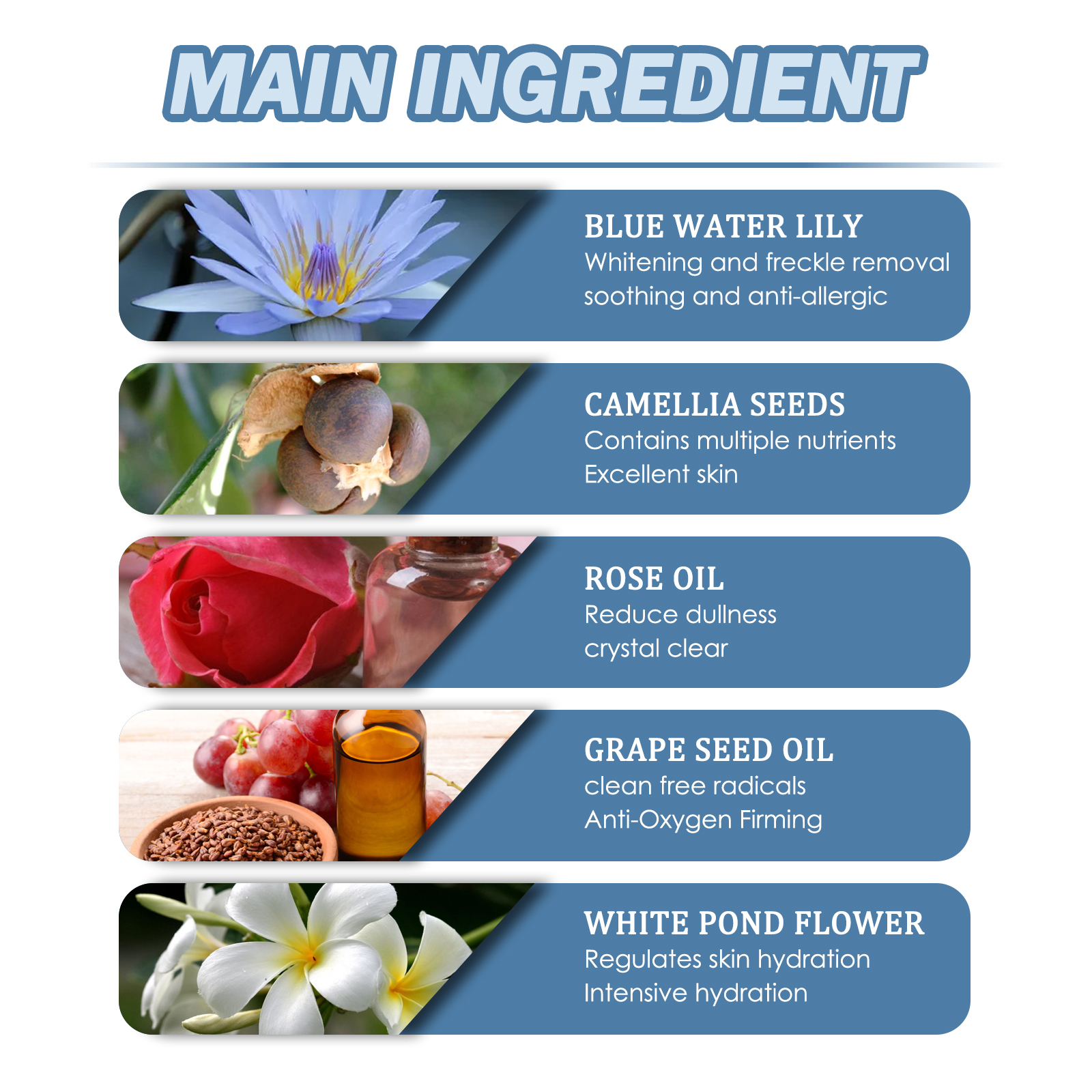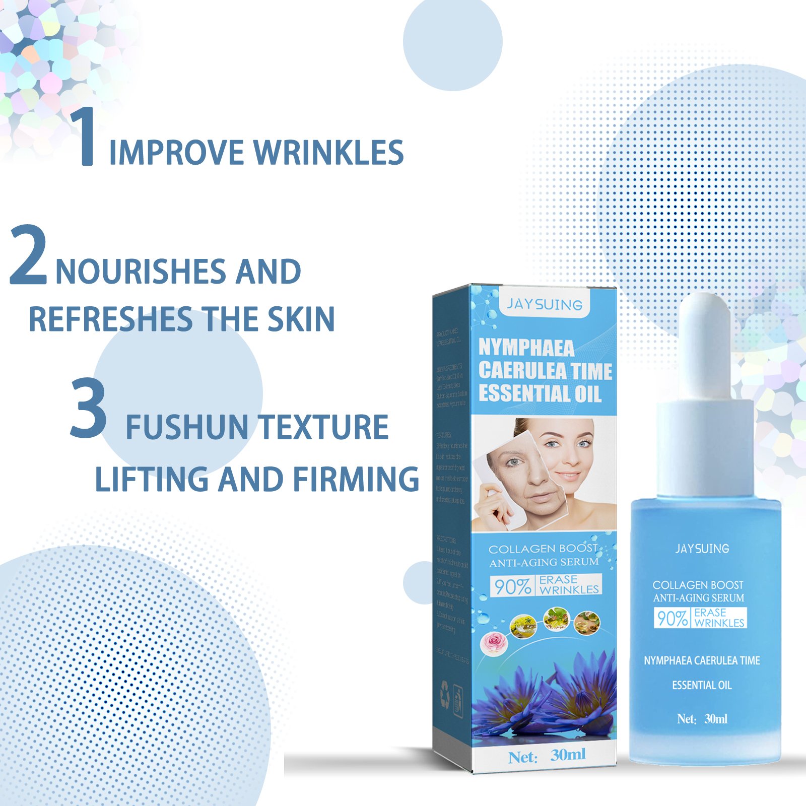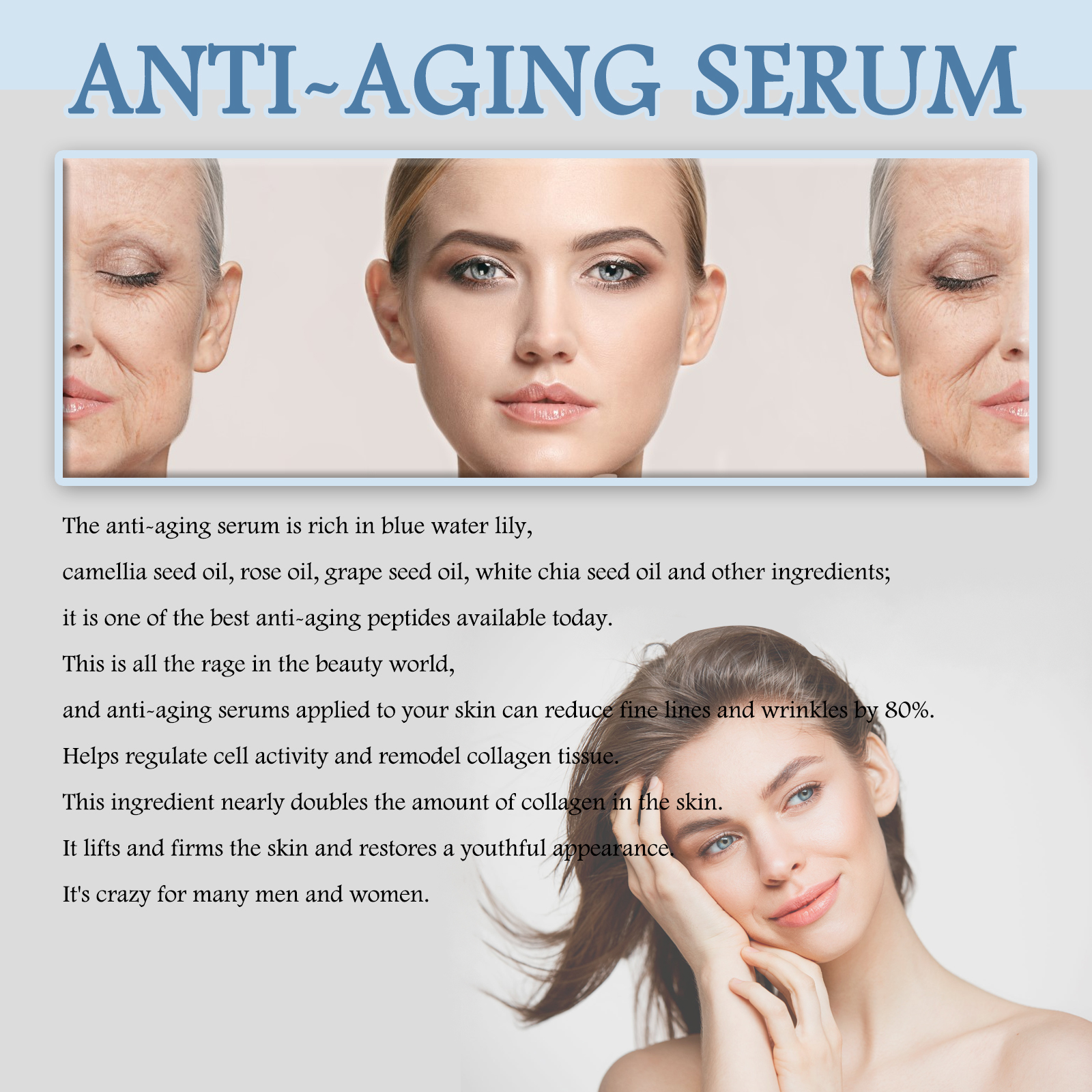 我们的防衰老精华液含有蓝睡莲,山茶籽,玫瑰精油。它可以补充抗氧化物质,帮助减少自由基的产生,增加皮肤弹性,补充胶原蛋白或酶,有效延缓衰老,延缓衰老的速度,改善皱纹,滋养和清新皮肤,抚顺质感,提升紧致。它的使用方法很简单:先洗脸,擦干净;取适量精华液滴于面部,从面部中部向侧面轻轻按摩,直至吸收;完成了!早晚一致使用,随着时间的推移看到效果。在皮肤上涂抹抗衰老精华液可以减少80%的细纹和皱纹。帮助调节细胞活性和重塑胶原组织,提振和紧致皮肤,恢复年轻的容颜。