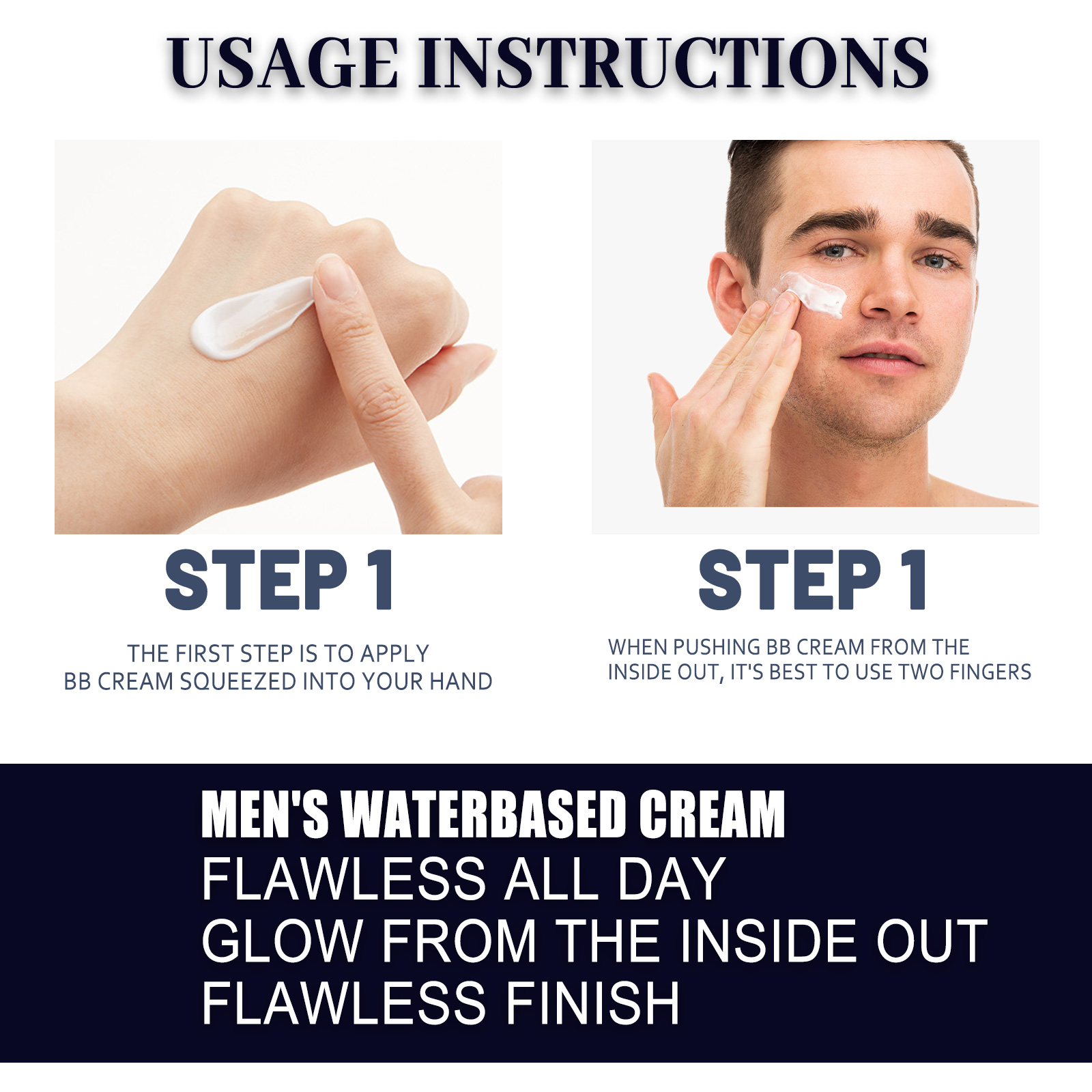 我们的男士BB霜含有烟酰胺、苦参提取物、石斛蒸汽提取物。它有助于有效的遮瑕瑕疵。它的使用方法很简单:将BB霜挤在手上,在面部从内而外推BB霜时,最好用两根手指。使用后遮瑕亮白,自然清爽,防水防汗。