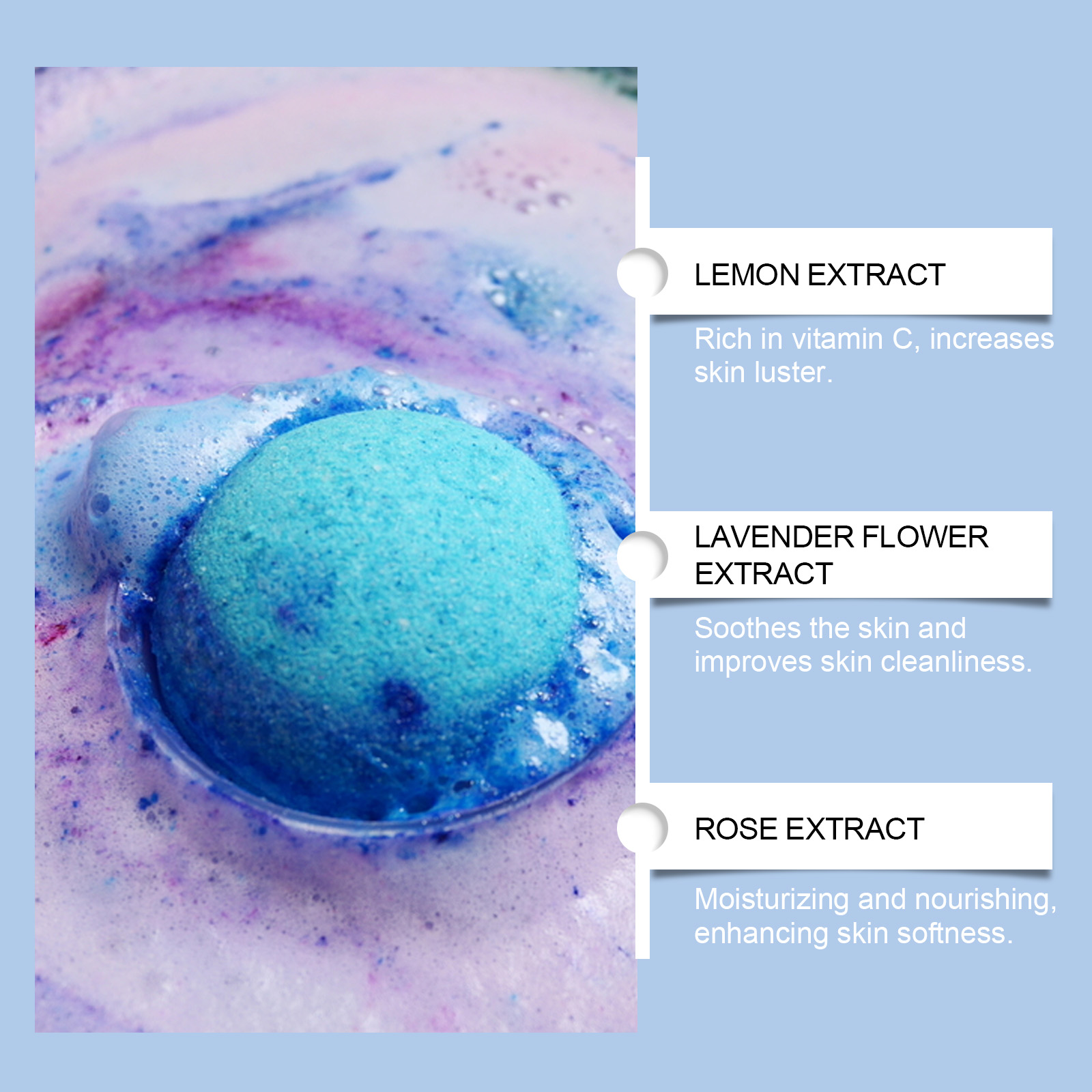 我们的彩色盐浴球,由薰衣草花提取物、玫瑰花提取物精心调配而成。专为沐浴后的肌肤散发出优雅的花香设计。使用方法极为便捷:把浴缸里装满温水,选择一个浴球,放入水中,等待溶解,享受20-30分钟的沐浴时间。并且可以迅速溶解,产生细腻丰富的泡沫,为肌肤带来细腻的洁面效果。
