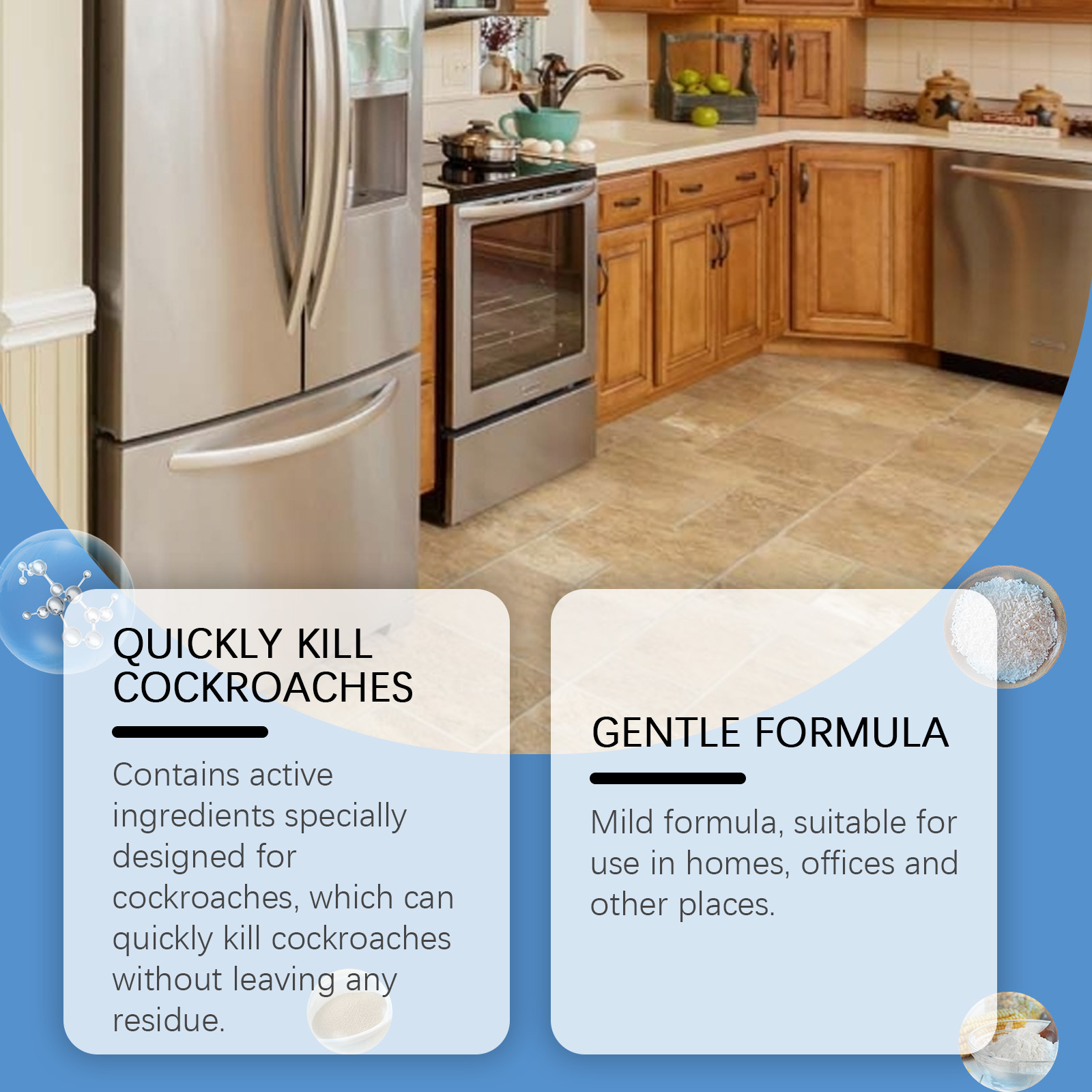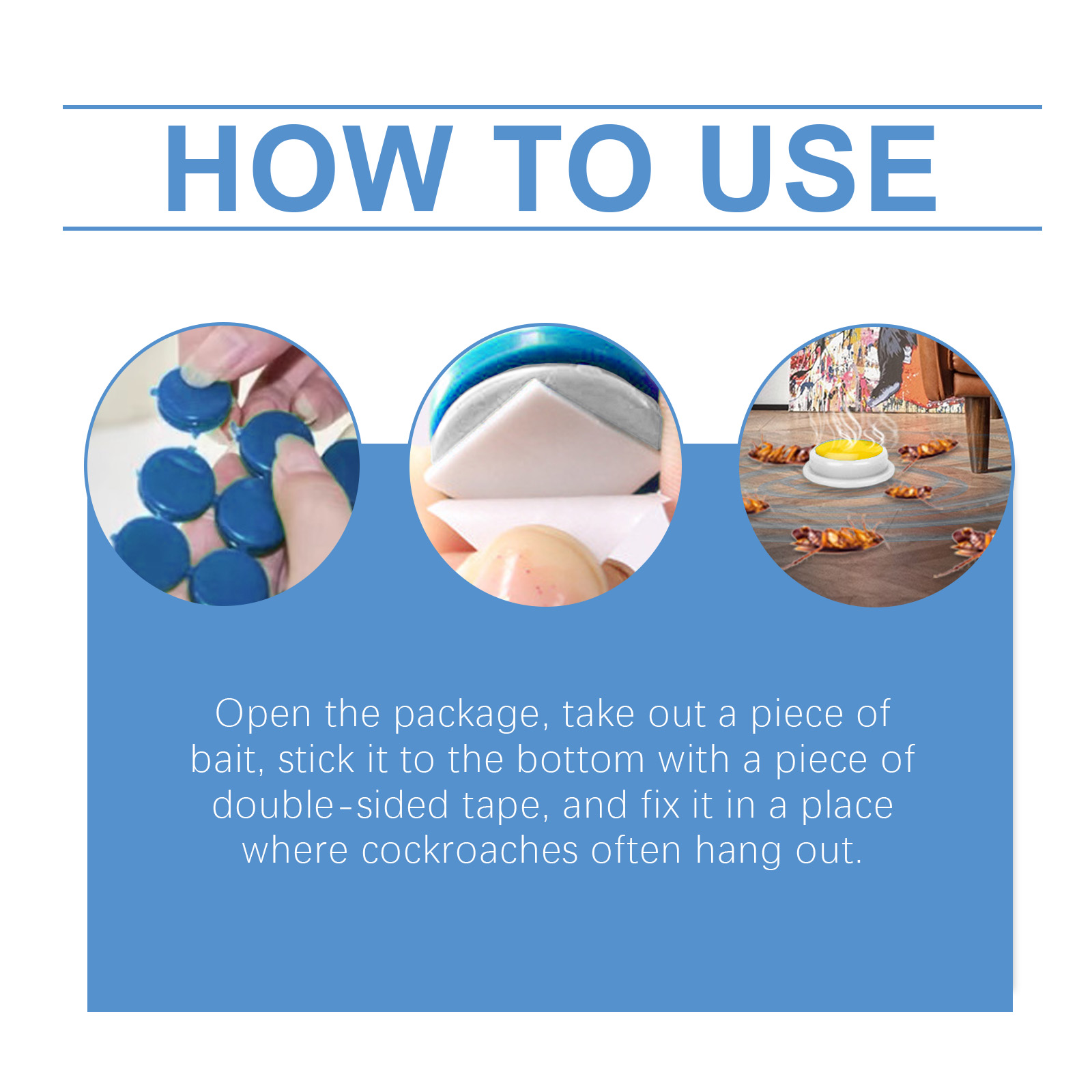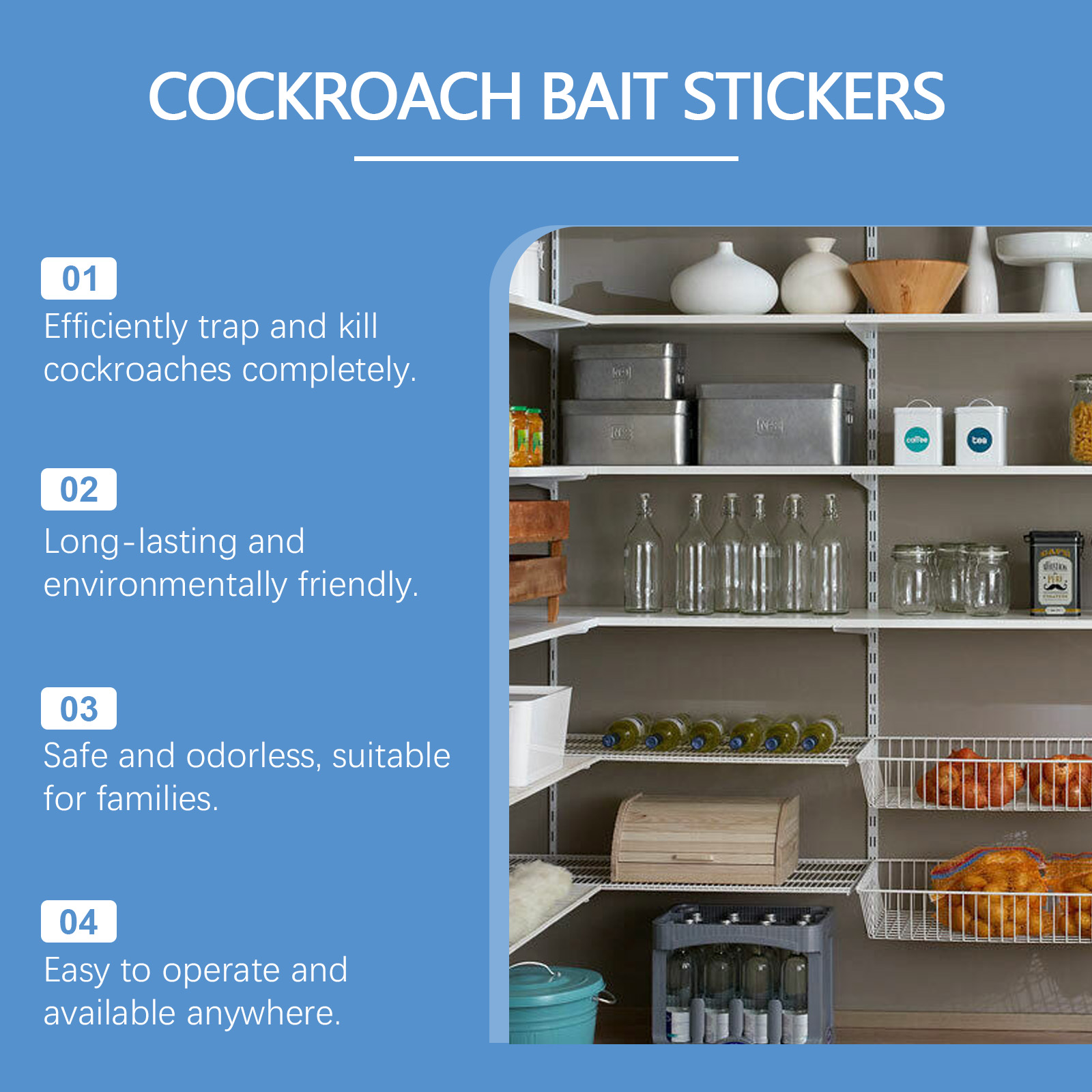 我们的蟑螂诱捕器含有玉米淀粉、植物油、葡萄糖。它可以作为吸引蟑螂吃的基质;增加诱饵的吸引力和耐久性。强大的杀虫剂成分确保蟑螂被迅速消灭。它的使用方法很简单:打开包装,取出一块诱饵,用一块双面胶带把它粘在底部,固定在蟑螂经常出没的地方。快速杀死蟑螂,不留任何残留。配方温和,适合家庭、办公室等场所使用。
