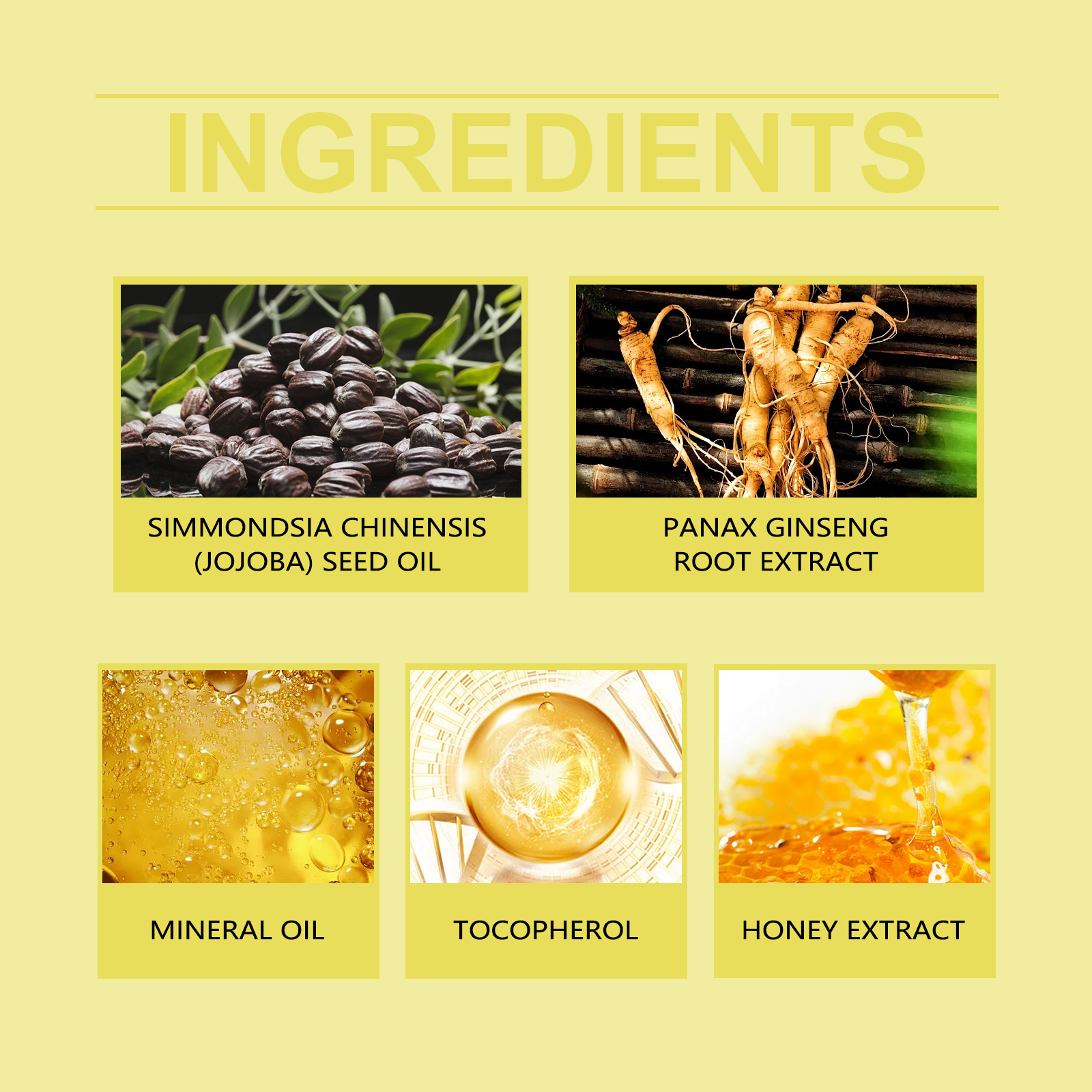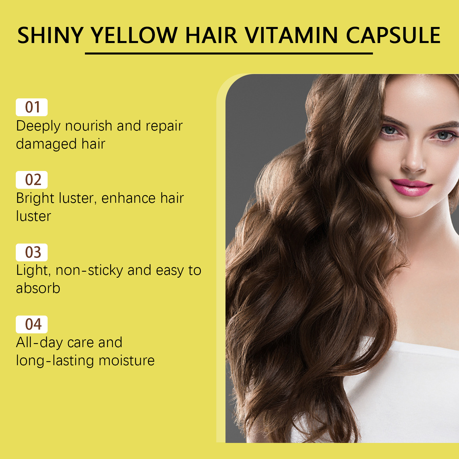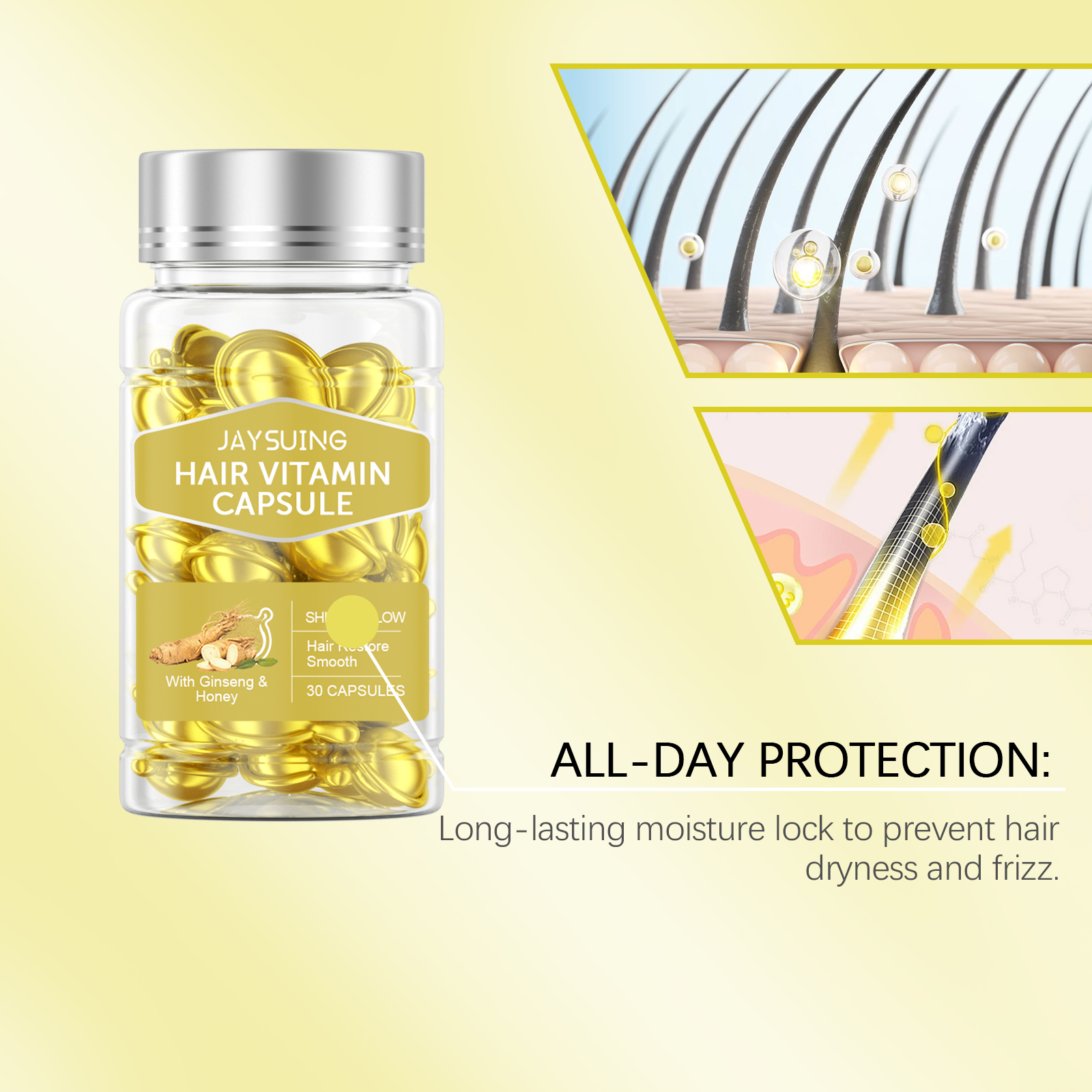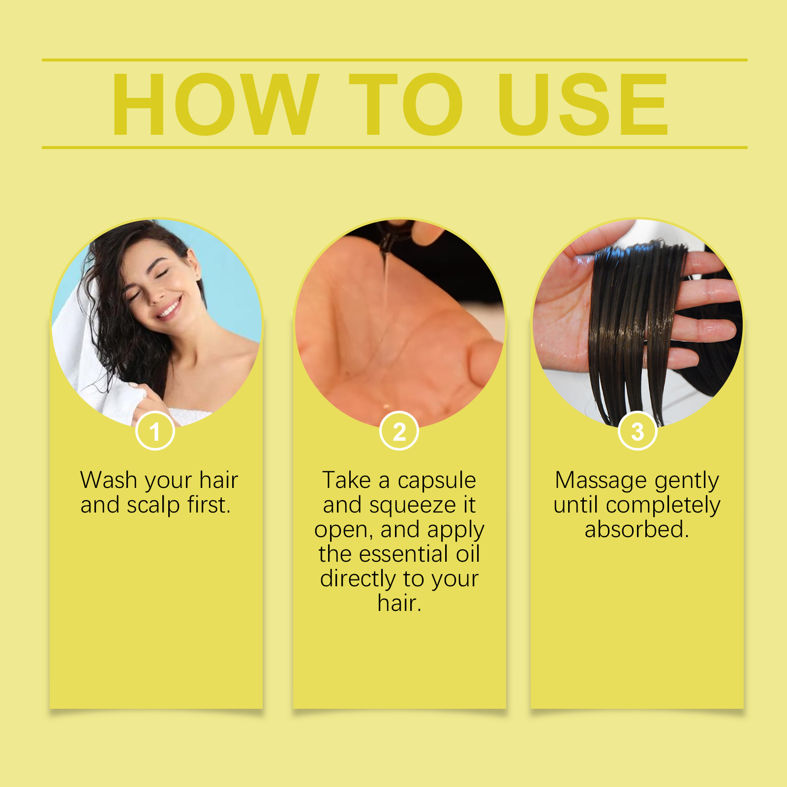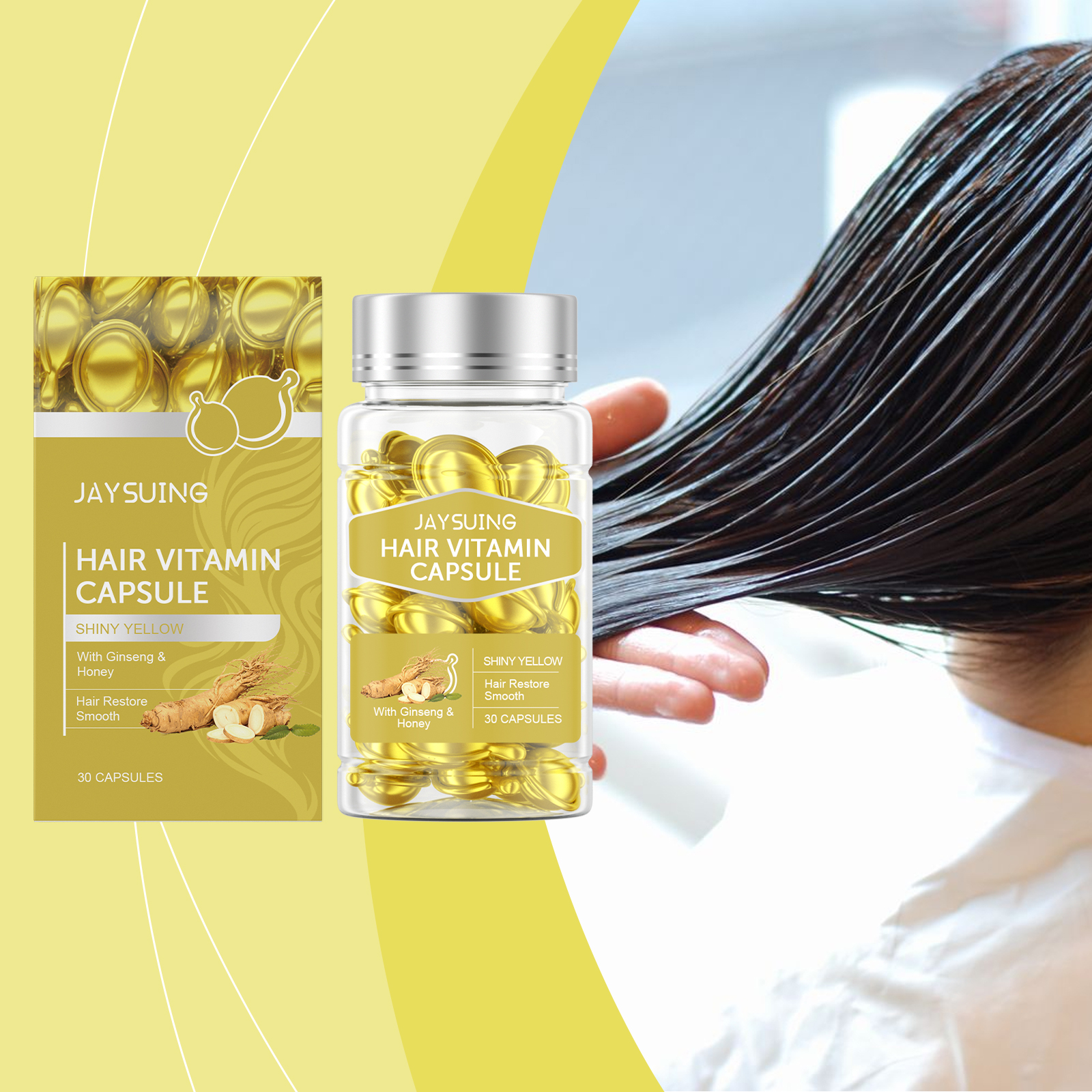 我们的秀发精油护理胶囊(黄色),由人参根提取物、蜂蜜提取物精心调配而成。专为深层滋养发质,修复受损发质设计。使用方法极为便捷:1.先洗头发和头皮。2.取一个胶囊,把它挤开,把精油直接涂在头发上。3.轻轻按摩直至完全吸收。并且可以锁住头发水分,防止头发干燥和卷曲,使头发光滑有光泽。