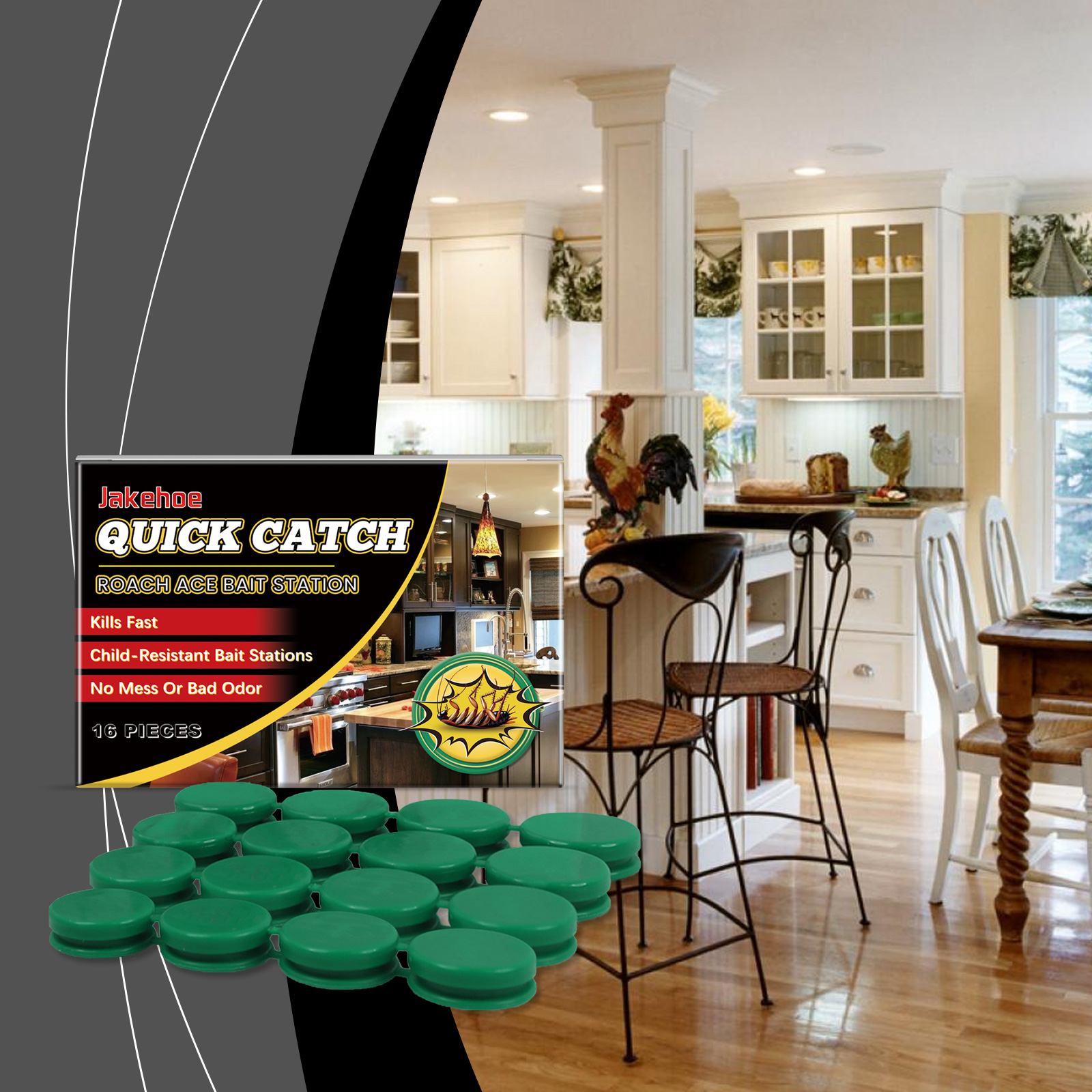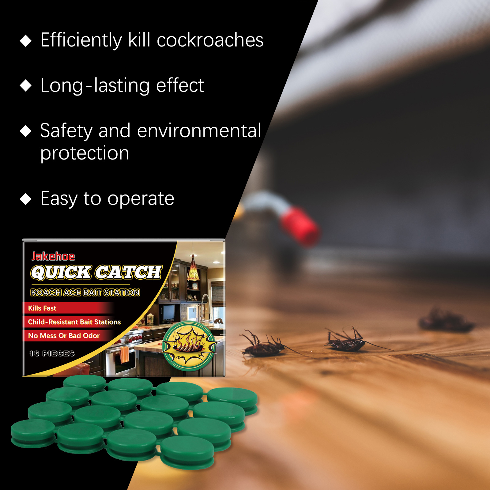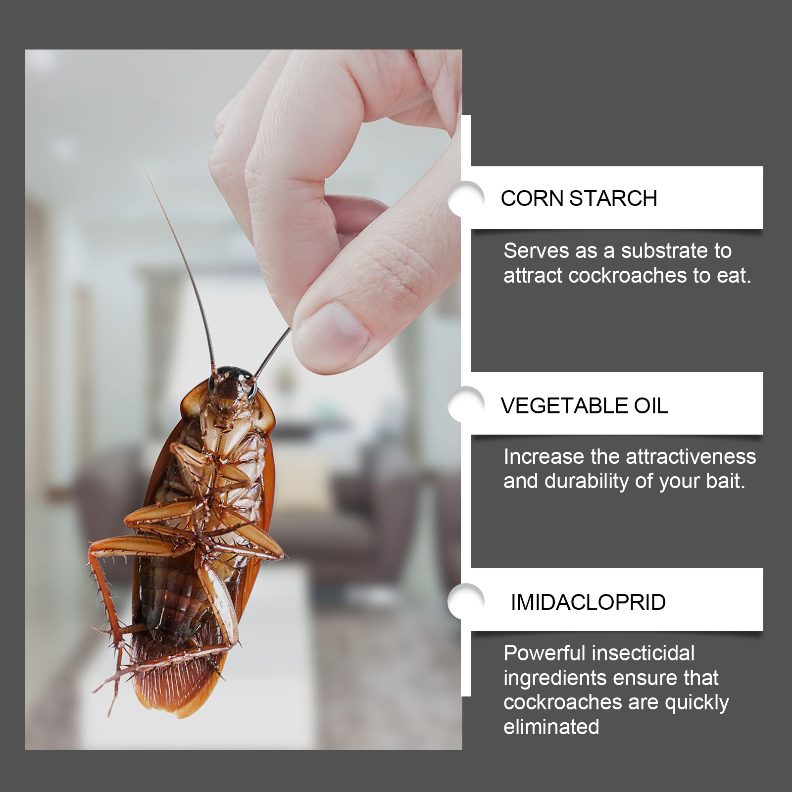 我们的蟑螂捕捉器含有玉米淀粉、植物油、葡萄糖。它可以快速杀死蟑螂,不留任何残留。它的使用方法很简单:打开包装,取出一块诱饵,用一块双面胶带把它粘在底部,固定在蟑螂经常出没的地方。作为吸引蟑螂吃的基质;增加诱饵的吸引力和耐久性。强大的杀虫剂成分确保蟑螂被迅速消灭。