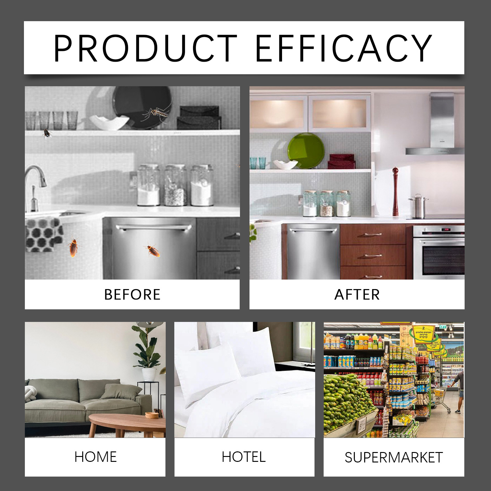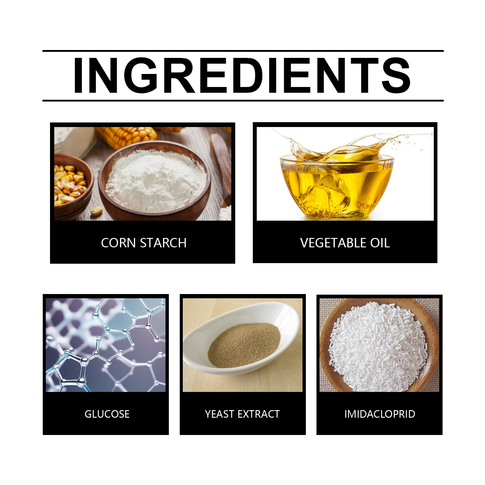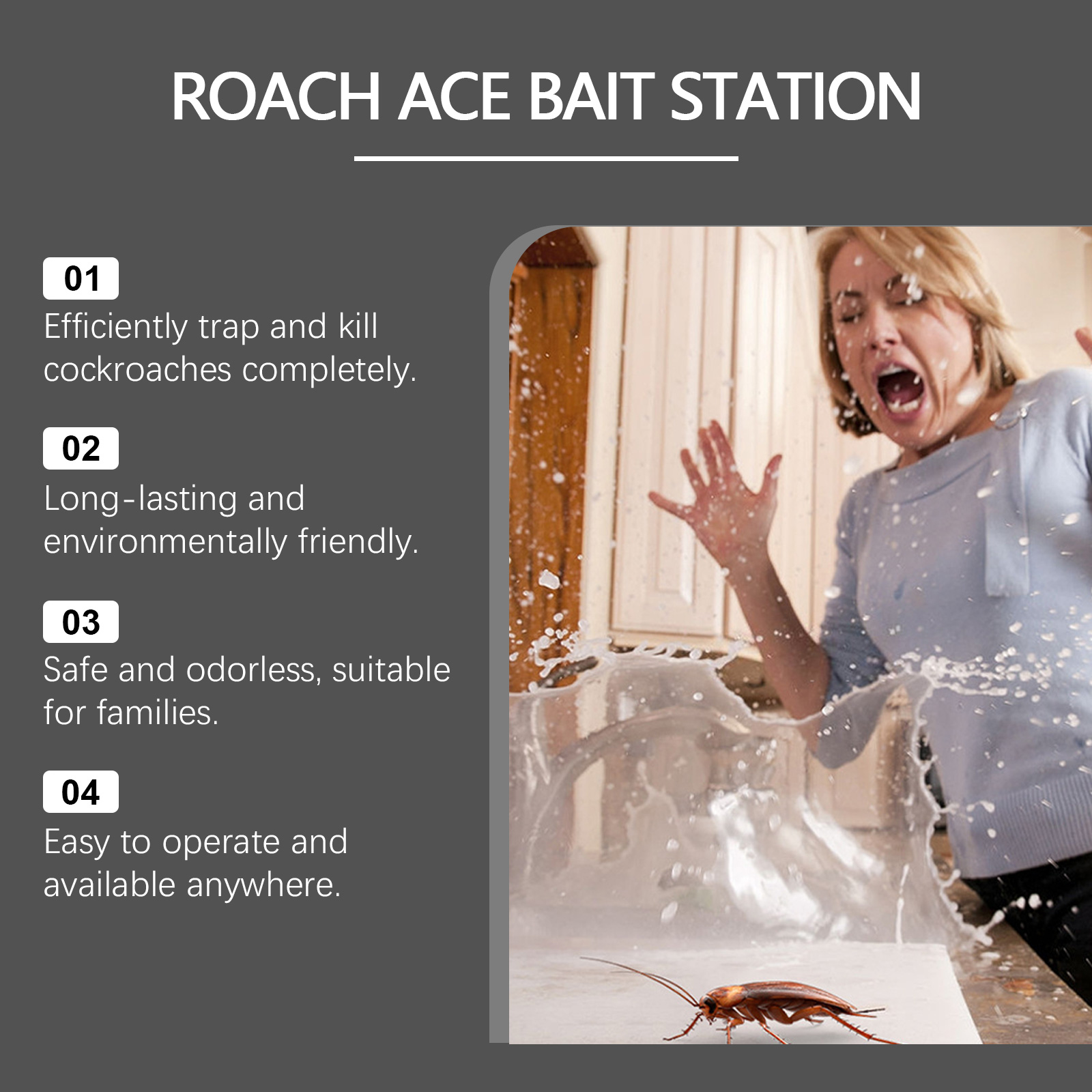 我们的蟑螂捕捉器含有玉米淀粉、植物油、葡萄糖。它可以快速杀死蟑螂,不留任何残留。它的使用方法很简单:打开包装,取出一块诱饵,用一块双面胶带把它粘在底部,固定在蟑螂经常出没的地方。作为吸引蟑螂吃的基质;增加诱饵的吸引力和耐久性。强大的杀虫剂成分确保蟑螂被迅速消灭。
