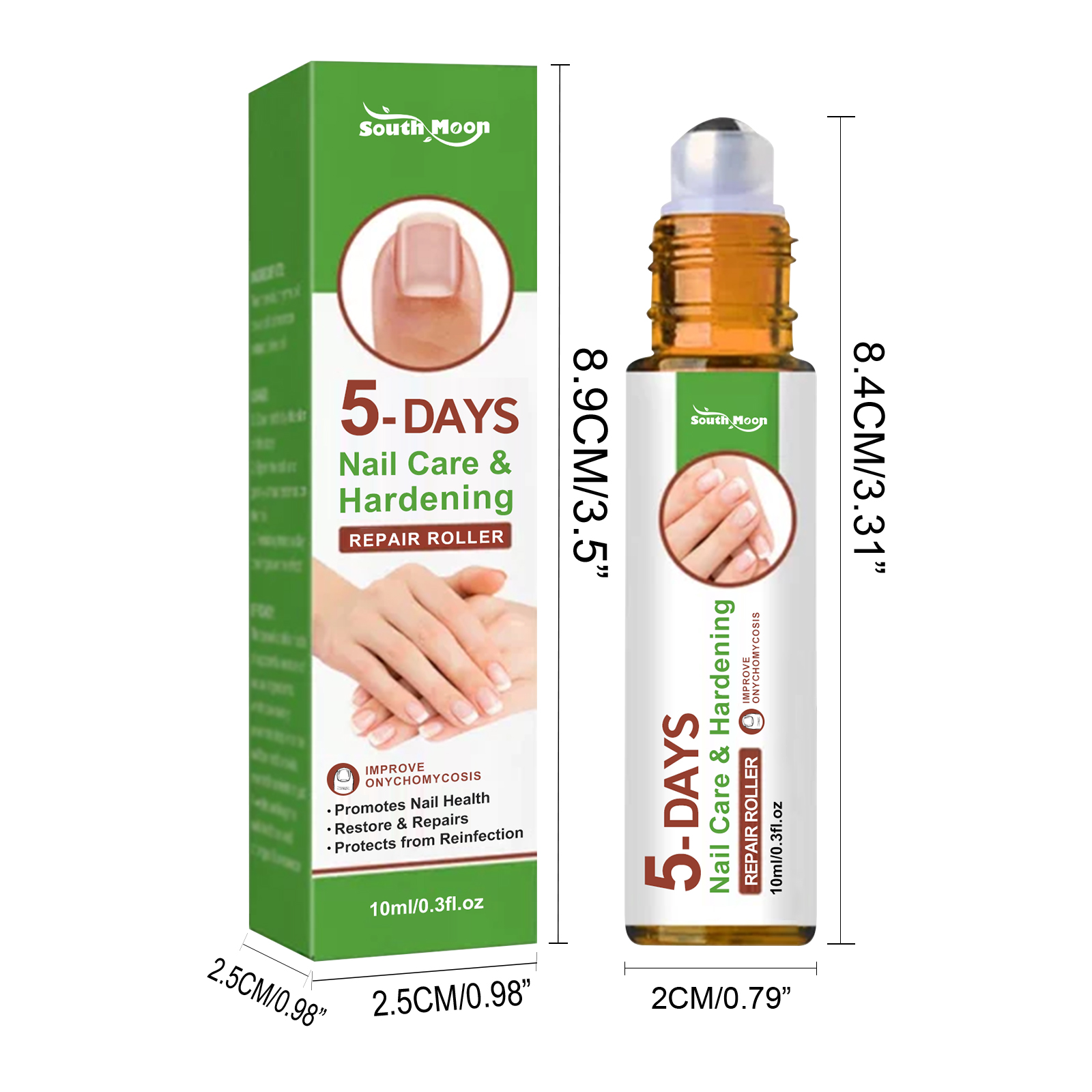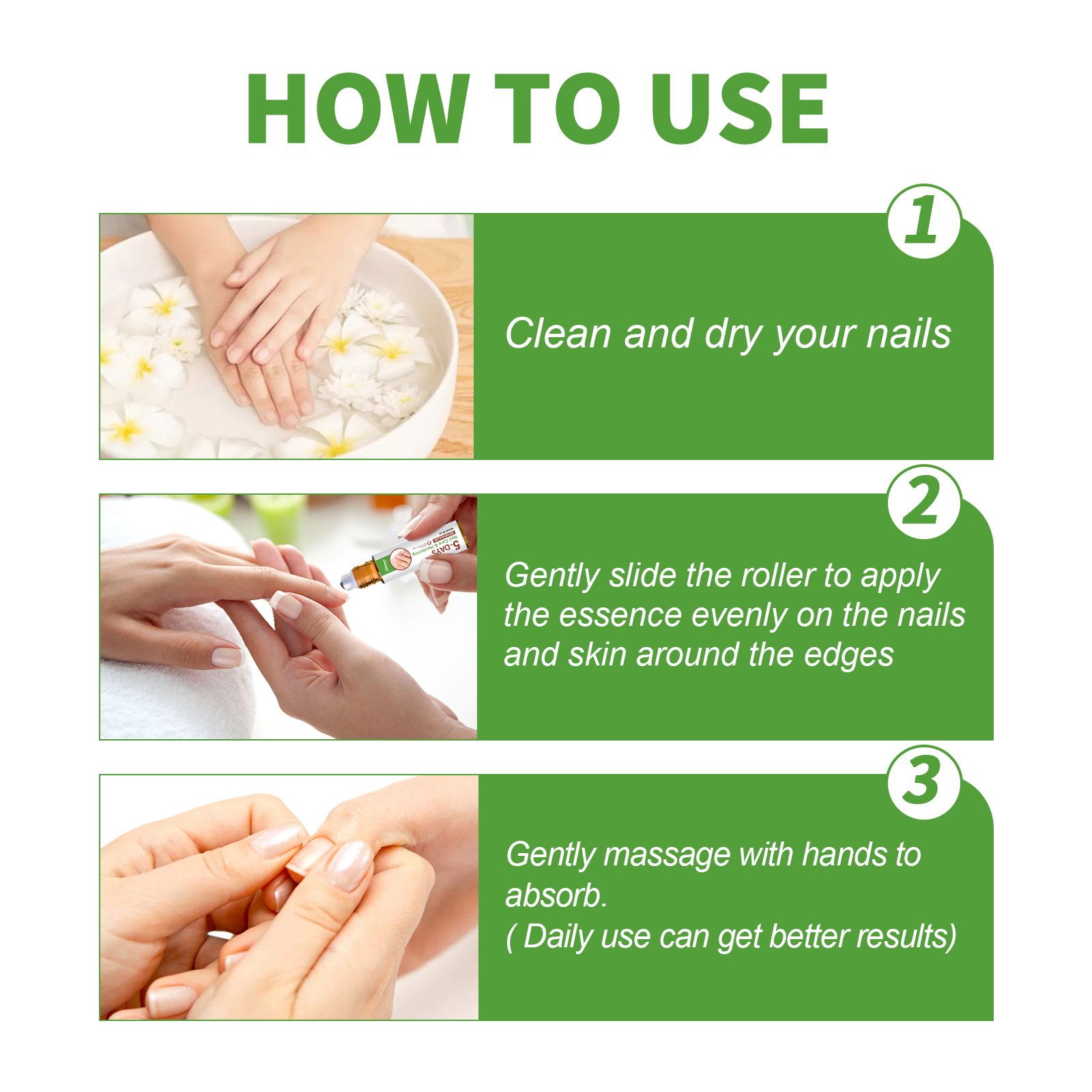 我们的5天指甲护理滚轮含有甘油、乙酸。它可以强化指甲,深层保湿,滋养角质层,帮助消除影响指甲的真菌,促进生长。它的使用方法很简单:清洁和擦干指甲,轻轻滑动滚轮,将产品均匀涂抹在指甲和边缘的皮肤上,用手轻轻按摩吸收即可。日常使用可以获得更好的效果,可以加强和调理指甲,使指甲和脚趾甲快速健康生长。