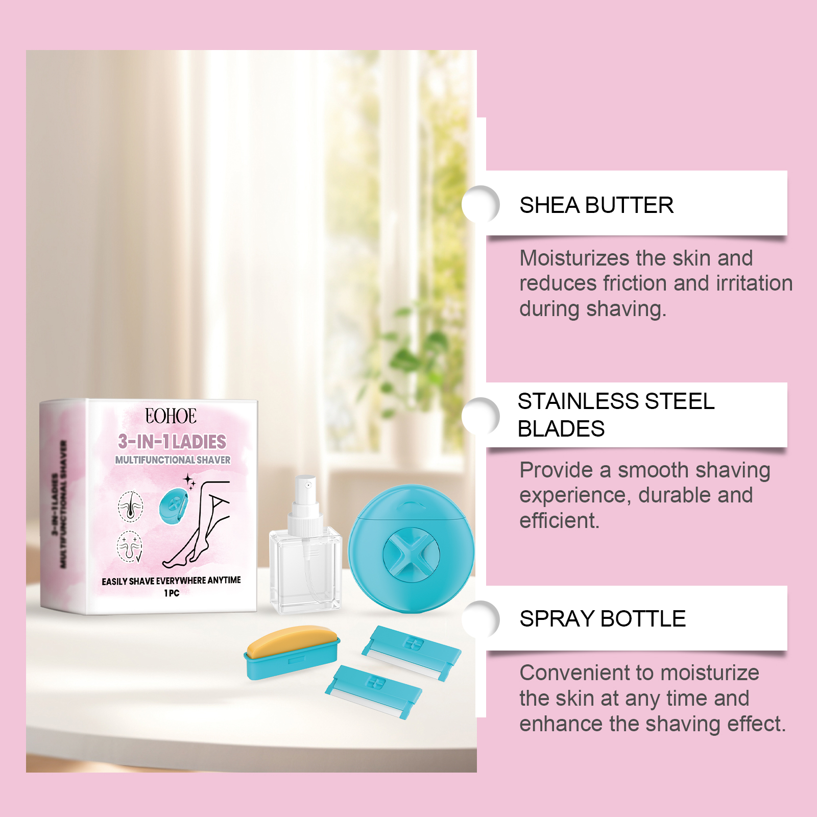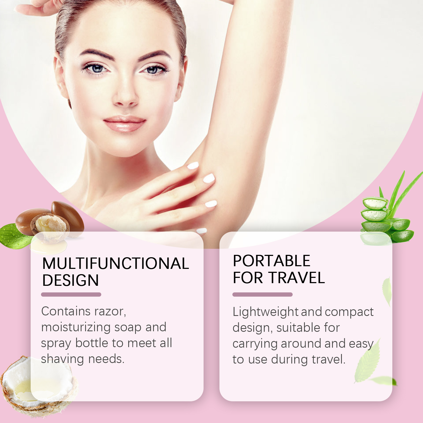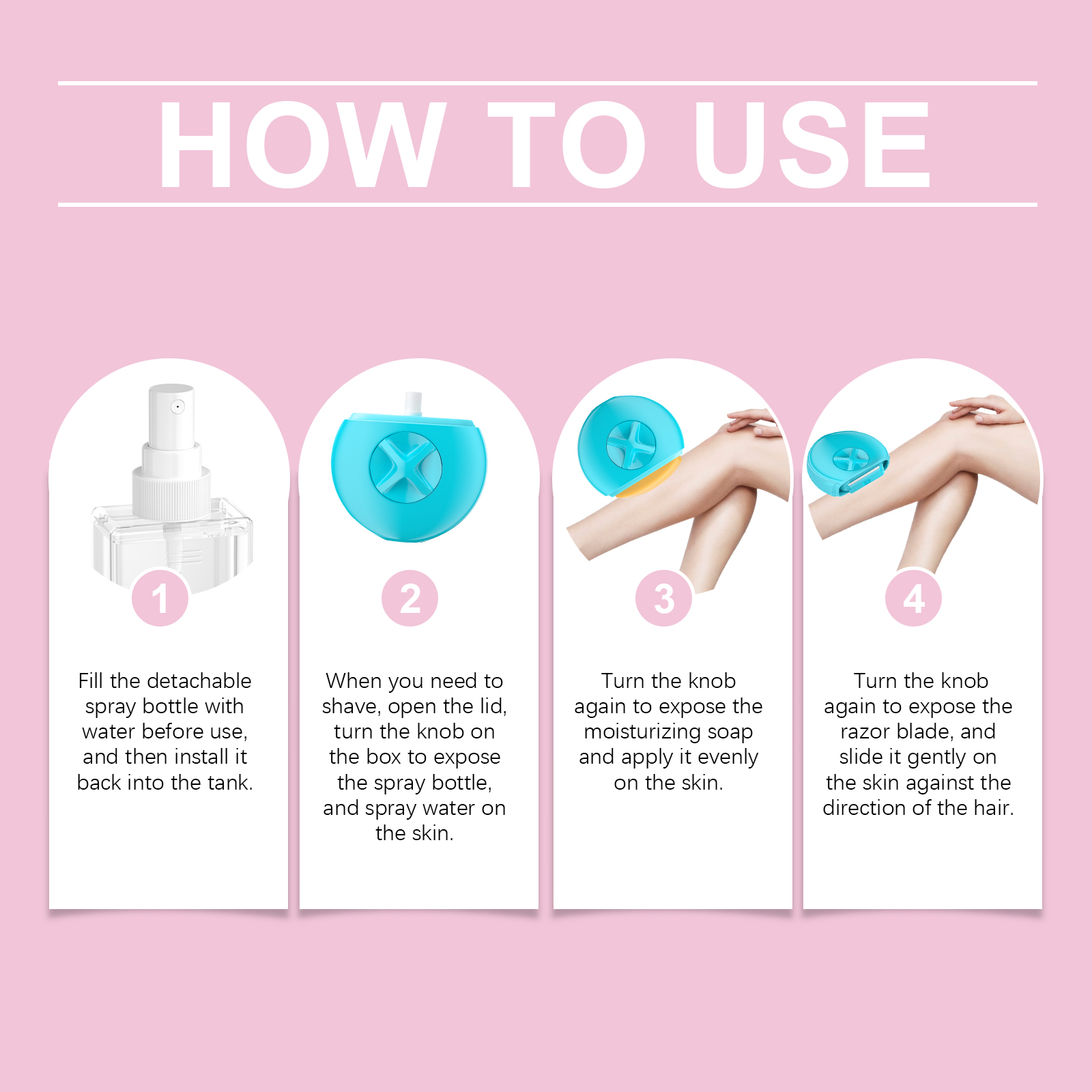 我们的三合一女士剃毛刀含有乳木果油、椰子油、可可脂。它可以滋润皮肤,减少剃须时的摩擦和刺激。提供平滑的剃须体验,持久高效。方便随时滋润肌肤,增强剃须效果。它的使用方法很简单:1.使用前将可拆卸喷雾瓶注满水,然后将其装回水箱中。2.当你需要的时候,打开盖子,转动盒子上的旋钮,露出喷雾瓶,在皮肤上喷洒水。3.再次转动旋钮,露出保湿皂,均匀涂抹在皮肤上。4.再次转动旋钮露出剃刀刀片,沿着毛发生长的方向轻轻地将刀片在皮肤上滑动。包含剃刀,保湿皂和喷雾瓶,满足所有剃须需求。轻巧紧凑的设计,适合随身携带,方便旅行使用。