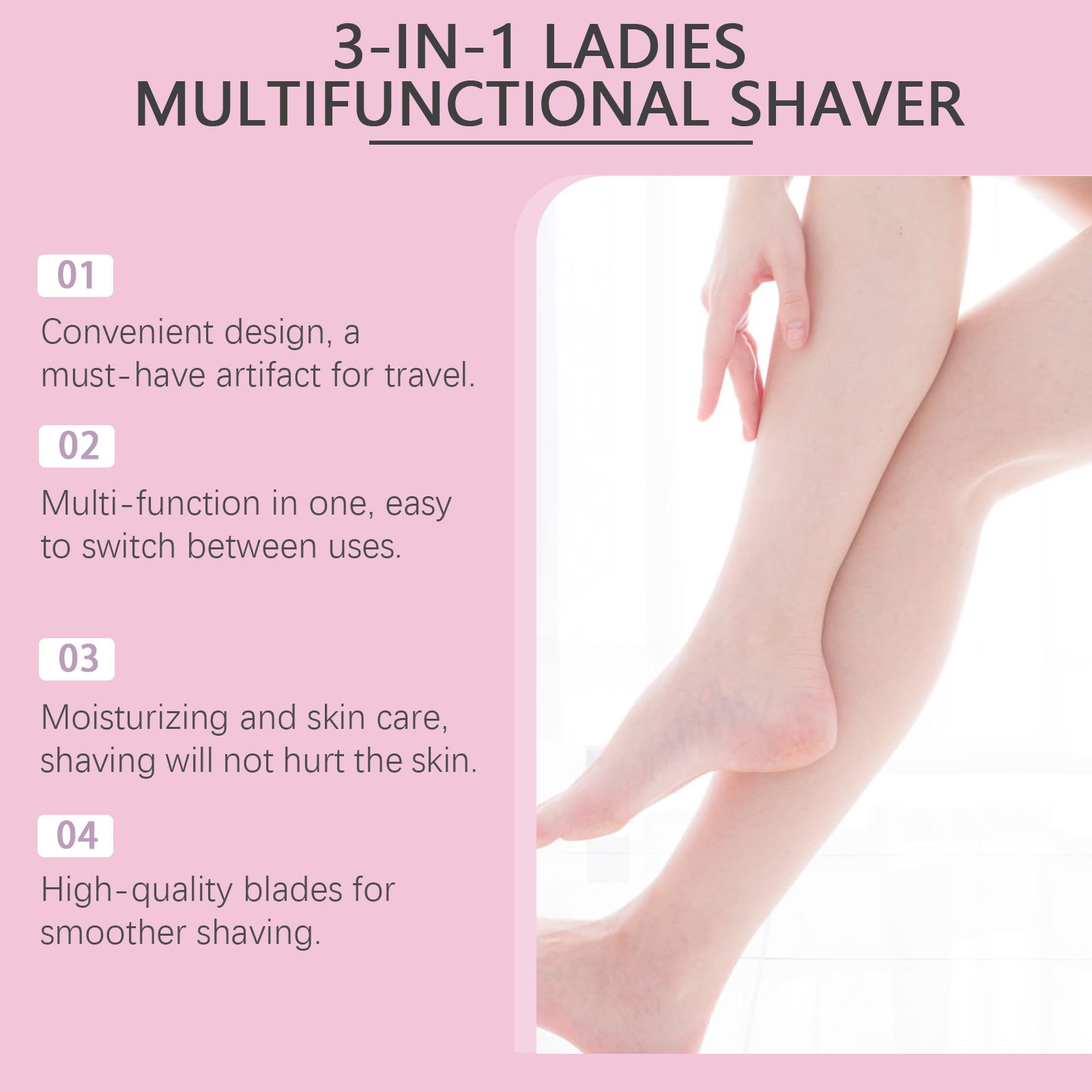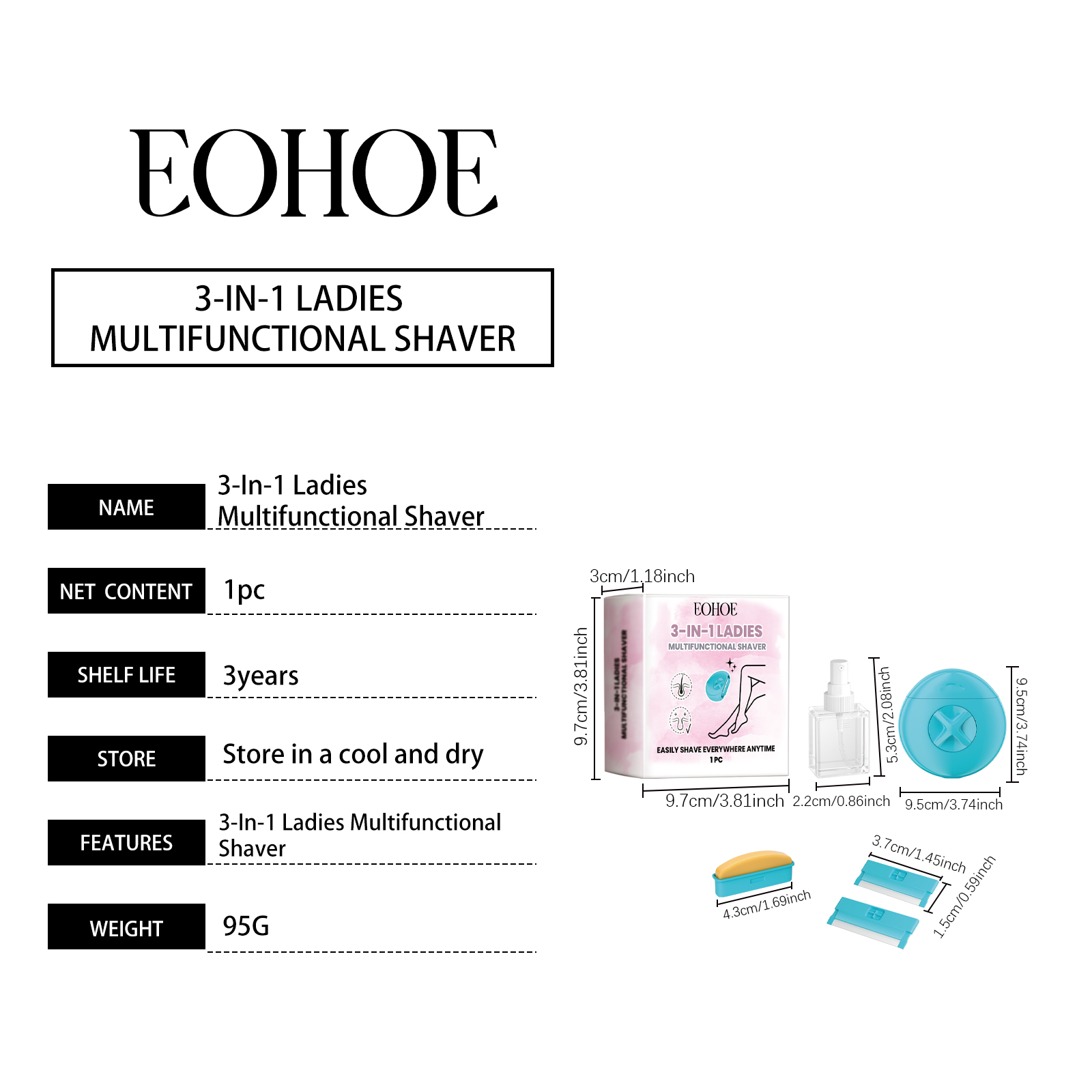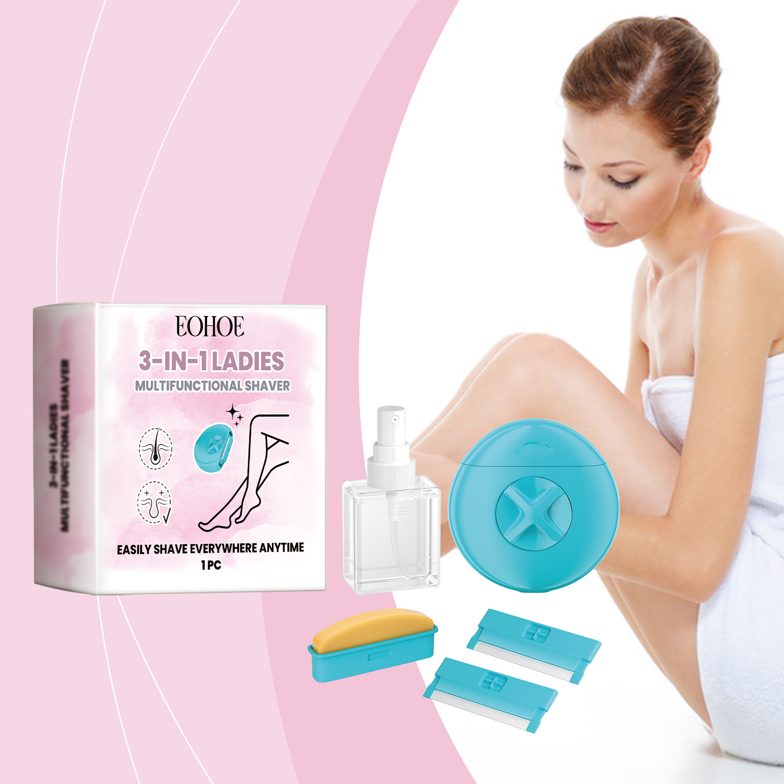 我们的三合一女士剃毛刀含有乳木果油、椰子油、可可脂。它可以滋润皮肤,减少剃须时的摩擦和刺激。提供平滑的剃须体验,持久高效。方便随时滋润肌肤,增强剃须效果。它的使用方法很简单:1.使用前将可拆卸喷雾瓶注满水,然后将其装回水箱中。2.当你需要的时候,打开盖子,转动盒子上的旋钮,露出喷雾瓶,在皮肤上喷洒水。3.再次转动旋钮,露出保湿皂,均匀涂抹在皮肤上。4.再次转动旋钮露出剃刀刀片,沿着毛发生长的方向轻轻地将刀片在皮肤上滑动。包含剃刀,保湿皂和喷雾瓶,满足所有剃须需求。轻巧紧凑的设计,适合随身携带,方便旅行使用。