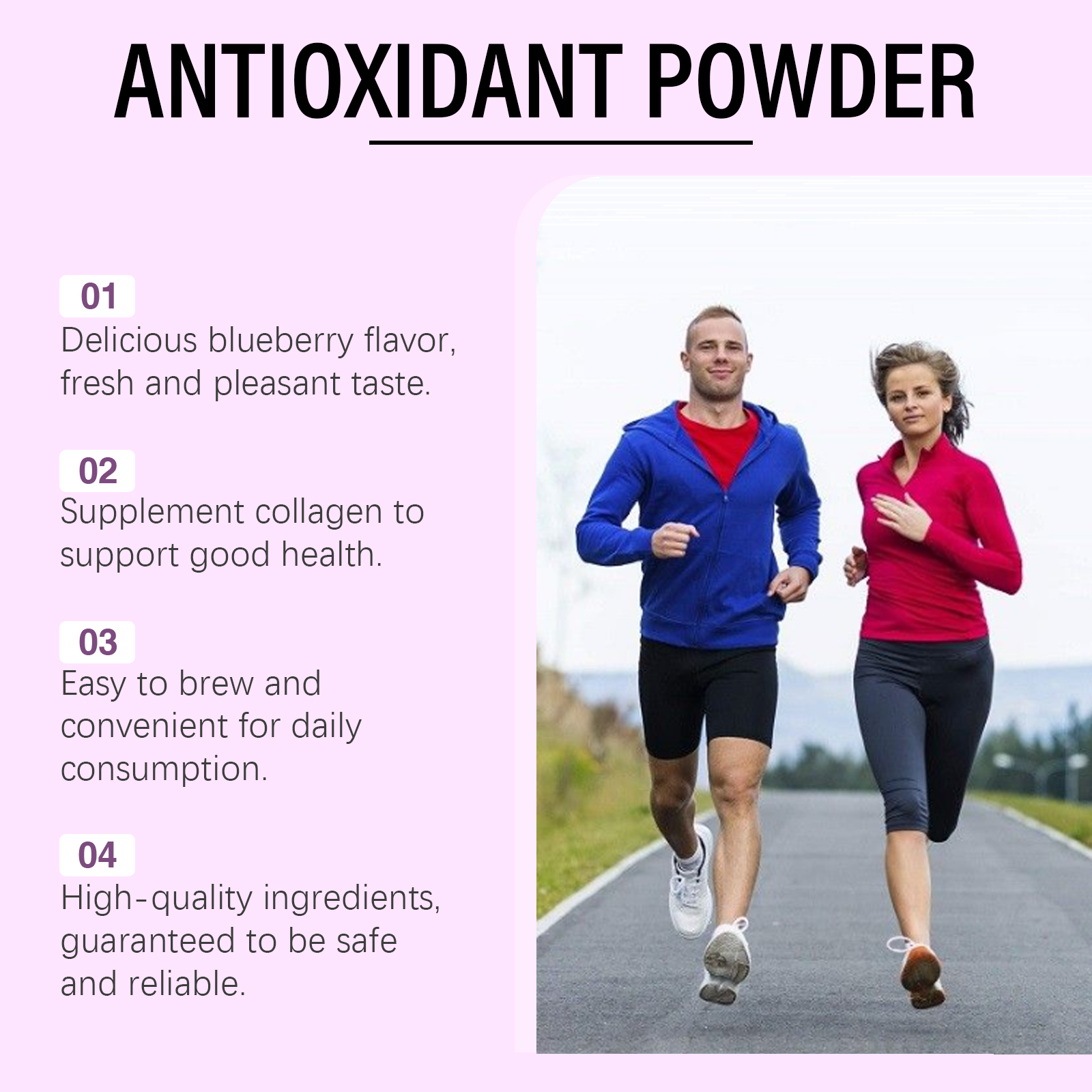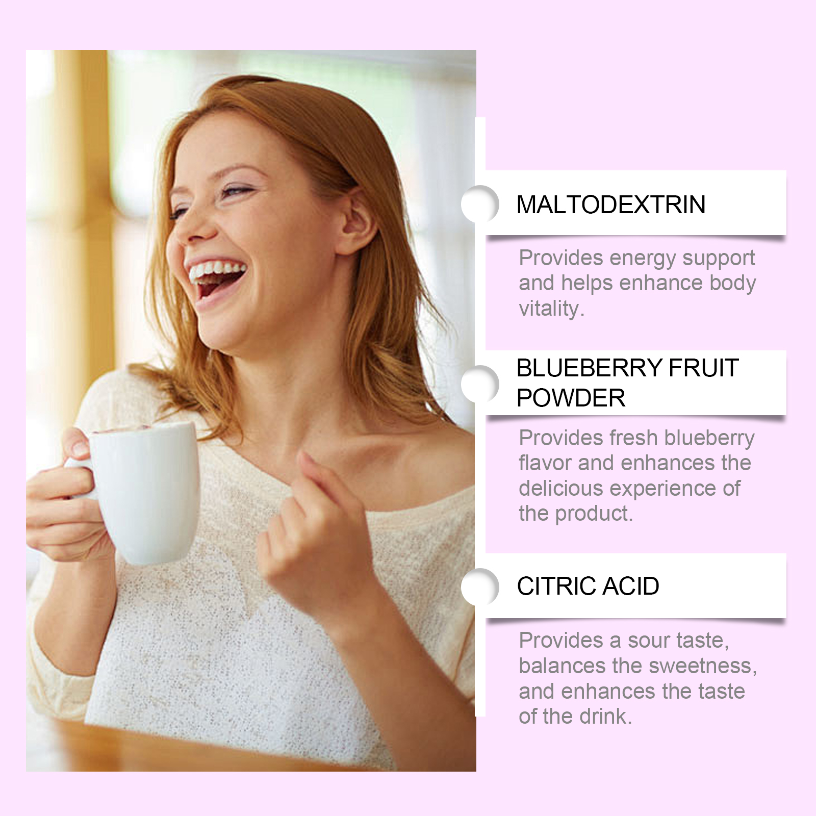 我们的抗氧化剂粉末含有麦芽糊精、葡萄糖、蓝莓果粉。它可以提供能量支持,帮助增强身体活力。提供新鲜的蓝莓风味,增强产品的美味体验。它的使用方法很简单:1.将本品装入容器;2.加入80℃以上的热水;3.由内到外搅拌均匀。含有胶原肽,帮助补充身体的需要和保持活力。蓝莓果粉的加入,带来清新的果香,丰富了口感体验。
