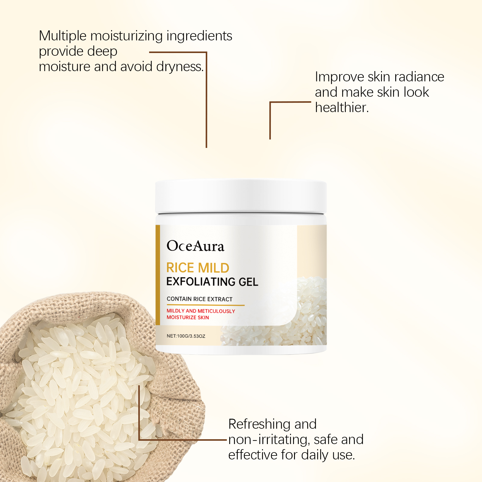 我们的大米面部清洁凝胶含有大米提取物、透明质酸钠、甜菜碱。它可以温和去角质,令肌肤光滑细腻;锁住水分,改善皮肤水分。舒缓和滋养皮肤,改善皮肤屏障。它的使用方法很简单:1. 取适量凝胶均匀涂抹于面部、肘部、膝盖等待治皮肤。2. 轻轻按摩皮肤,促进角质层脱落。3. 用温水冲洗干净。大米提取物有助于温和去除皮肤表面的老死皮细胞。透明质酸钠锁住肌肤水分,持久保持肌肤水分。