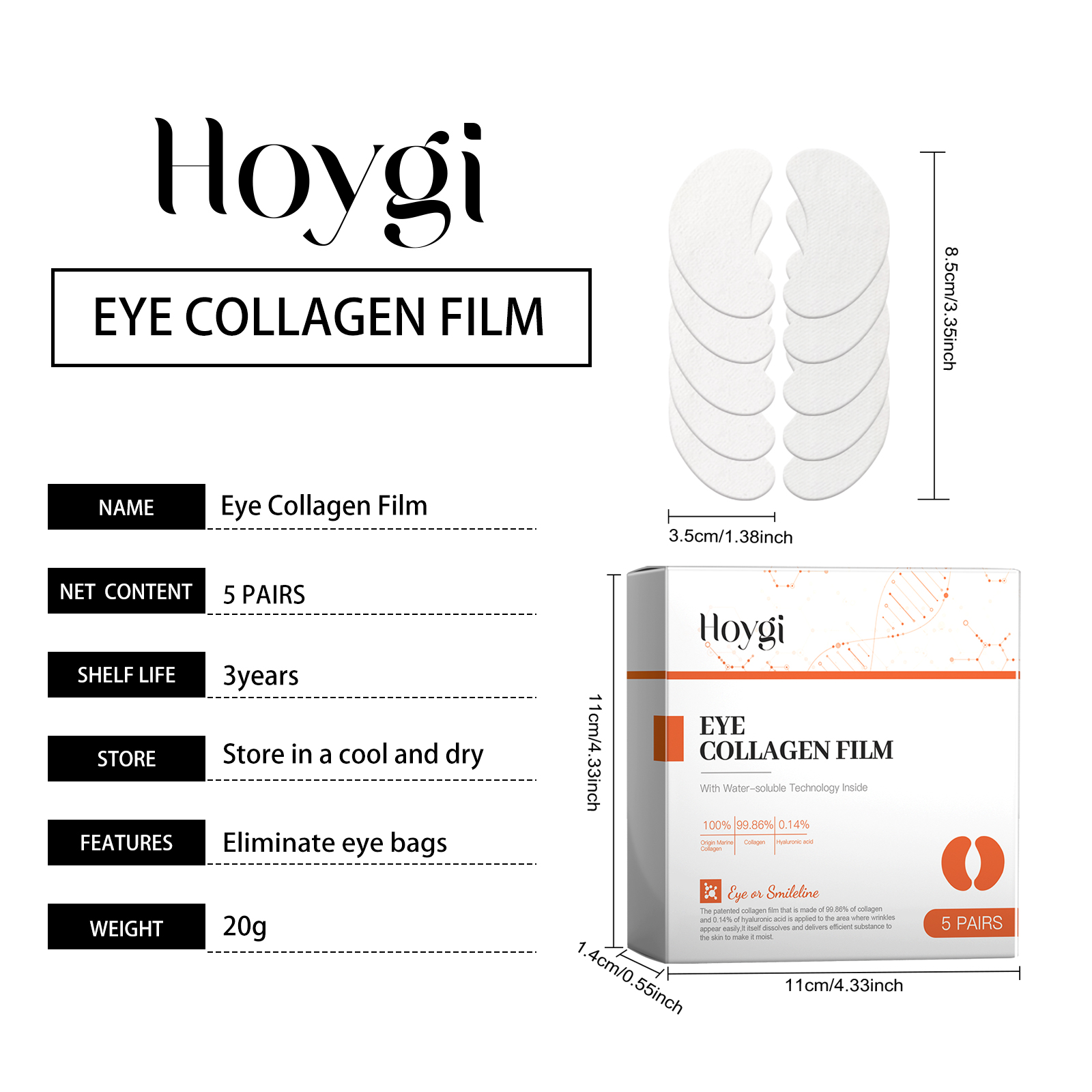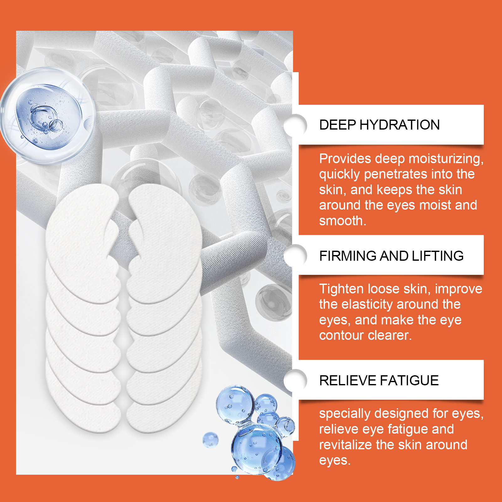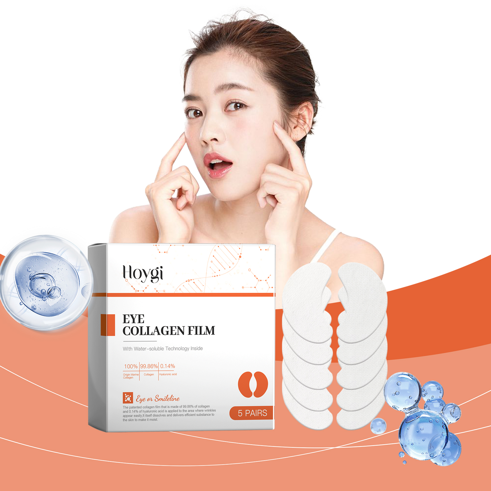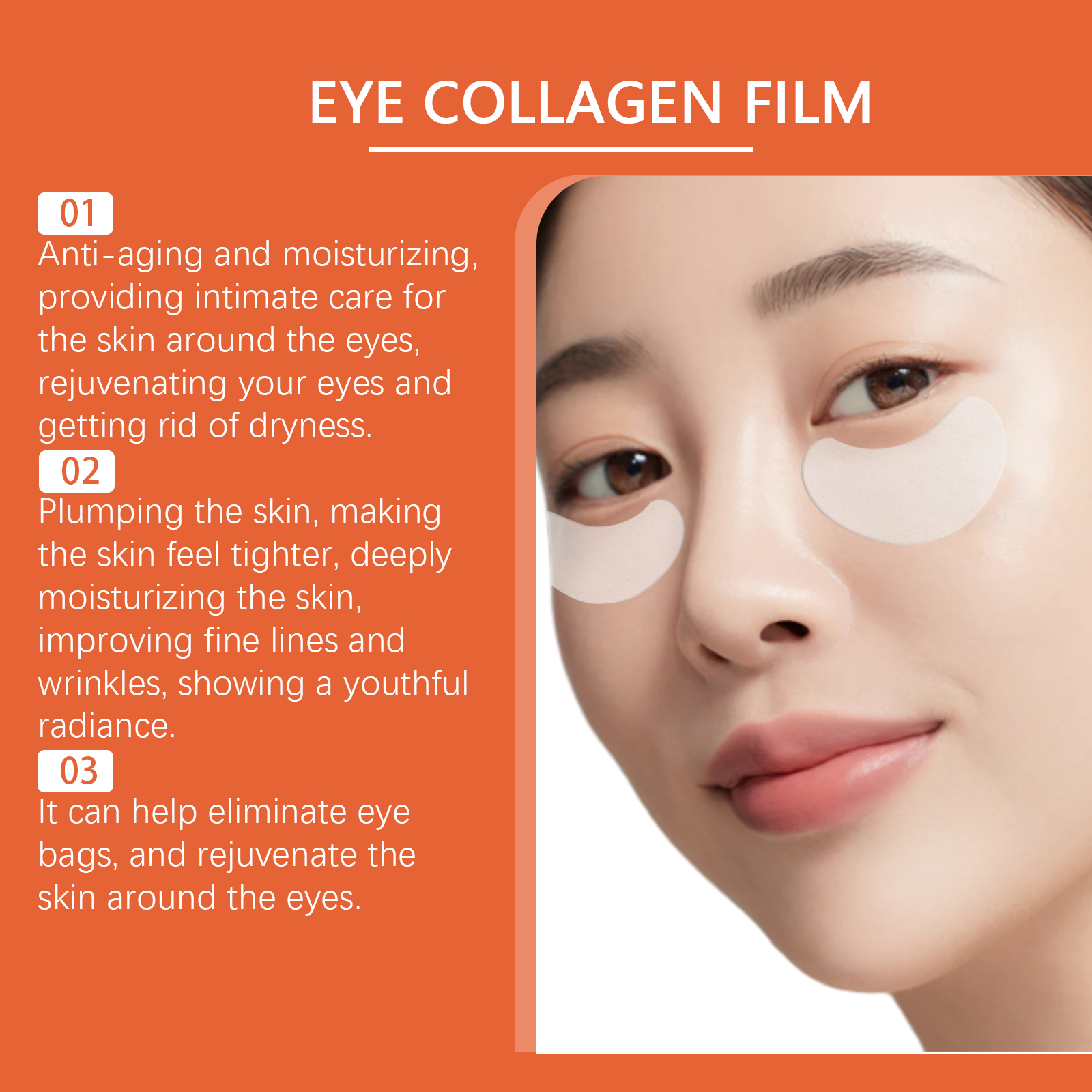 我们的水解胶原蛋白贴片(眼部)含有胶原、透明质酸。它可以修复细纹和皱纹,促进胶原蛋白生成,焕发青春光彩。持久保湿效果,使眼周肌肤全天保持滋润。它的使用方法很简单:1.清洁并擦干皮肤;2.取出面膜,将其敷于眼部周围肌肤上,然后在面膜上喷洒适量的胶原蛋白喷雾;3.待面膜完全融化后,用手指以圆周运动的方式轻轻按摩脸部,直至其被完全吸收。每日使用,持续改善眼周肌肤状况,效果持久。帮助修复受损皮肤,恢复皮肤光滑。