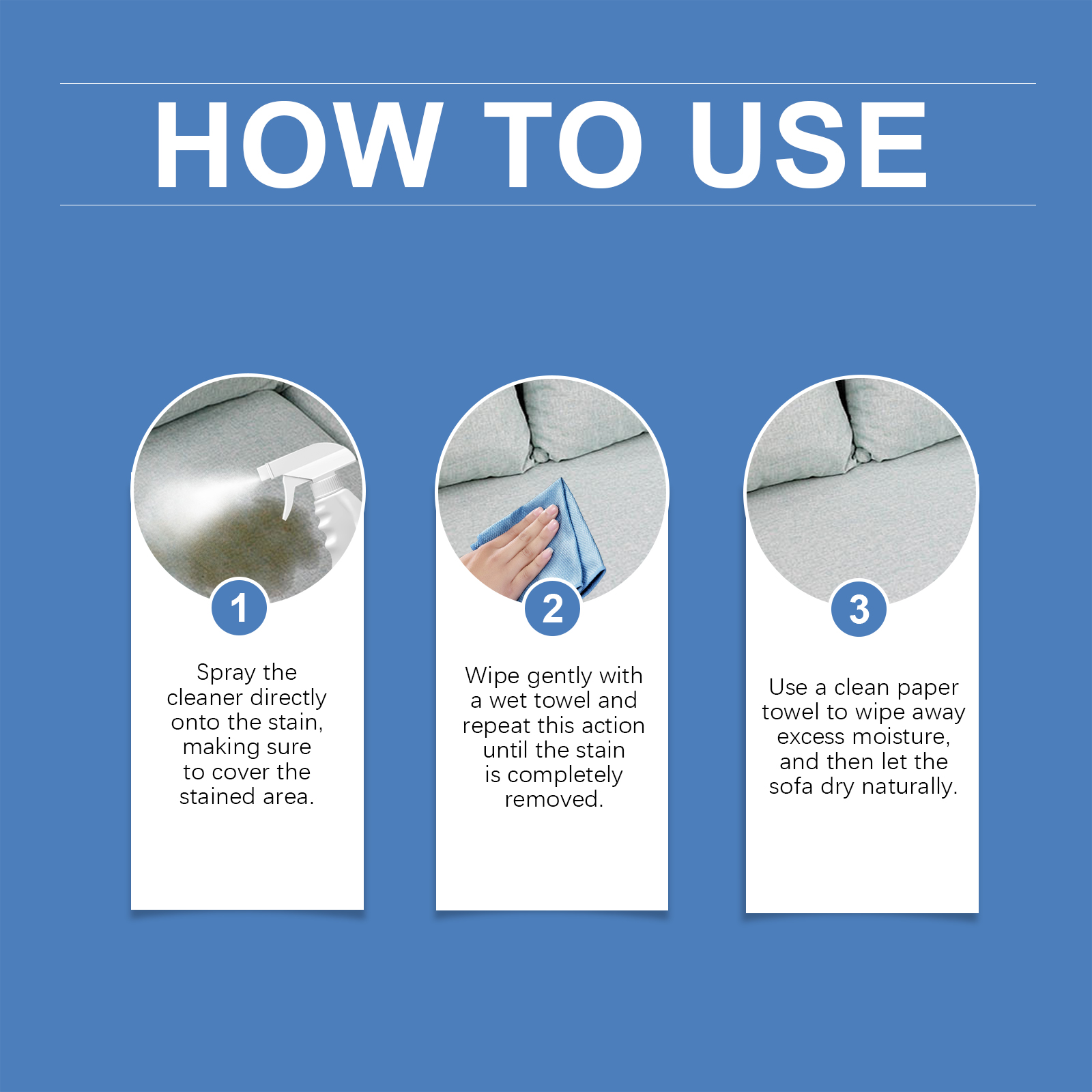 我们的布艺沙发清洁剂含有月桂醇聚醚硫酸酯钠、二丙二醇甲醚。它可以有效分解和去除顽固污渍,让布艺沙发看起来焕然一新。它的使用方法很简单:将清洁剂直接喷在污渍上,确保覆盖污渍区域。用湿毛巾轻轻擦拭,重复这个动作,直到污渍完全去除。用干净的纸巾擦去多余的湿气,然后让沙发自然晾干。并且可以强力渗透织物纤维,快速分解顽固的污渍。