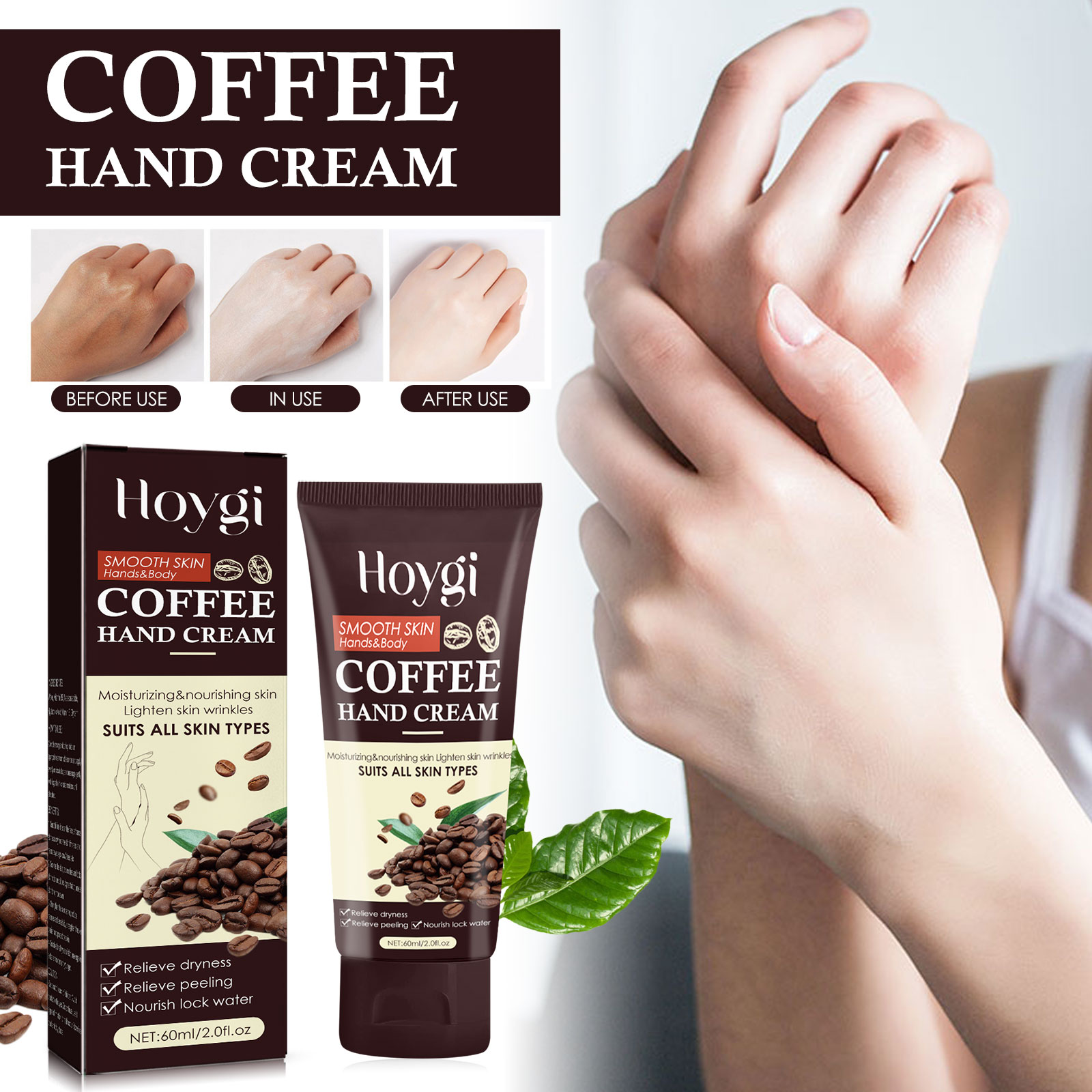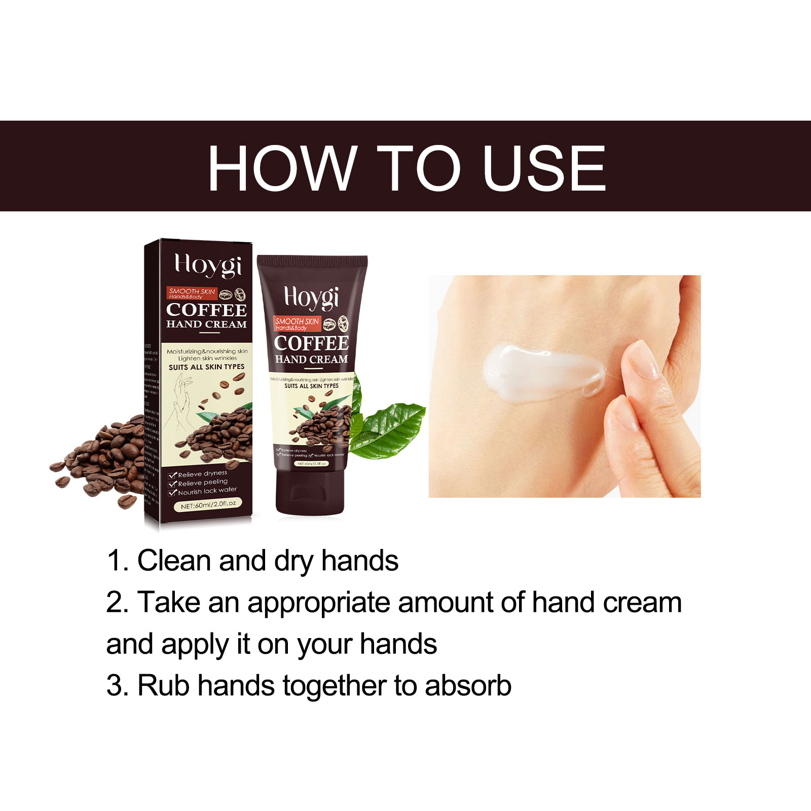 我们的咖啡护手霜含有咖啡油、葵花籽油、乳木果油。它可以有效改善暗沉肤色,让肌肤焕发光彩。添加烟酰胺可以减少毛孔,让你的皮肤看起来更光滑。它的使用方法很简单:1. 保持双手清洁且干燥;2. 取适量护手霜涂在手上;3. 双手揉搓吸收。补水成分,改善干燥肌肤,令肌肤水润饱满;成分温和,适合所有皮肤类型,包括敏感皮肤。