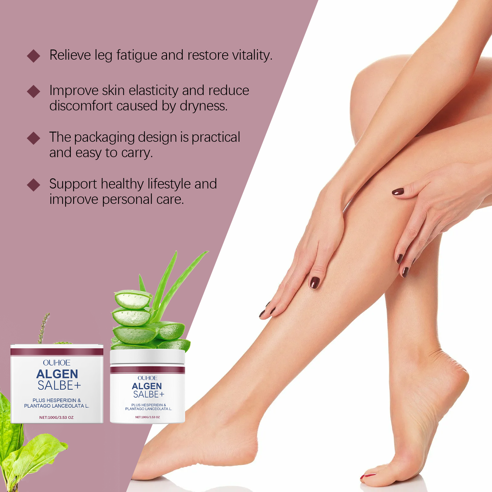 我们的腿部护理霜含有甘油、矿油、甘油硬脂酸酯。它可以改善皮肤外观,使皮肤看起来更健康。长时间保湿,帮助皮肤保持适当的水分平衡。它的使用方法很简单:清洁并擦干,取适量本产品,均匀涂抹在腿部皮肤上,轻轻按摩直至吸收。并且可以有效改善静脉张力,减少静脉曲张,使你的皮肤更有活力和弹性。
